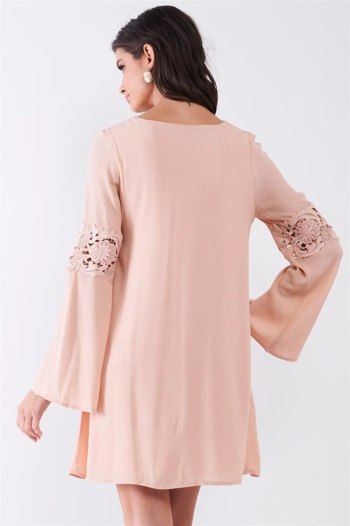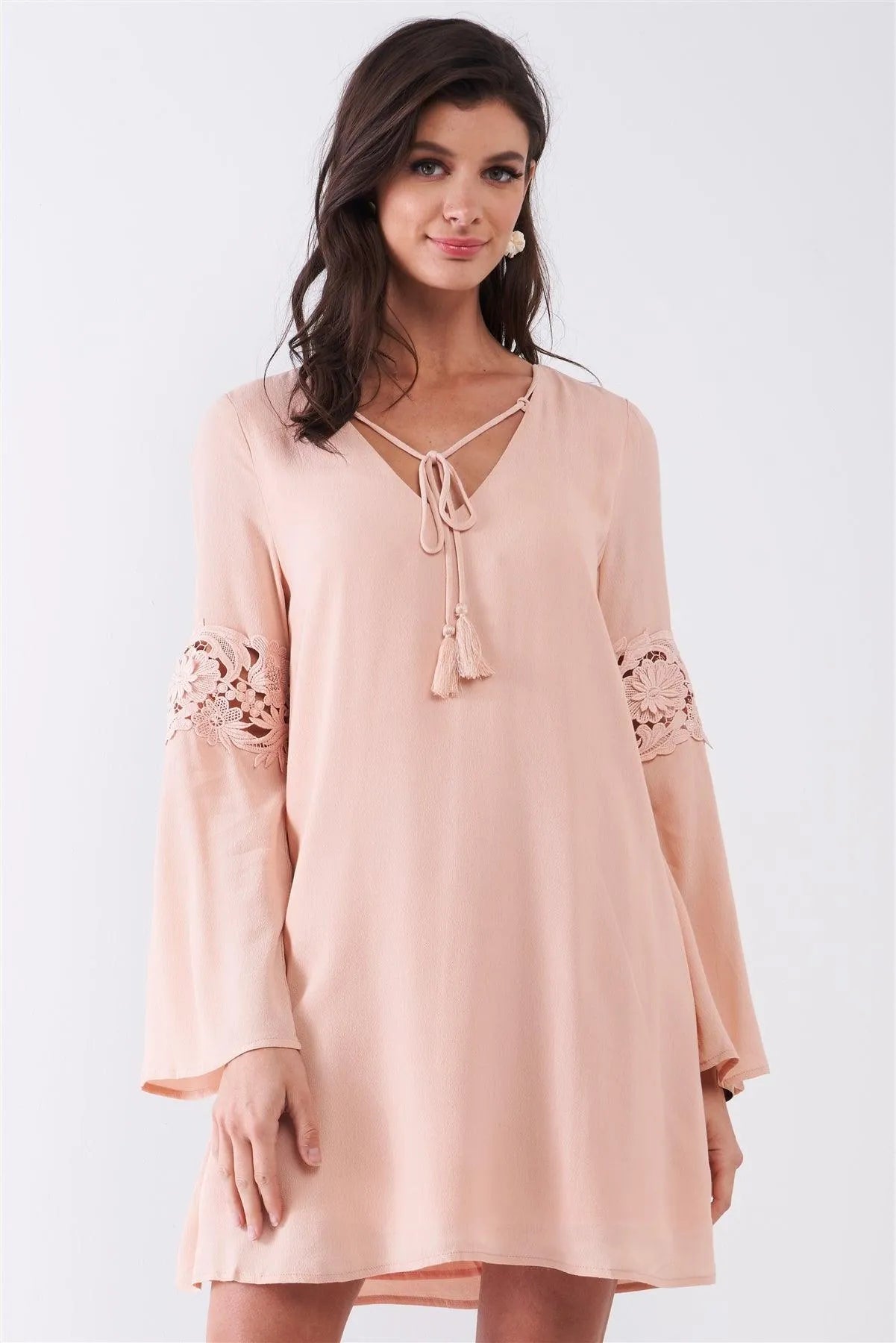 🖤Item Features: Light pink, long embroidered trim trumpet sleeve, tassel tip self-tie V-neckline, relaxed fit, lined, non-stretch, mini length, casual, cute, flirty, date look, spring/summer collection