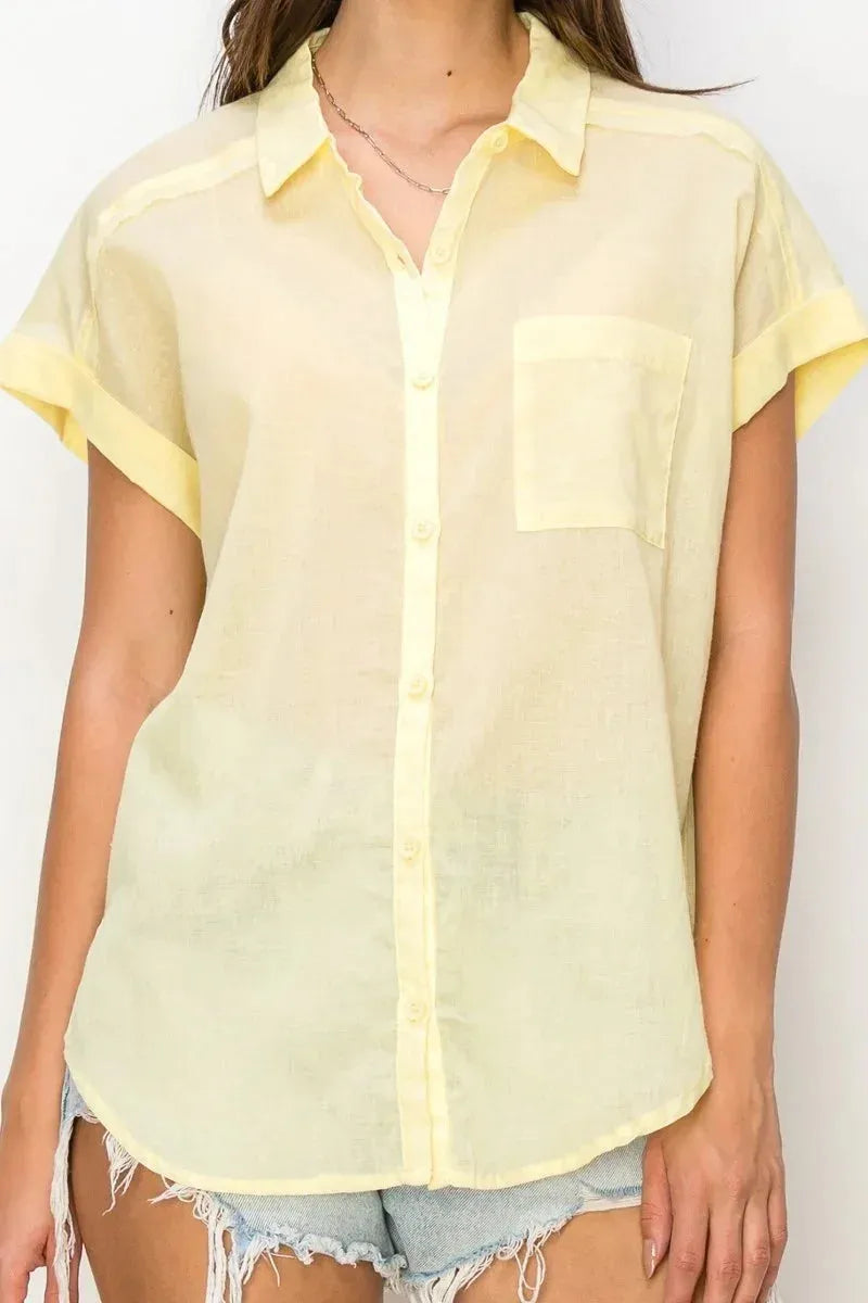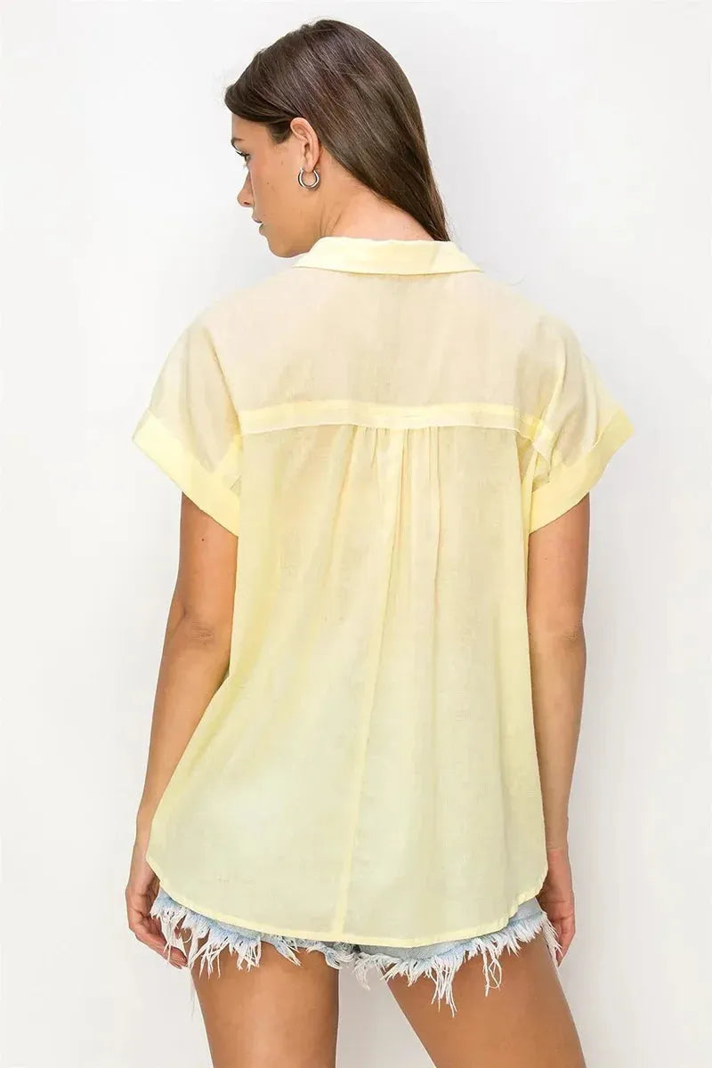 Refresh your boutique's collection with our versatile sheer button-down blouse available in soft butter yellow and crisp white. This effortlessly chic top features a relaxed silhouette, functional front pocket, and cuffed short sleeves that create the perfect balance of polished and casual style. The semi-transparent lightweight fabric offers beautiful drape and breathability, making it an essential layering piece for your fashion-forward customers.