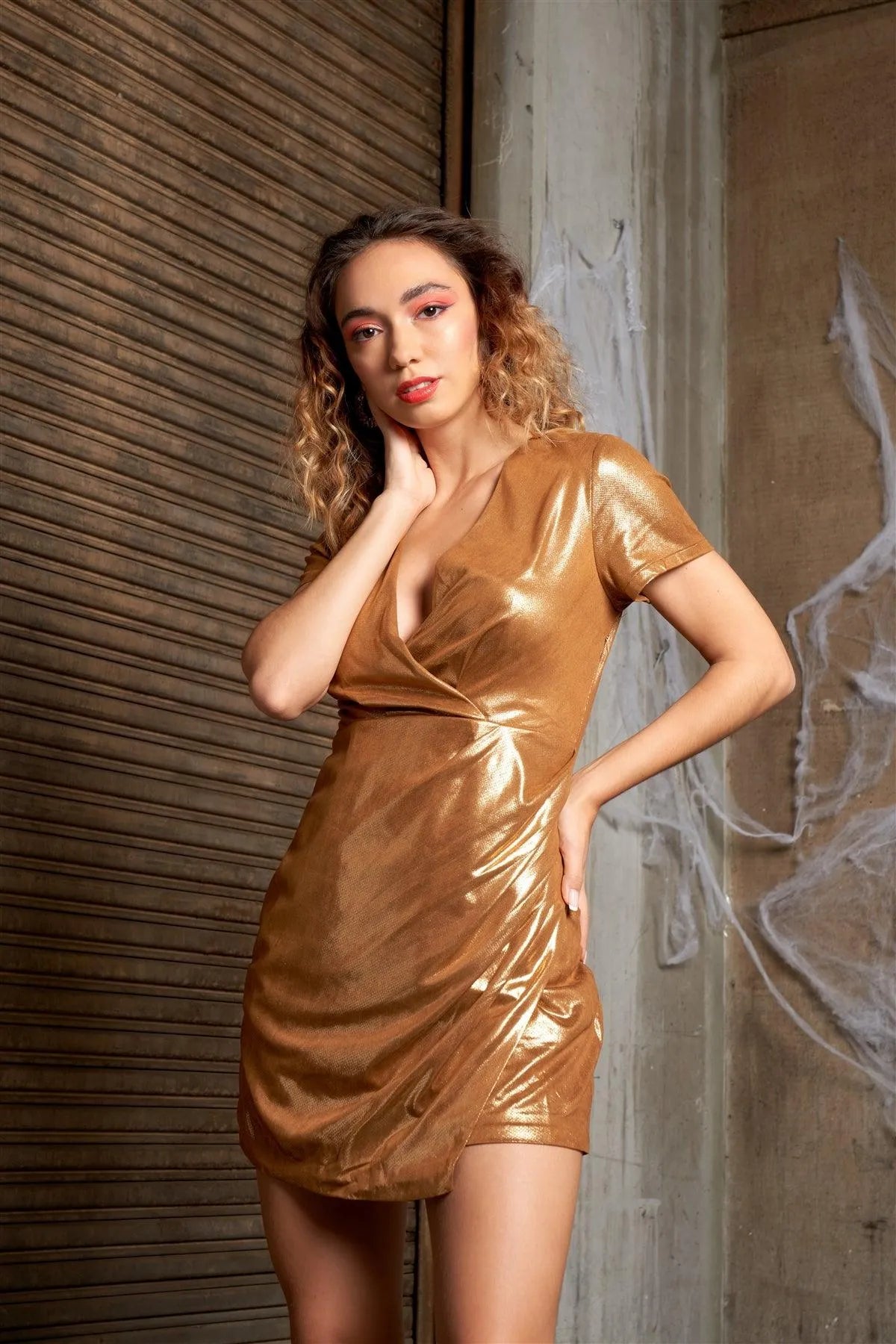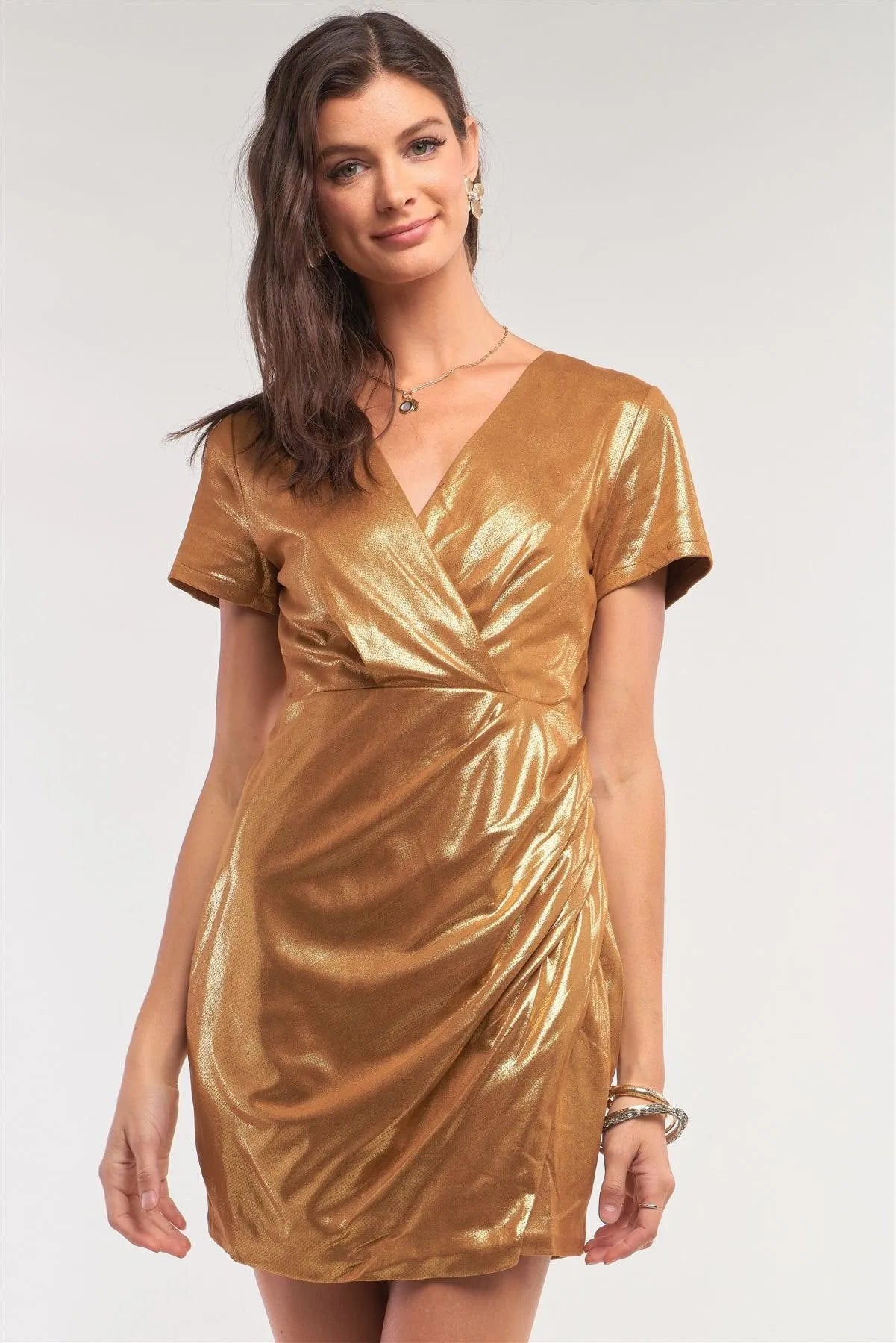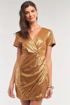 Liquid Gold Deep Plunge V-Neck Short Sleeve Wrap Gathered Side Detail Mini Dress /1-2-2-1