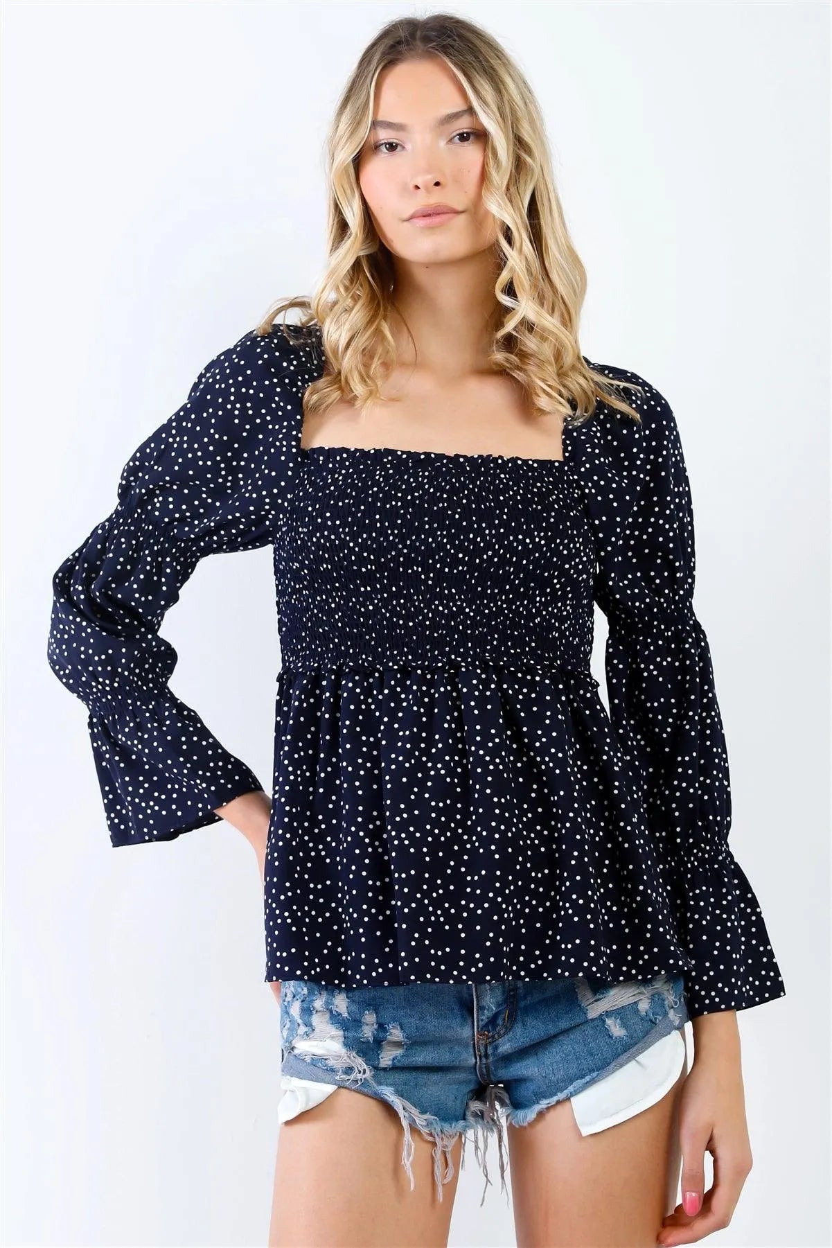 Navy Long Sleeve Polka Dot Smocked Peasant Top
