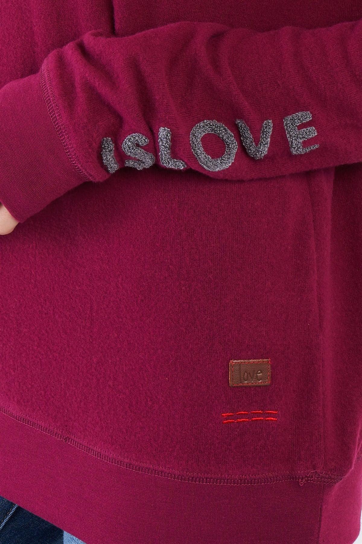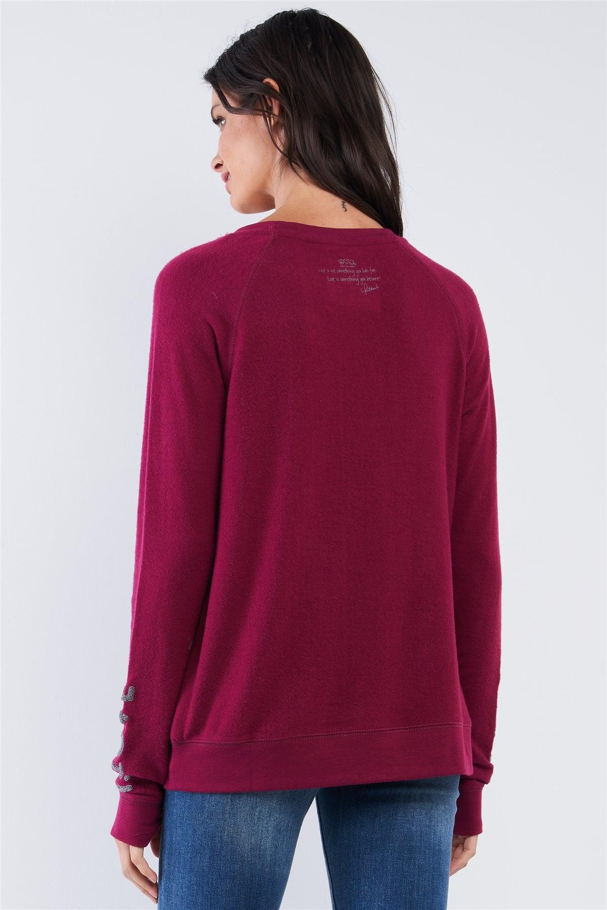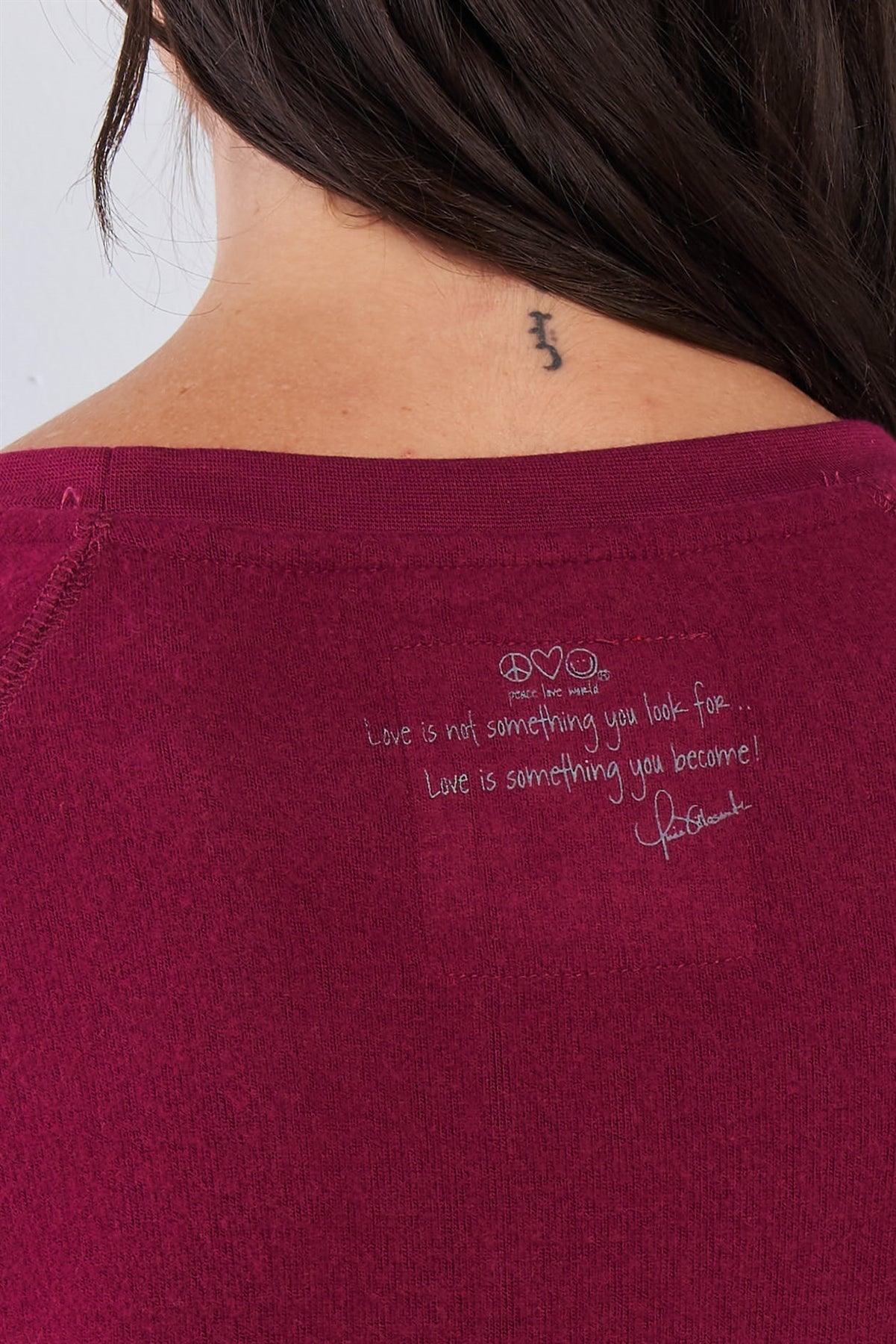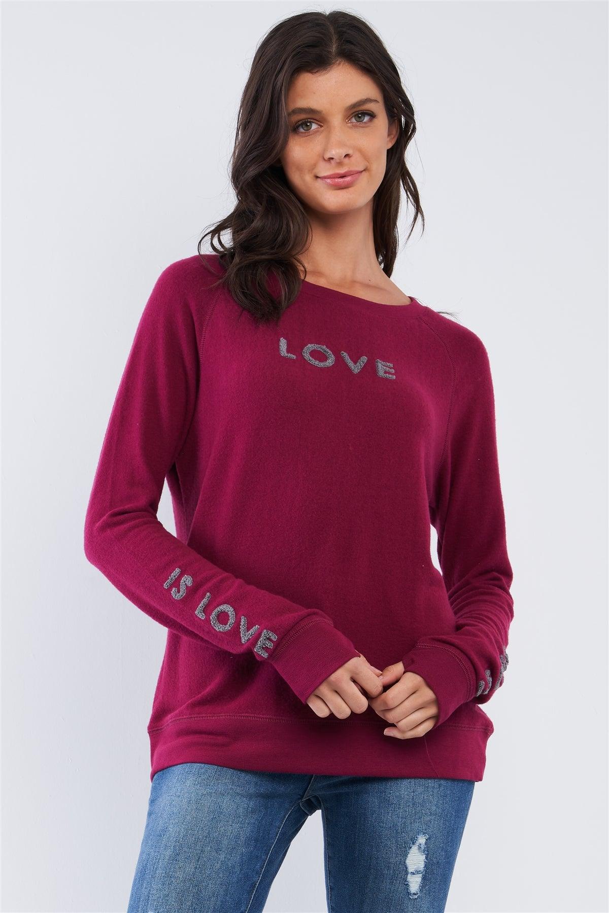 Plum Red Long Sleeve "Love is Love" Graphic Crew Neck Printed Top /2-2