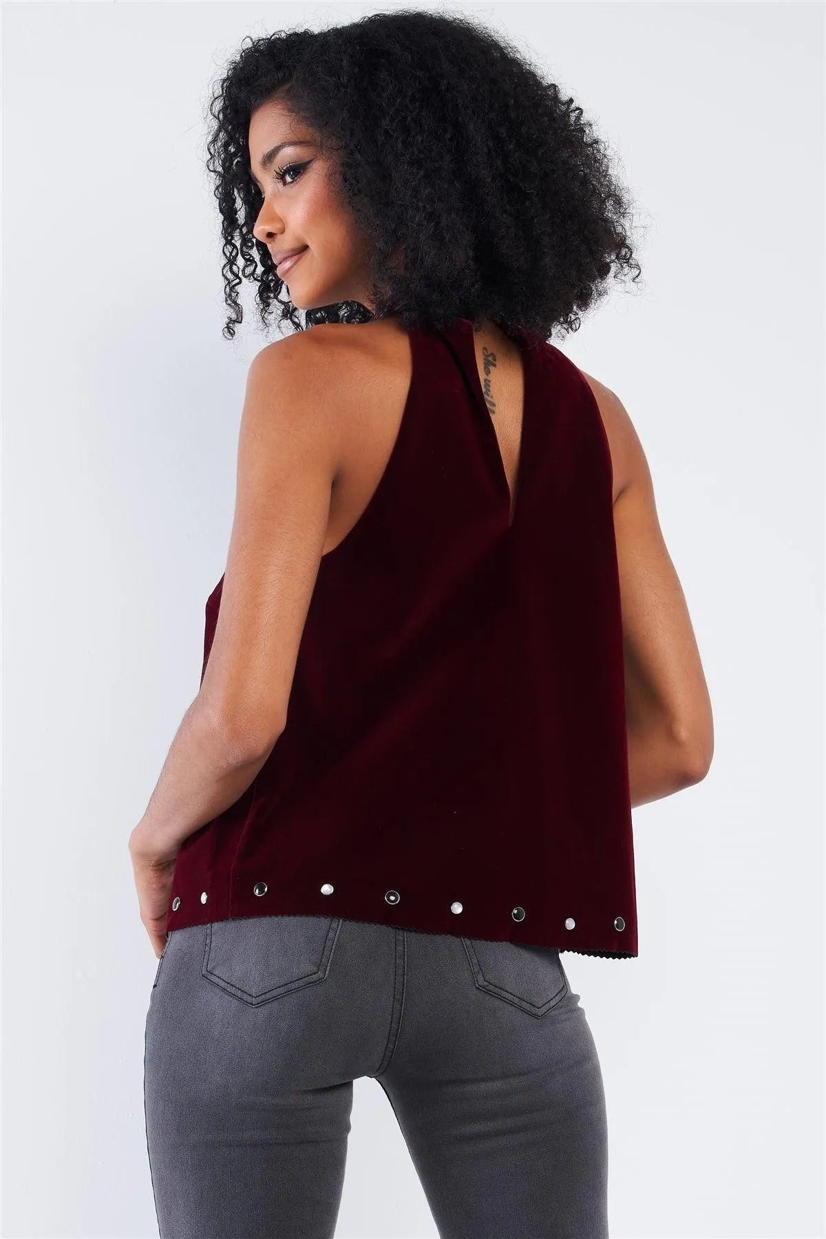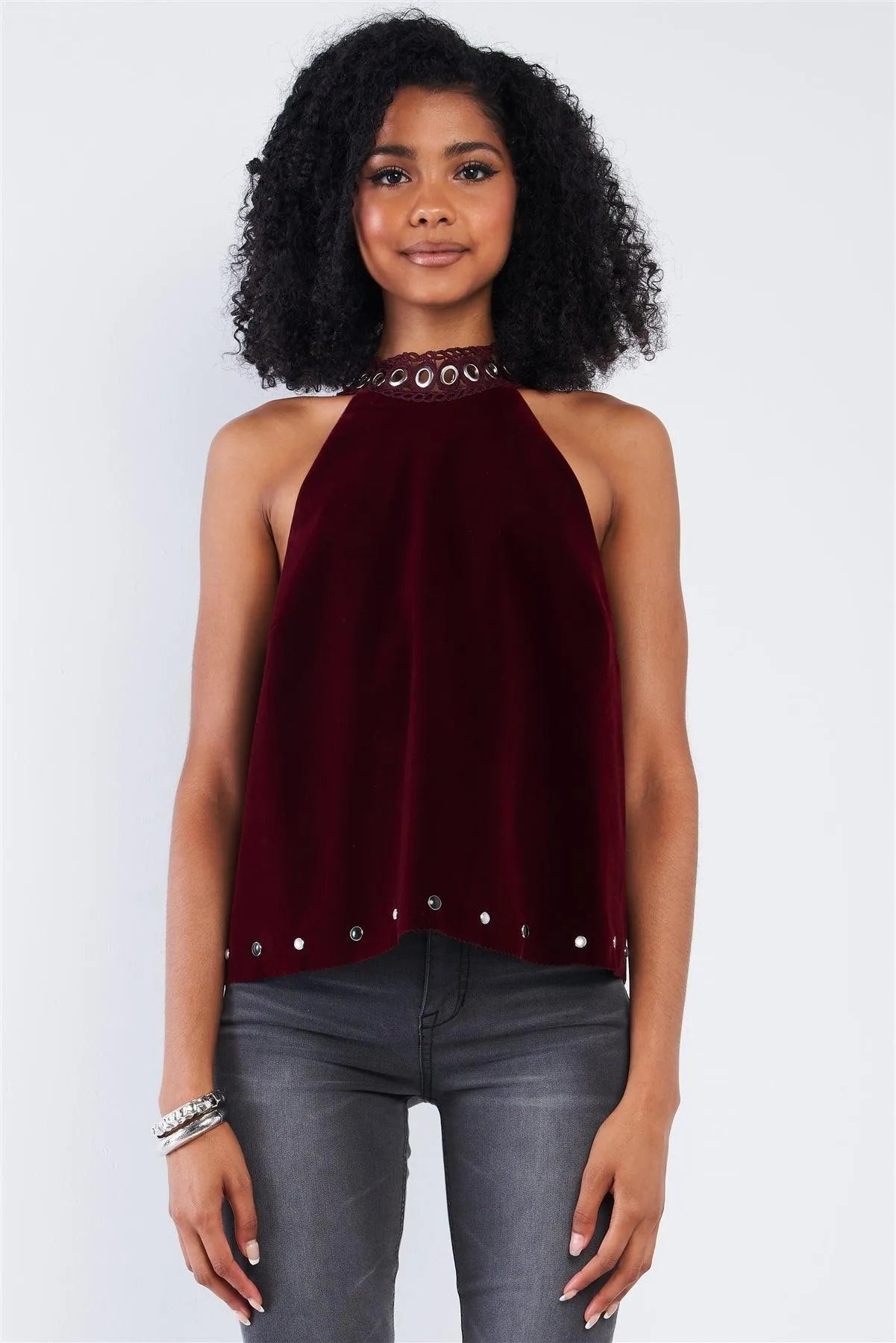 Lovely Merlot Red Velvet Sleeveless Lace & Hardware Detail Halter Babydoll Top