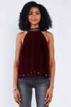 Lovely Merlot Red Velvet Sleeveless Lace & Hardware Detail Halter Babydoll Top /1-2-2-1