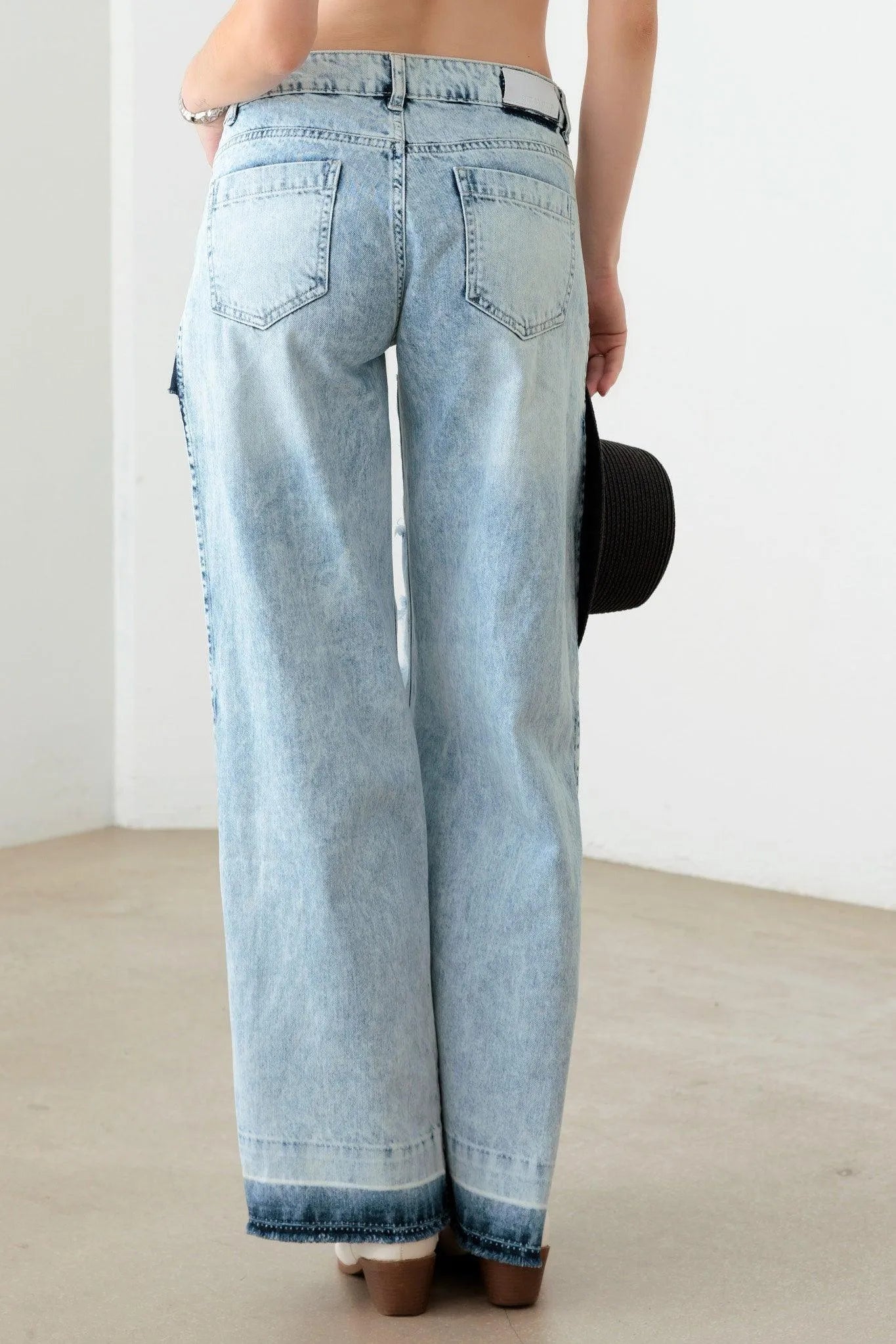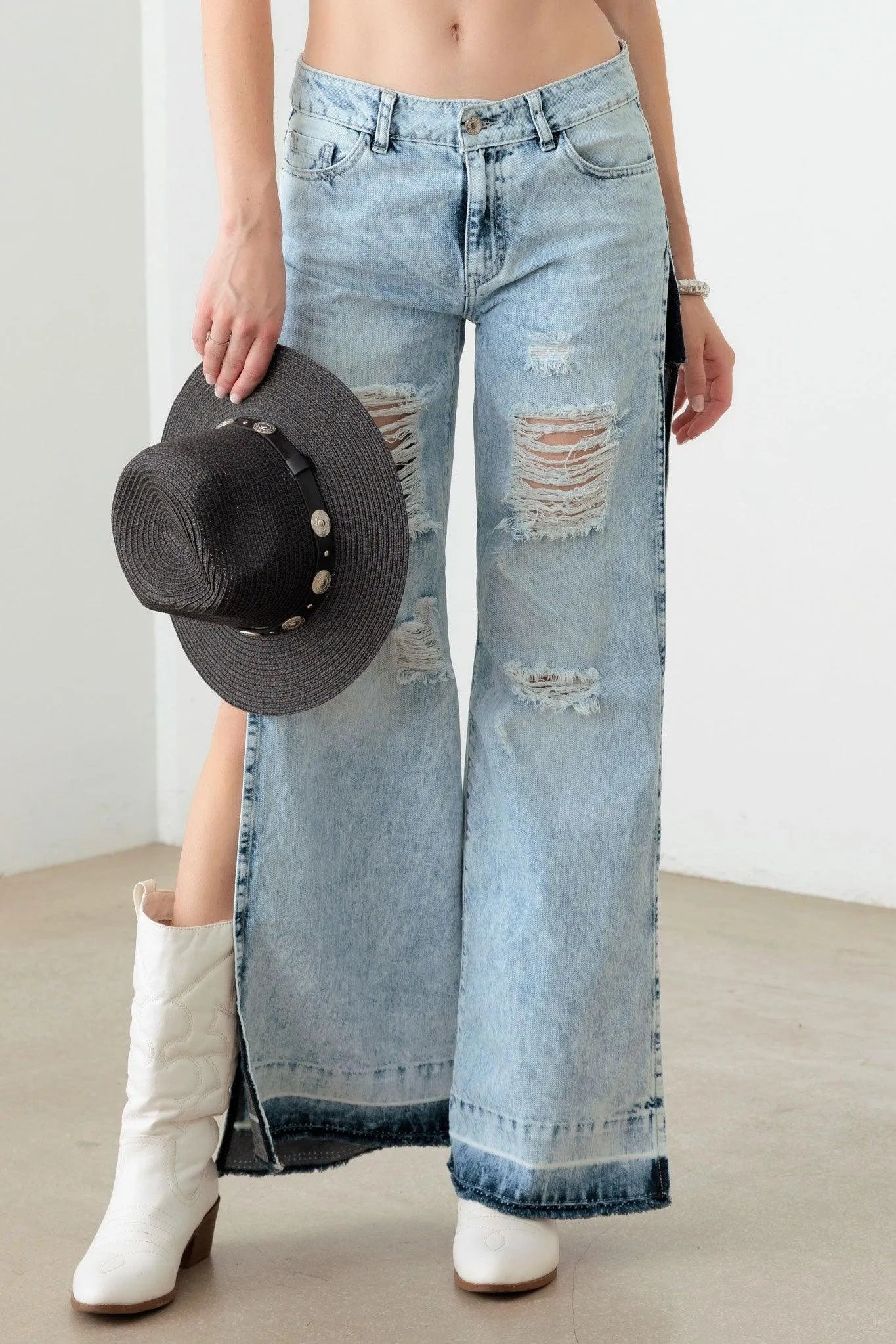 Women denim jeans, 100% cotton, mid waist, deep side slit, destroyed patter, wide acid wash hem, five pocket, metal gold & zipper closure, stretchy, cool, supper stylish, trendy, must have this cool style!
