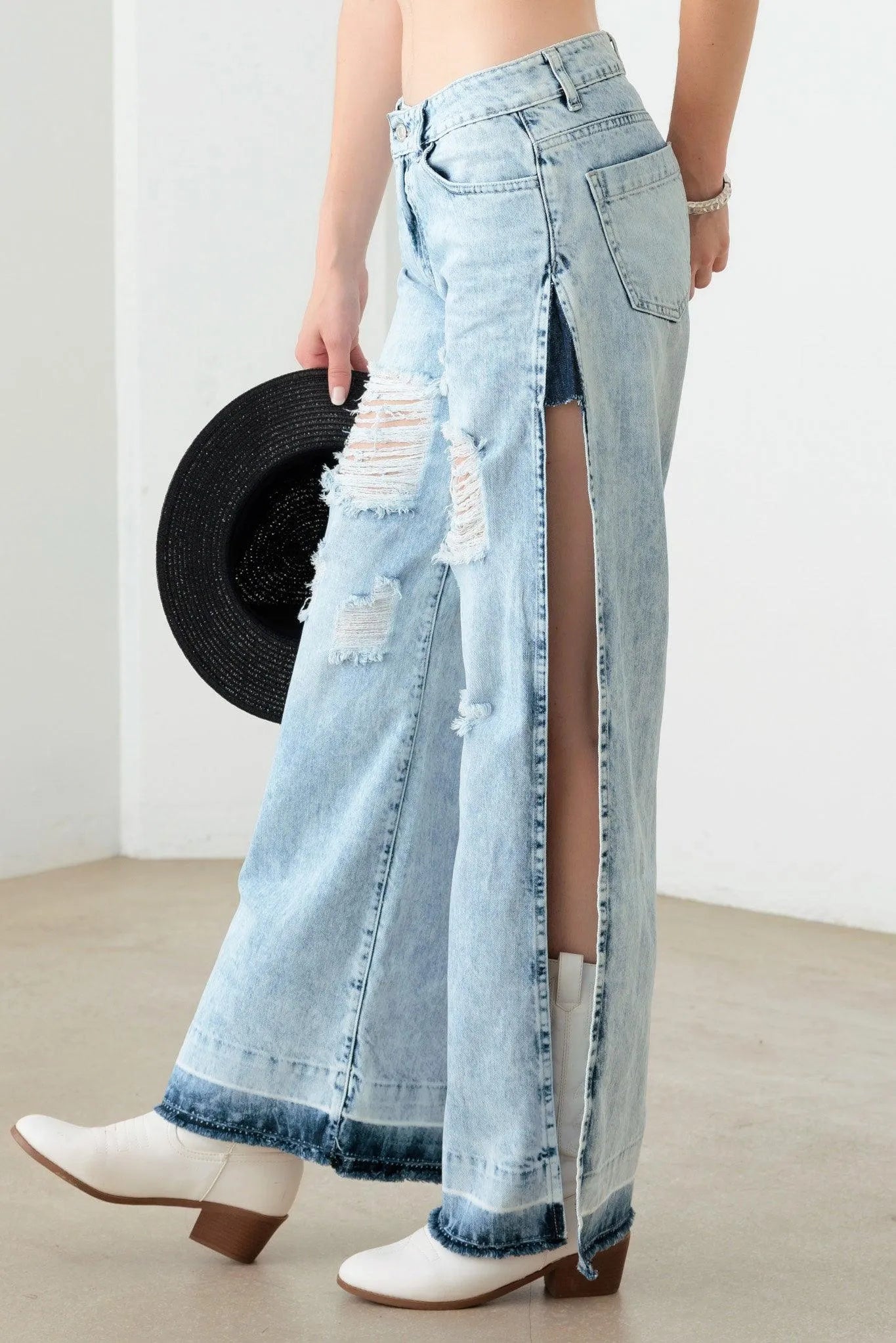 Light Blue Destroyed Deep Side Slit Raw Hem Jeans