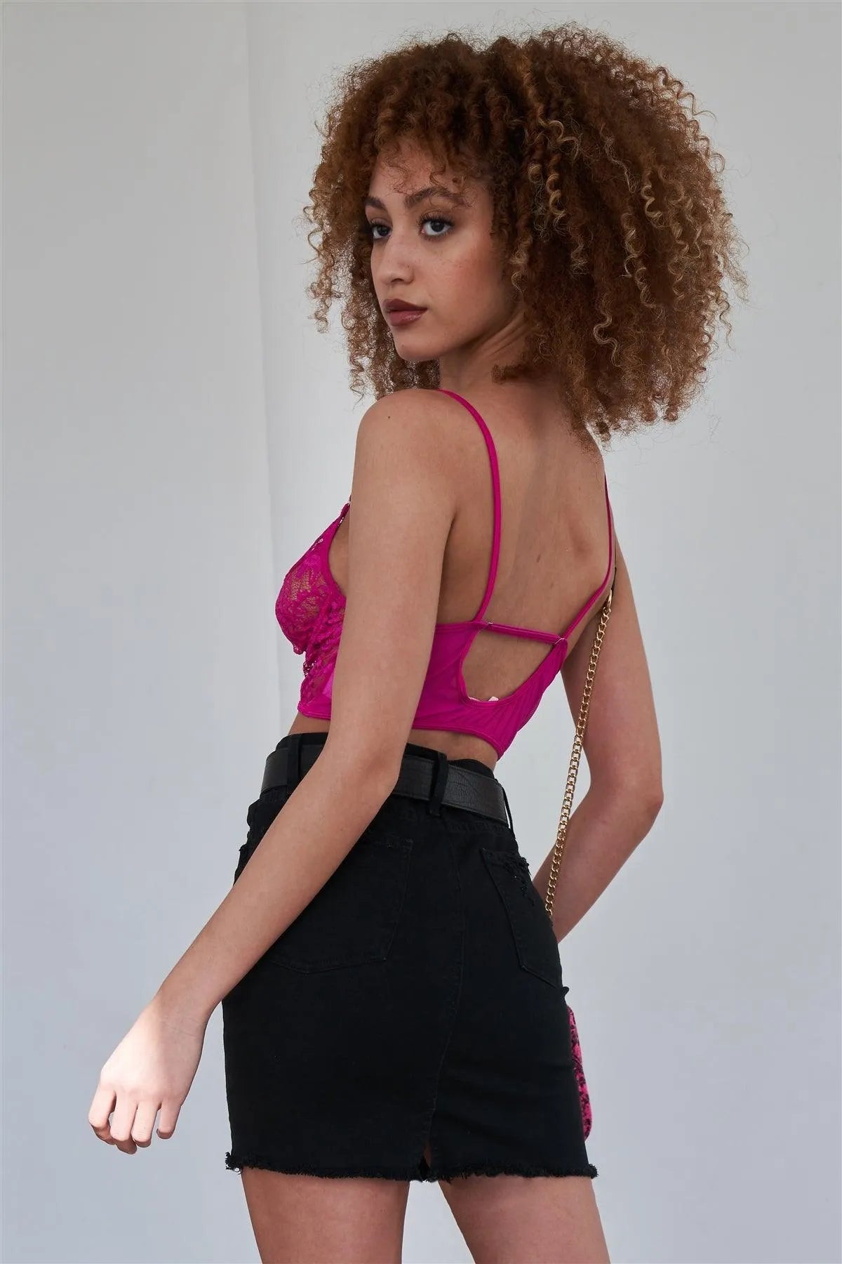 🖤 Bra features: Magenta, floral, lace, sheer, see through, stretchy, elastic sewn hem, adjustable cami straps, cropped, summer, lingerie, summer, sexy, club wear.