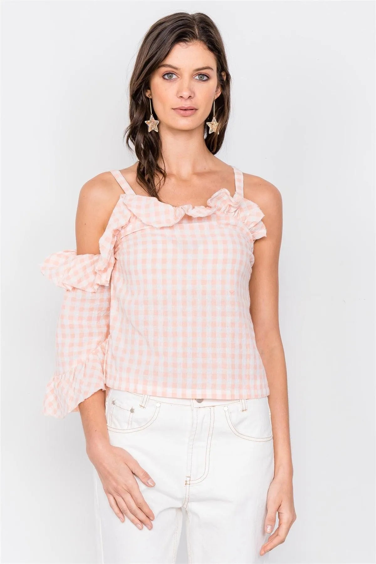 Top Features: checkered, white and pink, adjustable cami straps, one sleeve, cold shoulder, chic, casual, scoop neck, frill detail, puff sleeve, side mini slits, unlined, stretchy.Item Measurements: Length: 20.5" , Bust: 28" , Sleeve: 12.5"Model is 5'9 wearing a size Small ( Waist: 23.5", Bust: 32B, Hips: 36")Item pre-packed with hang tagsTrue to Size