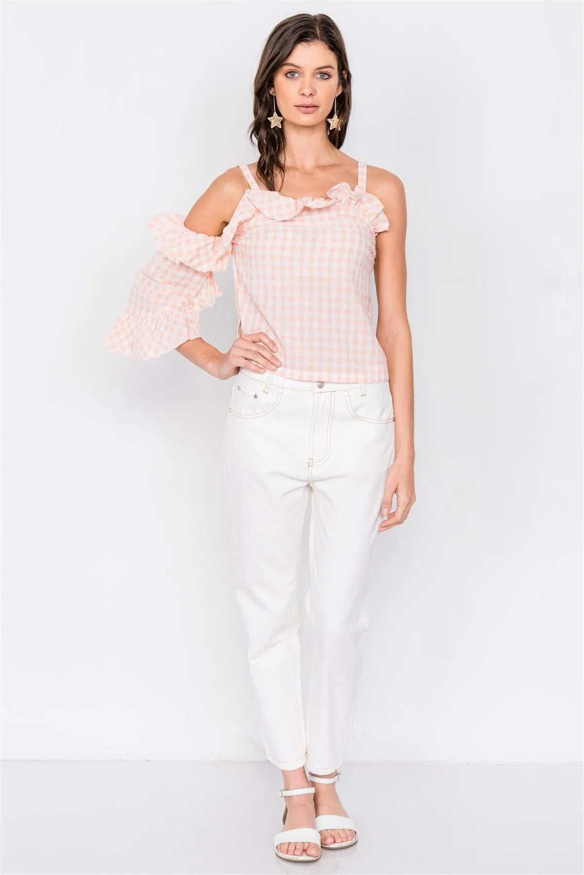 Malibu Peach & White Cotton Checkered One Shoulder Top /3-2-1