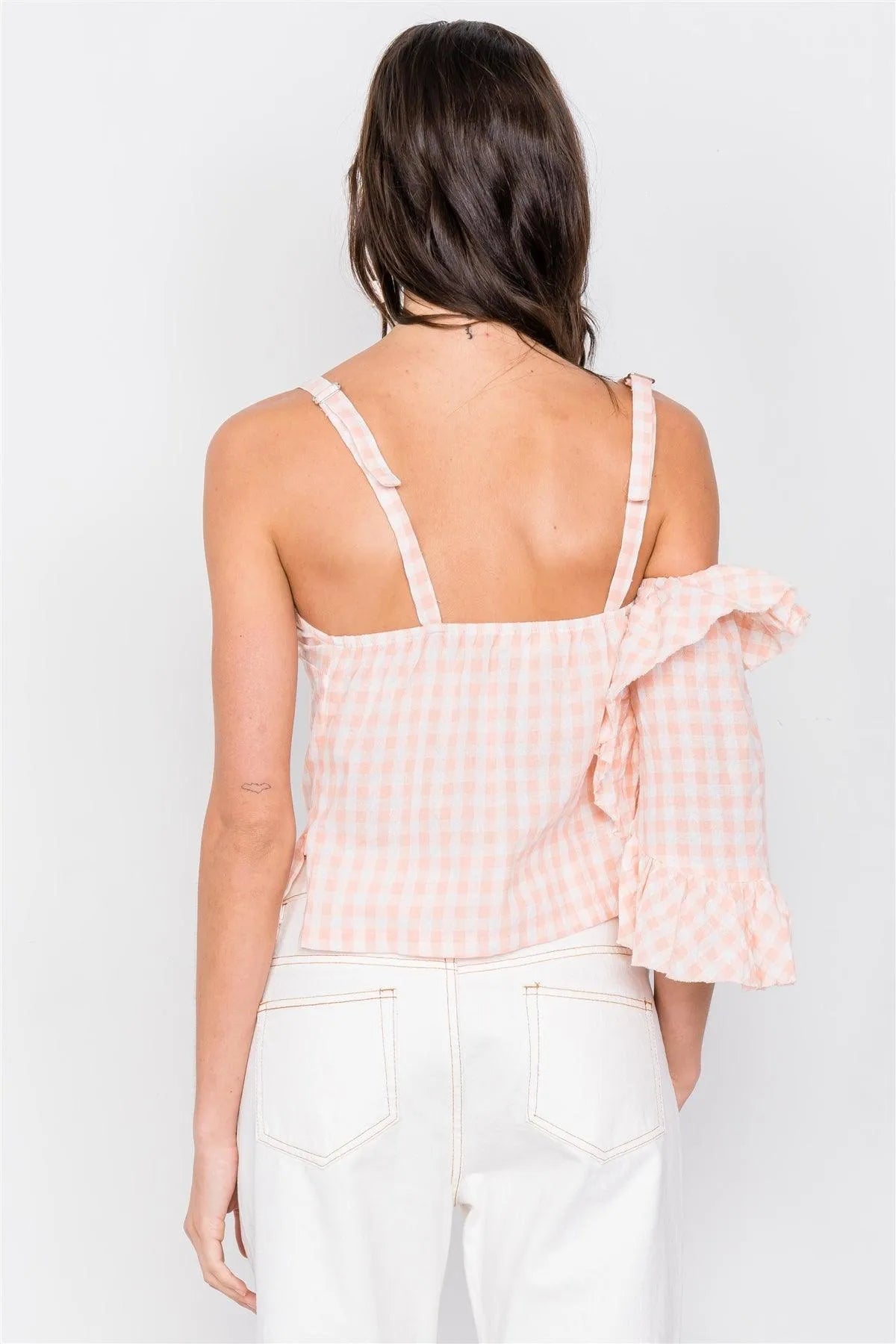 Top Features: checkered, white and pink, adjustable cami straps, one sleeve, cold shoulder, chic, casual, scoop neck, frill detail, puff sleeve, side mini slits, unlined, stretchy.Item Measurements: Length: 20.5" , Bust: 28" , Sleeve: 12.5"Model is 5'9 wearing a size Small ( Waist: 23.5", Bust: 32B, Hips: 36")Item pre-packed True to Size