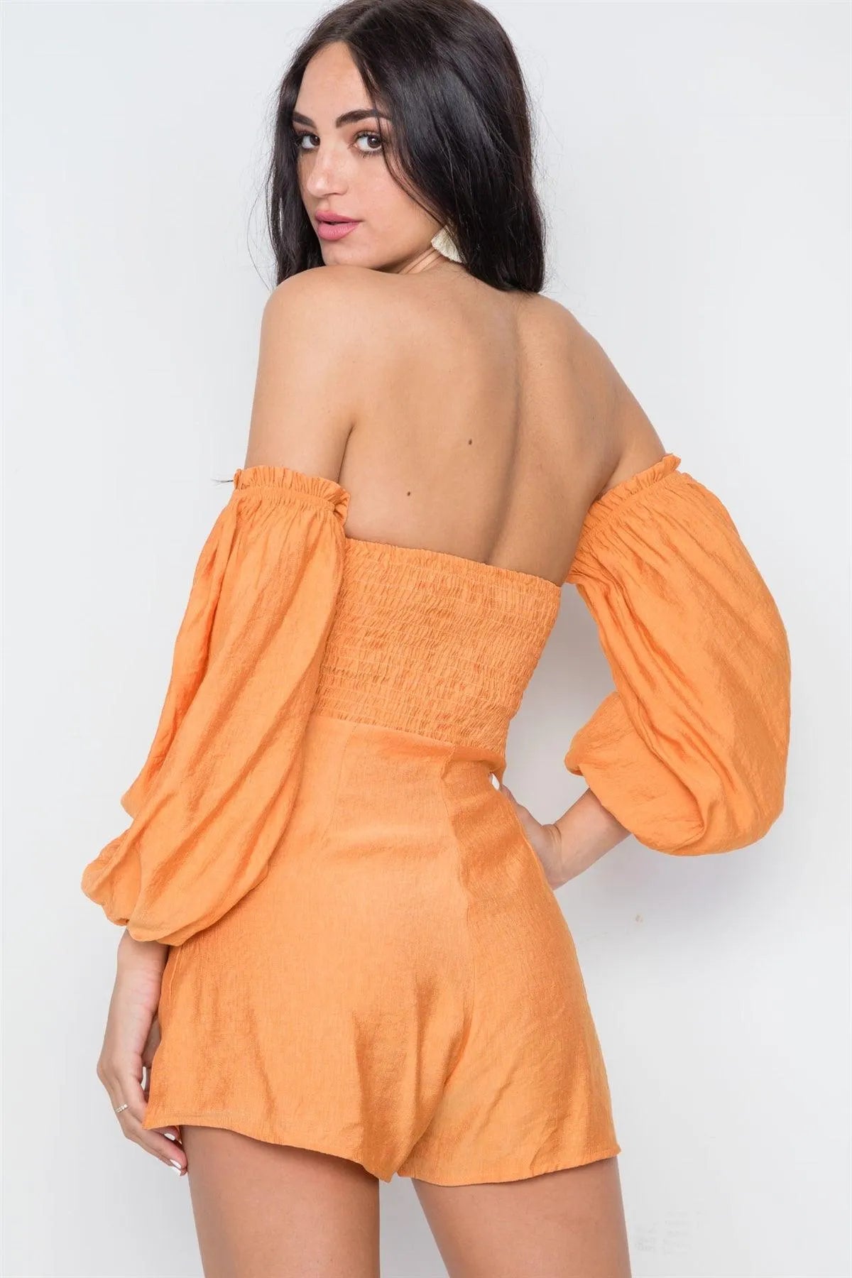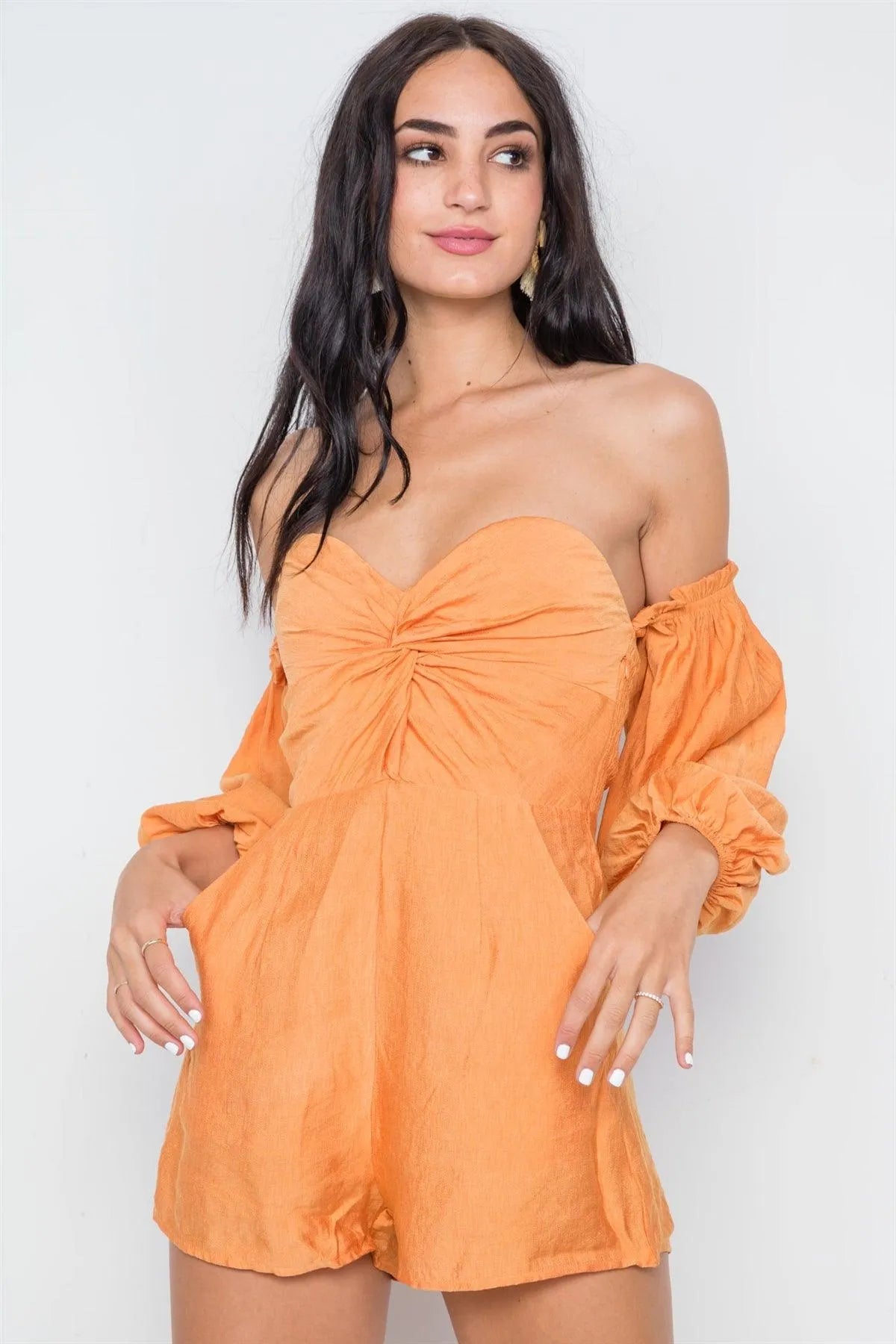 Romper features: sweetheart neckline with twisted detailing, padded bust, long puff sleeves with elasticized cuffs, smocked back, site pockets, unlinedModel is 5'8 and wearing Small (Waist: 24", Bust: 32A, Hips: 34")Item Measurements: Length: 23" Bust: 30" Sleeves: 17"True to sizeAvailable in Red