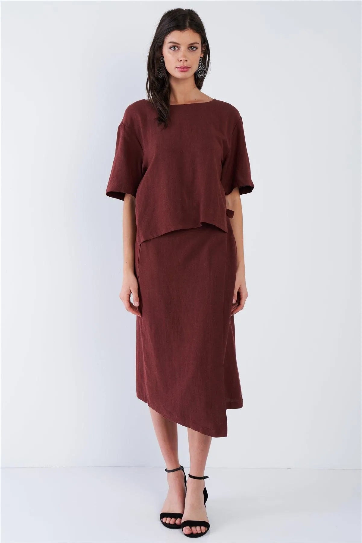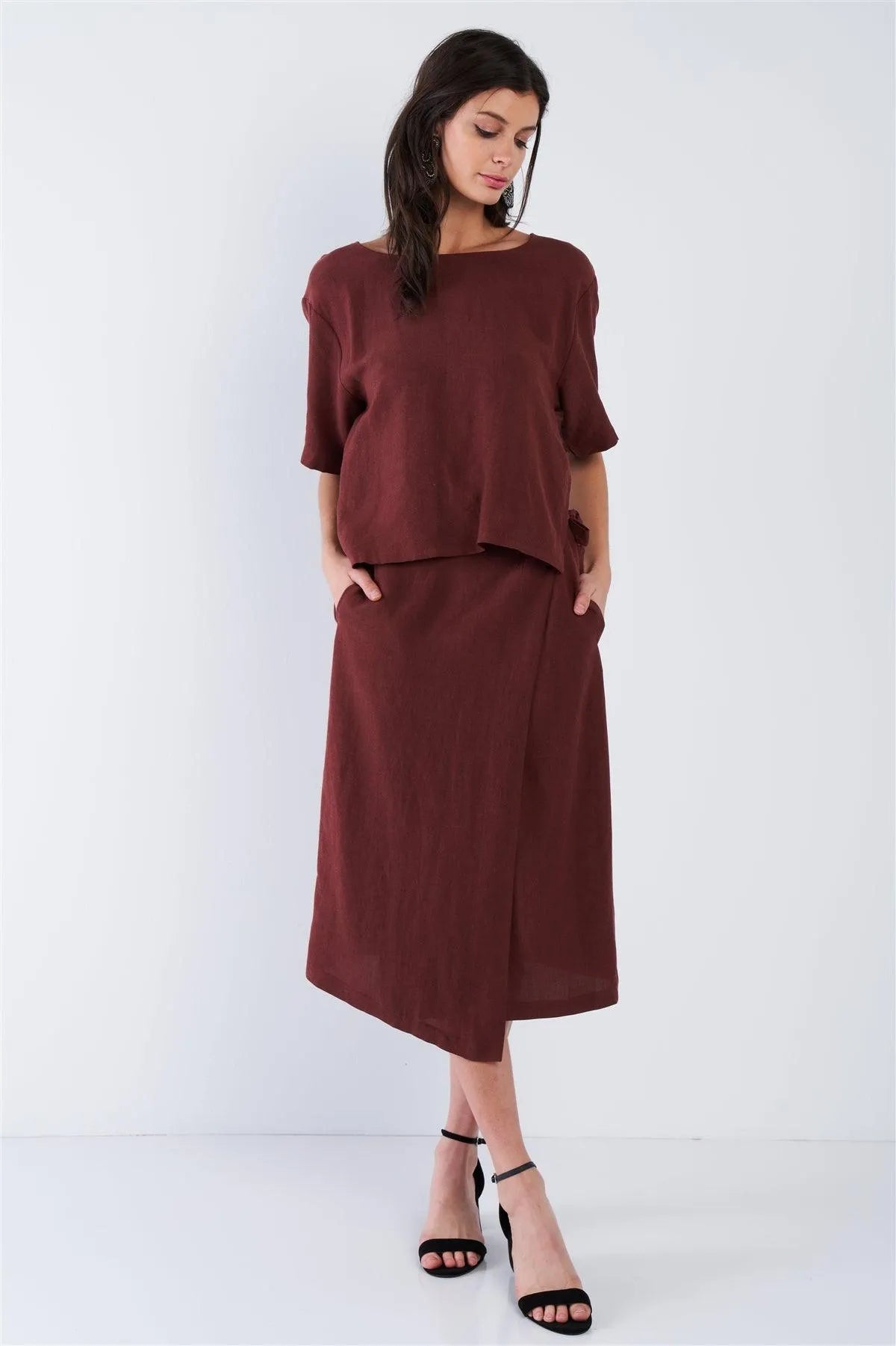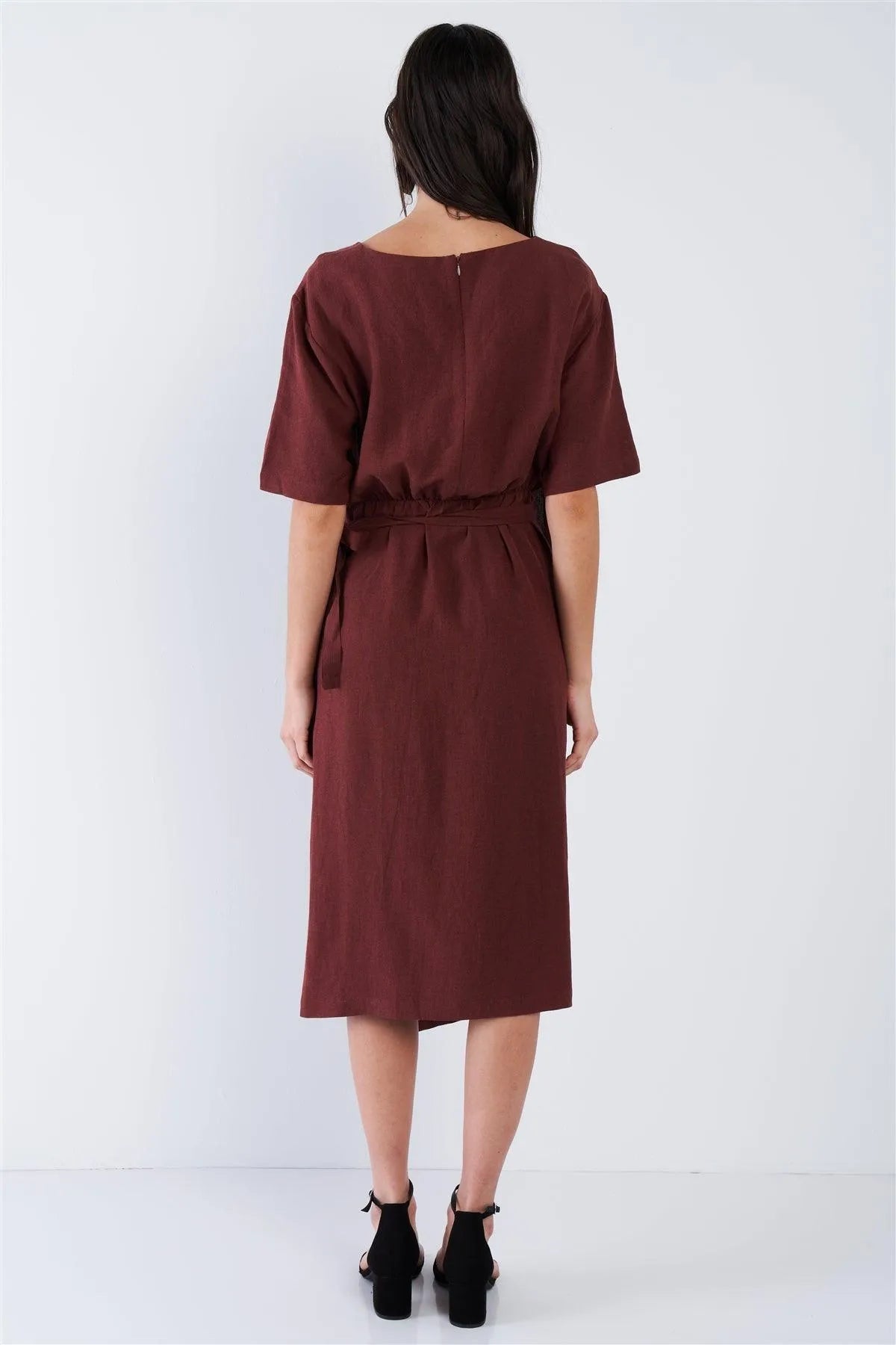 Maroon Brown Center Cut Out V-Neck Midi Wrap Dress /3-2-1