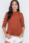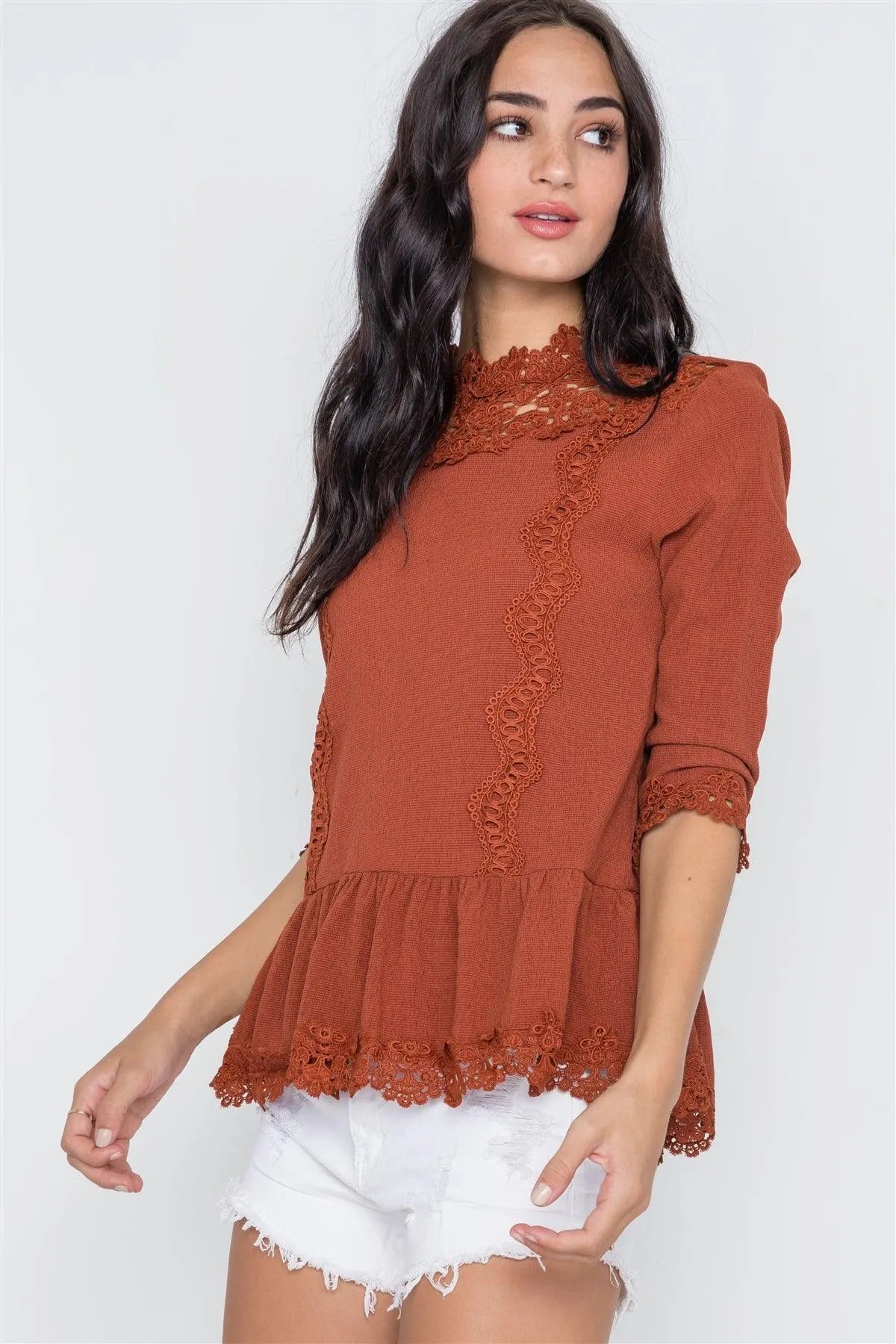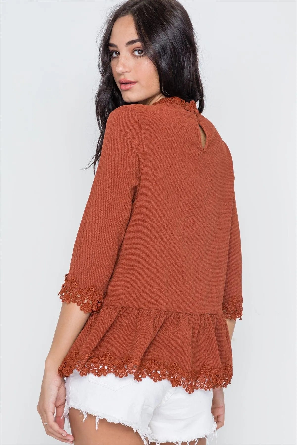 Marsala 3/4 Sleeves Crochet Trim Shirred Hem Top /2-2-2