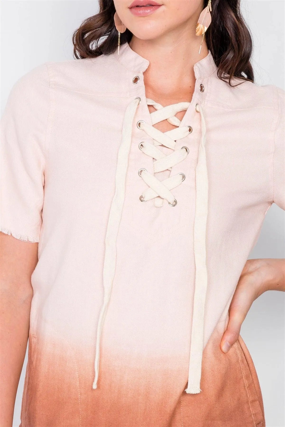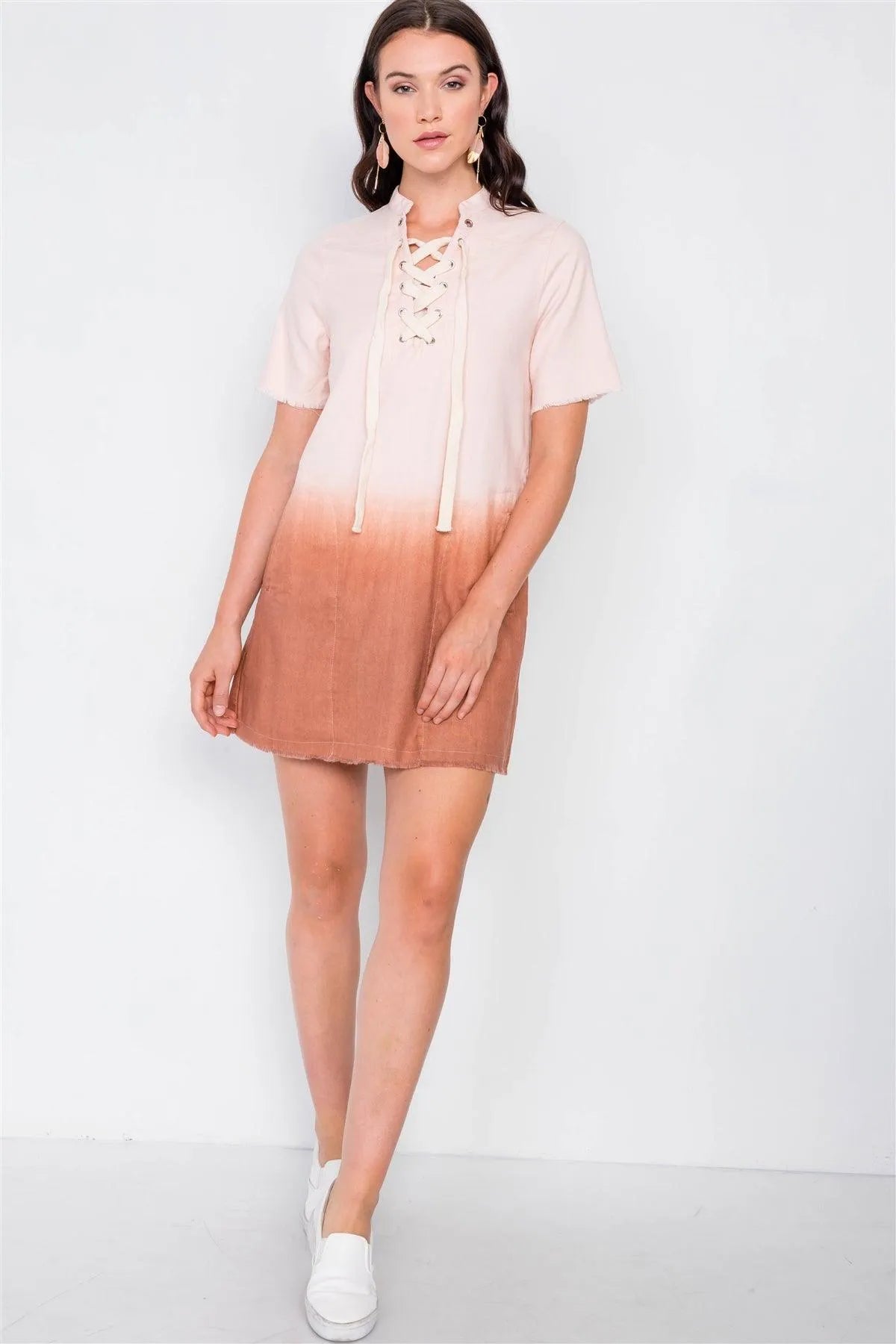 Dress features: dip dye design, mini dress, raw hem, front lace up grommet detail, side pockets, unlined.Model is 5'10 and wearing Small (Waist: 24", Bust: 32B, Hips: 36")Item Measurements: Length: 34", Bust: 38" , Sleeves 11"True to size