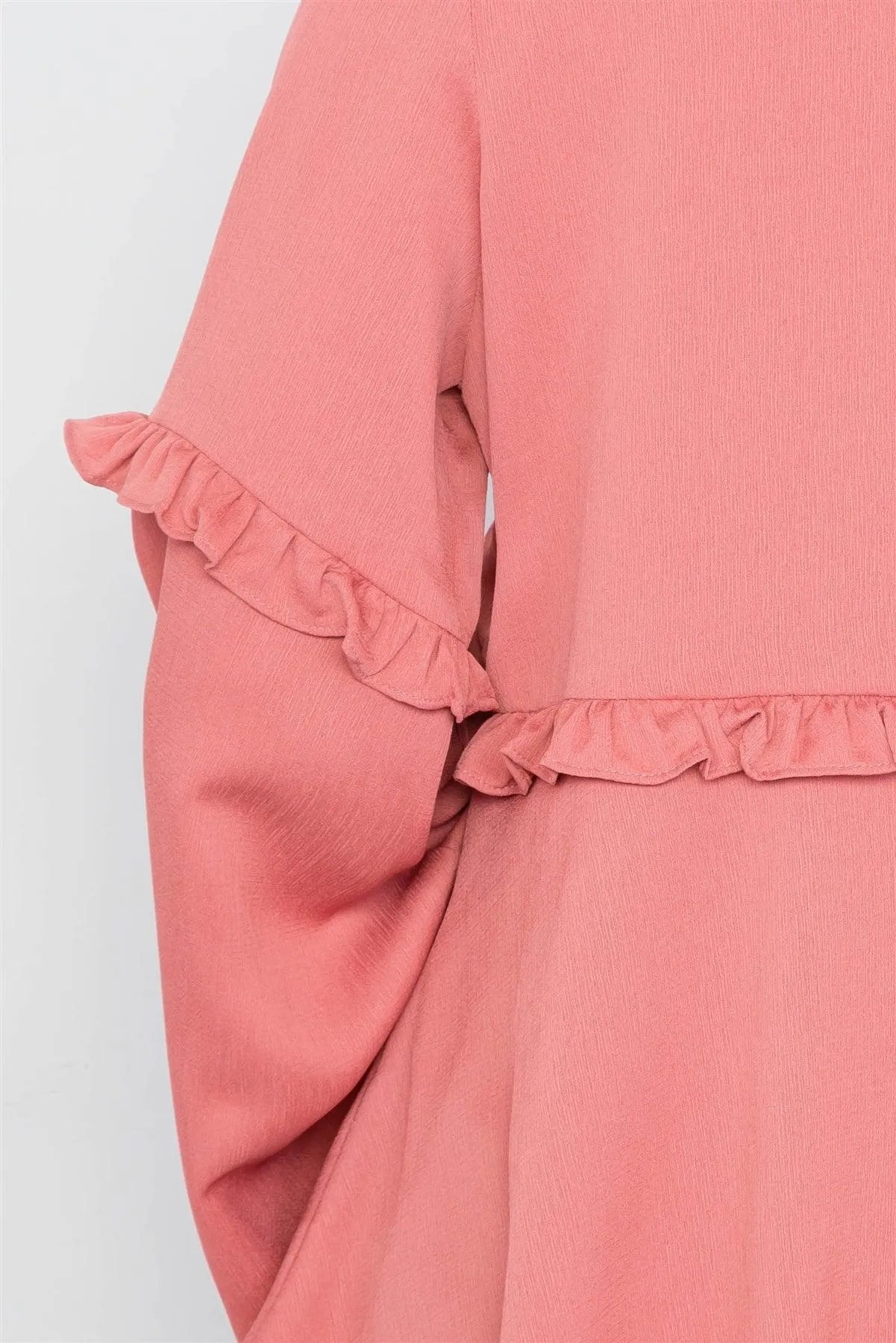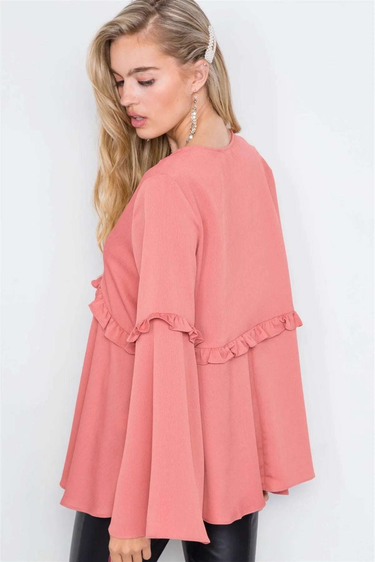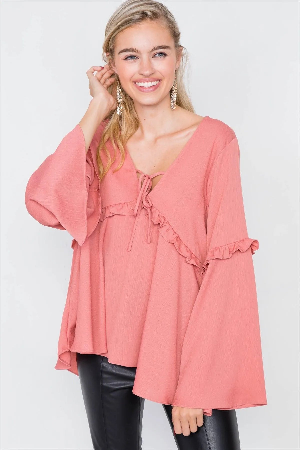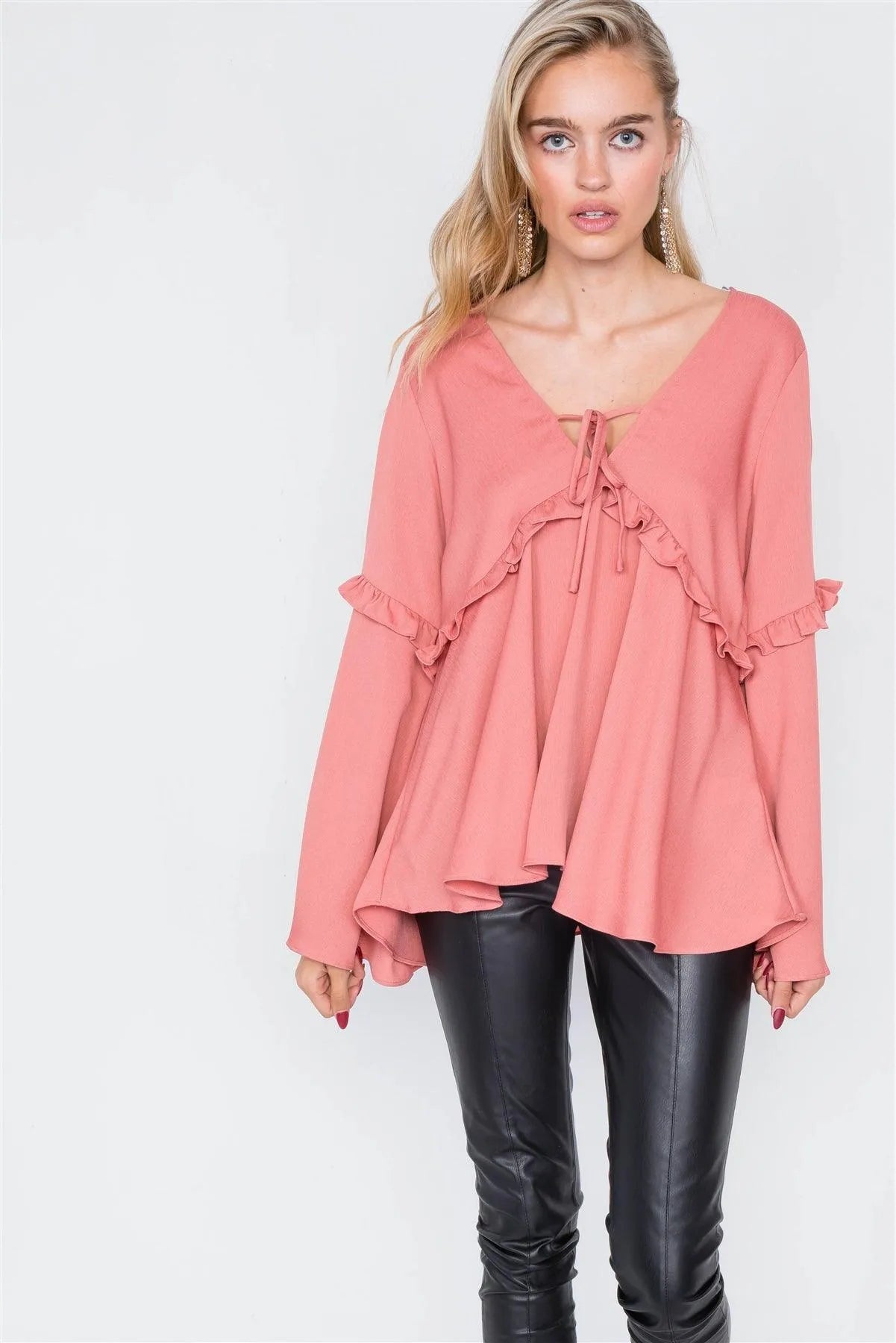 Mauve Flounce Belle Sleeve Lace-Up V-Neck Blouse /1-1-2