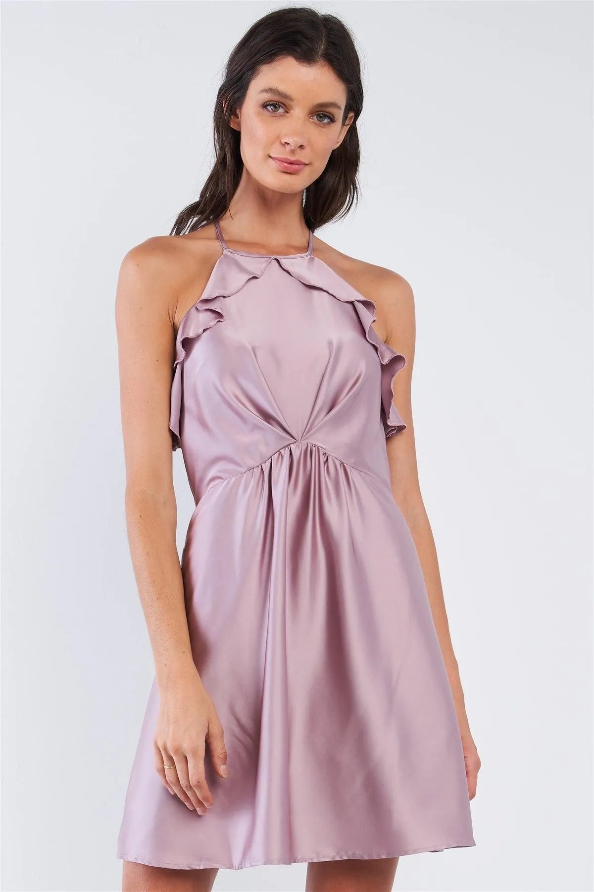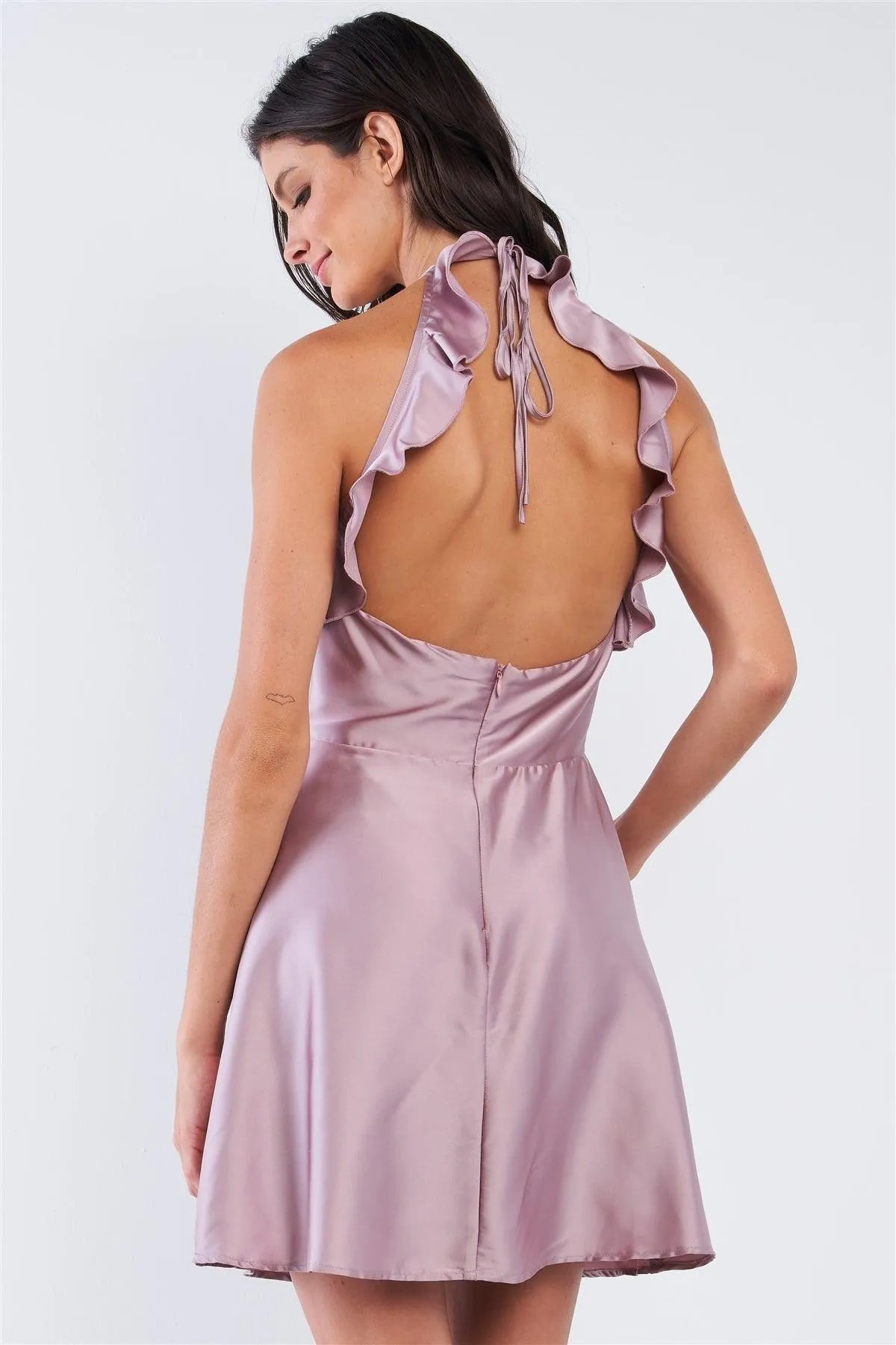 🖤 Item features: Mauve pink, satin, sleeveless, tight fitting, round neckline with neck and shoulder ruffle hem, open back, self-tie strings with ruffle hem, non-adjustable straps, back zipper fly closure, hook-and-eye closure, mini length, lined, gathered pleated front chest detail, chic, party wear, date night dress, cocktail, girly, cute, feminine, spring/s