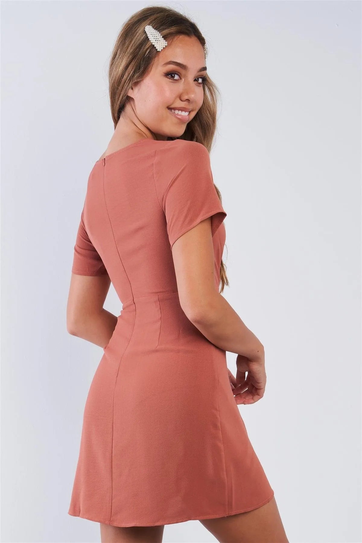 Effortlessly chic and stylish, our Mauve Short Sleeve Knotted Crew Neck Chic Mini Dress is a must-have this season. The knotted crew neck adds a touch of trendy detail, while the short sleeves ensure comfort. Made from high-quality materials, this mini dress is perfect for any occasion.