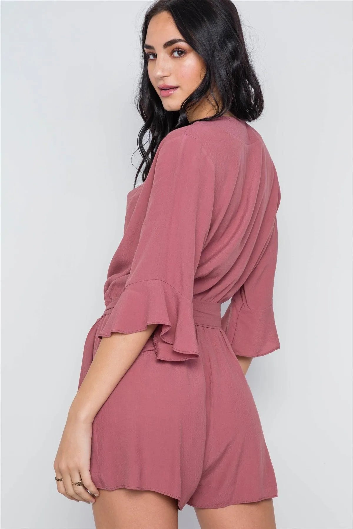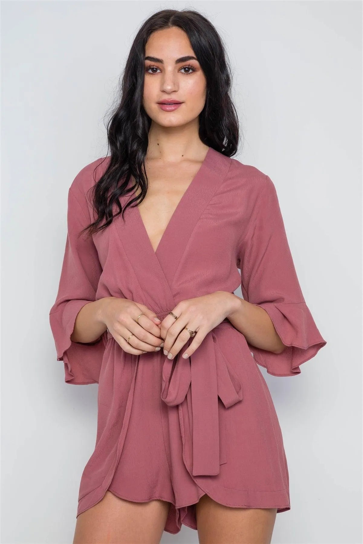 Mauve Surplice V-Neck 3/4 Bell Sleeve Boho Romper / 1-3-2-1-1