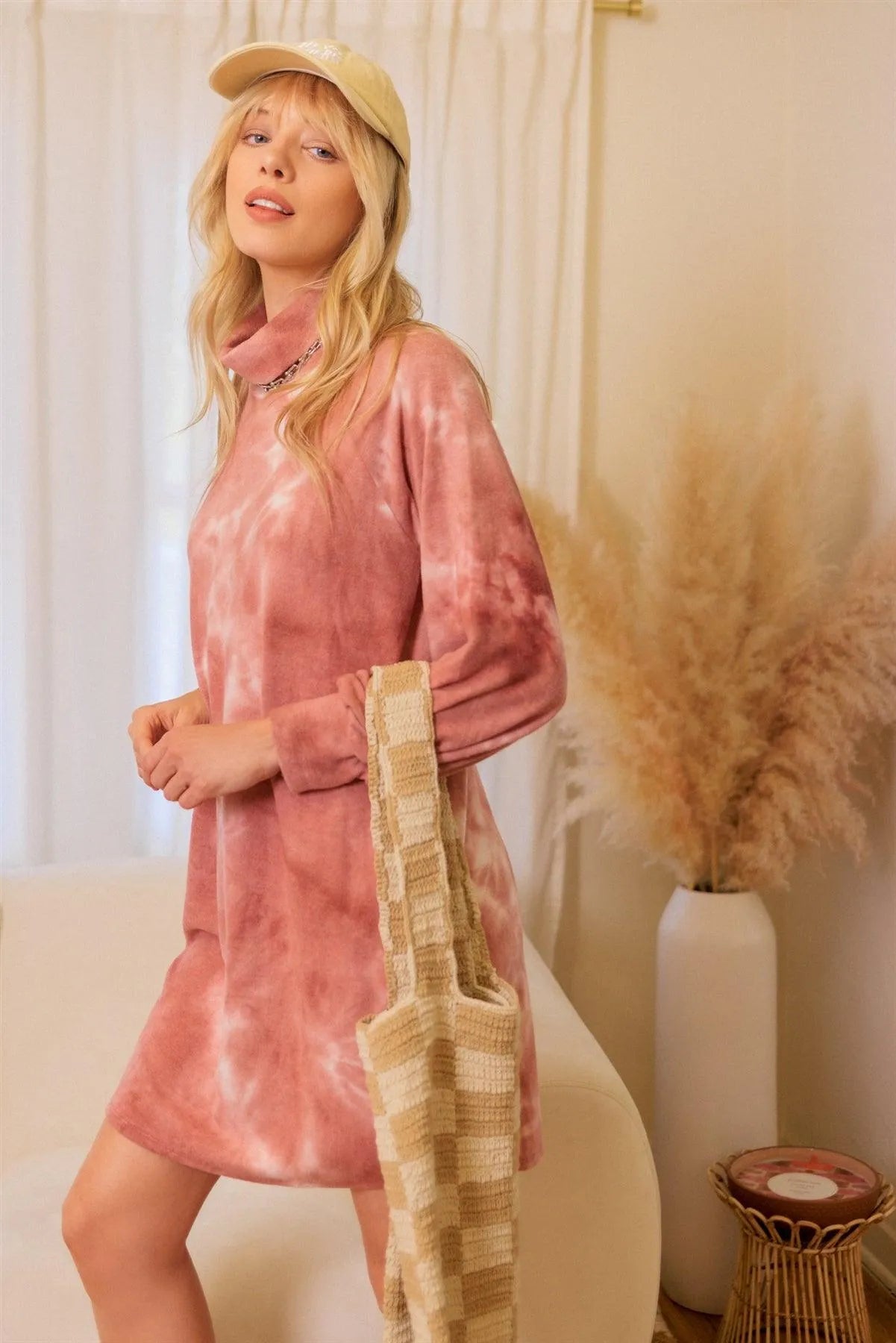 Mauve Tie-Dye Flannel Turtle Neck Mini Dress