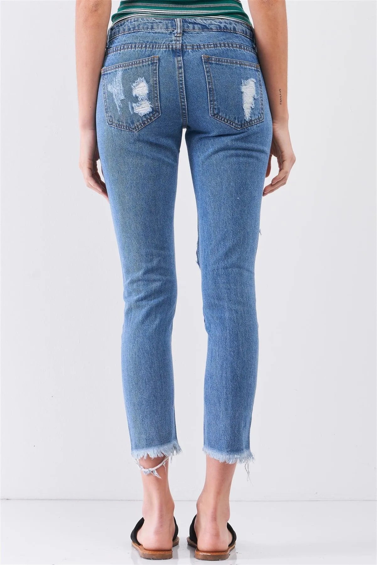 🖤 Item features: Medium blue, low-mid rise, ripped and destroyed, four pocket construction, ankle length, belt loops, button & zip-up front closure, skinny fit, unlined, non-stretchy, tight, casual, stylish cut & fit, all seasons