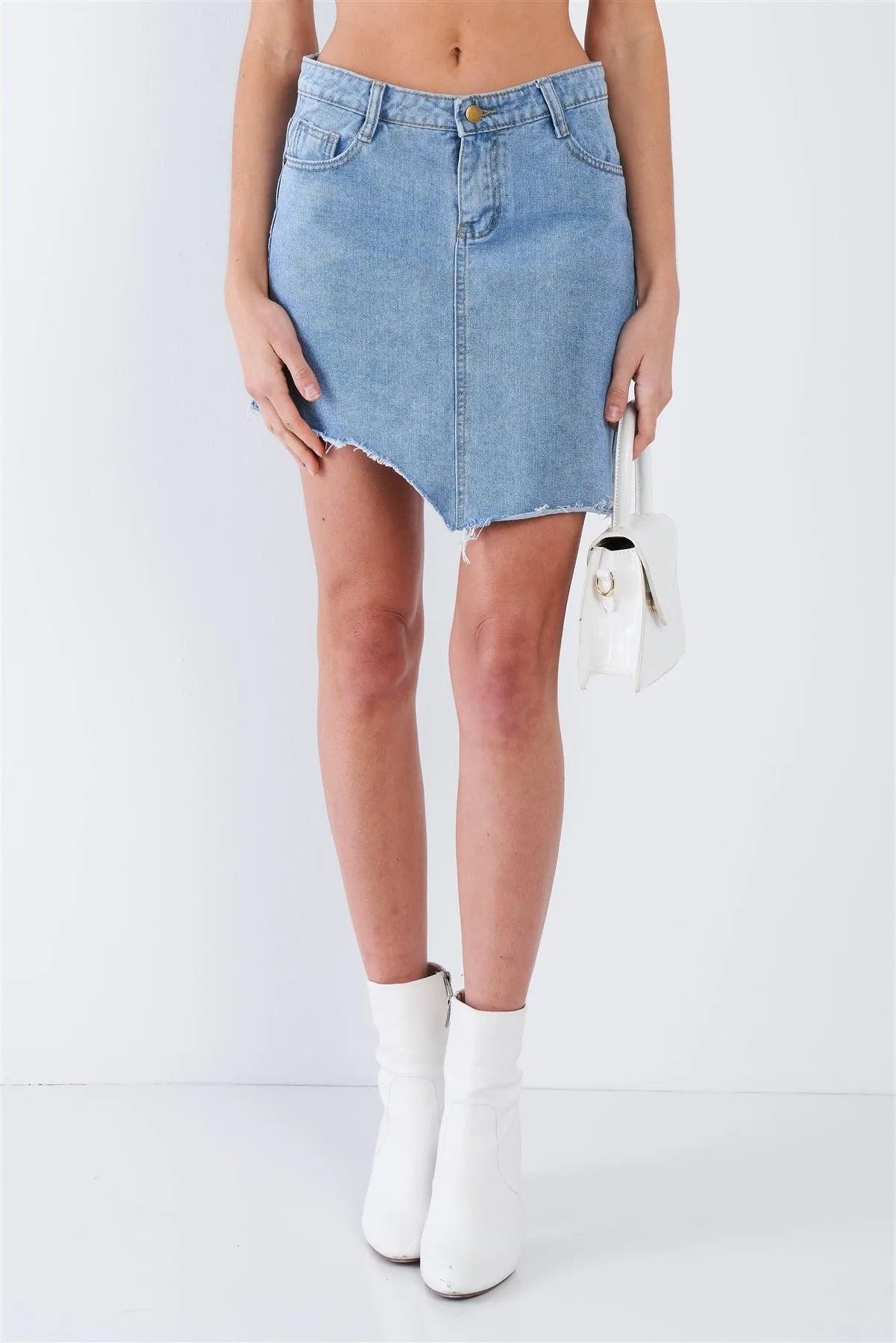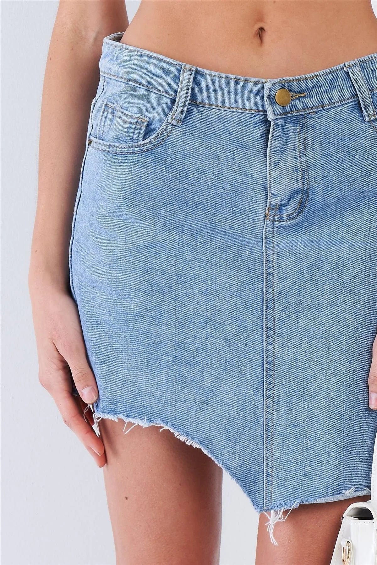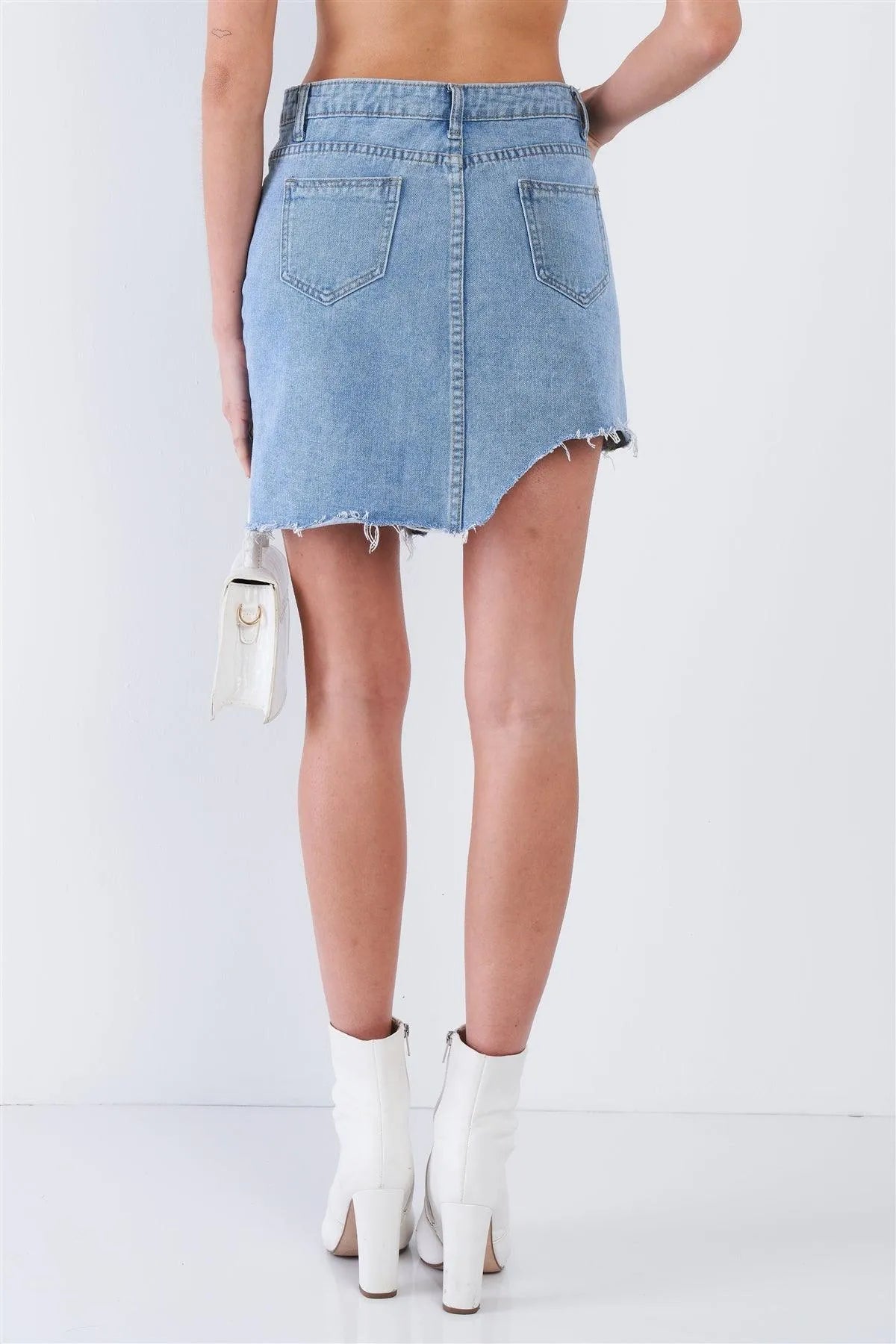 Medium Blue Washed Asymmetrical Raw Cut Hem Mini Skirt / 1-3-2