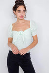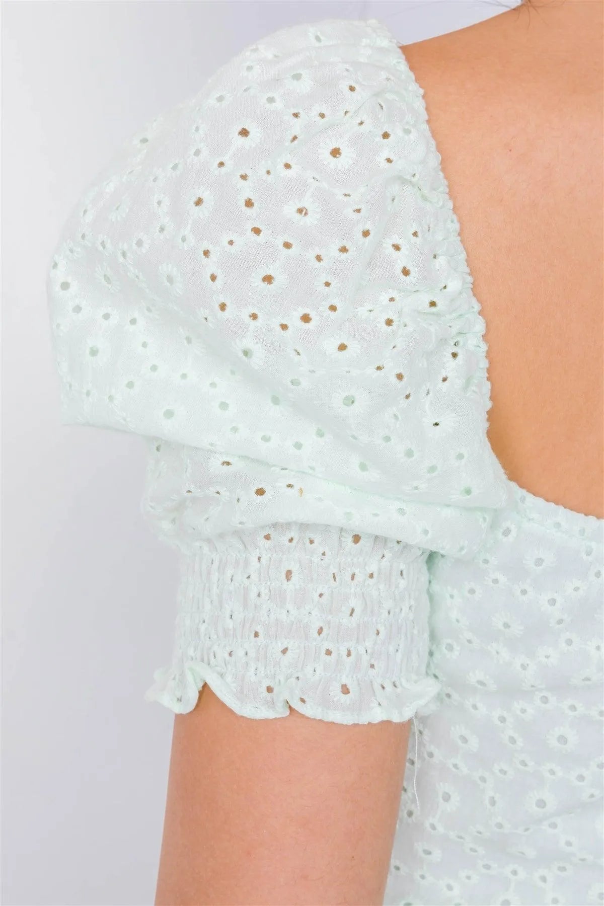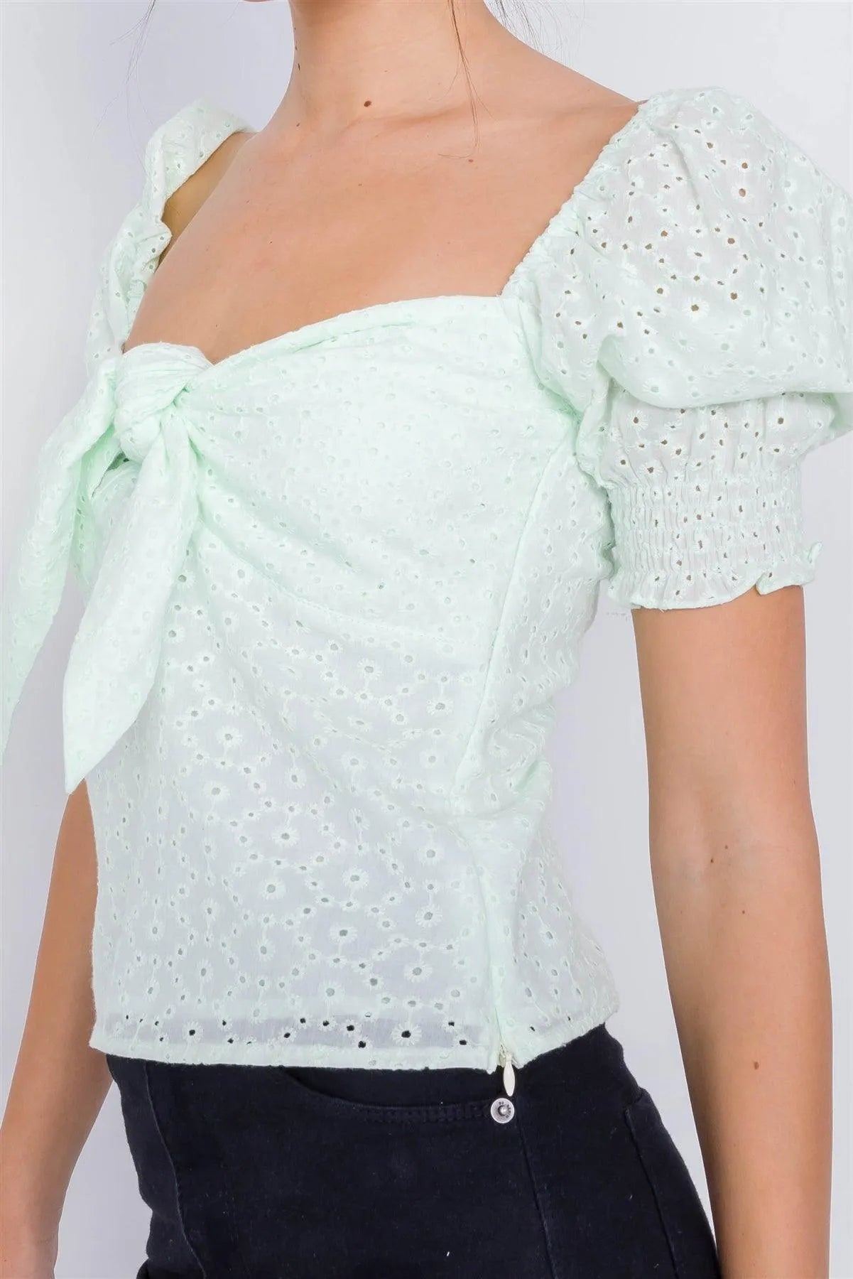 Top features: eyelet design, solid, v-neck, center self tie bow, cinched puff short sleeve, hidden side zipper, work attire, office chic, square neckline, lined, elastic back, some stretch, floral eyelet, boho.Model is 5'9 wearing a size Small ( Waist: 26", Bust: 34B, Hips: 36")Item measurements: Length: 19'', Bust: 30", Sleeve: 12"True to sizeAlso available in Lavender and Off-White