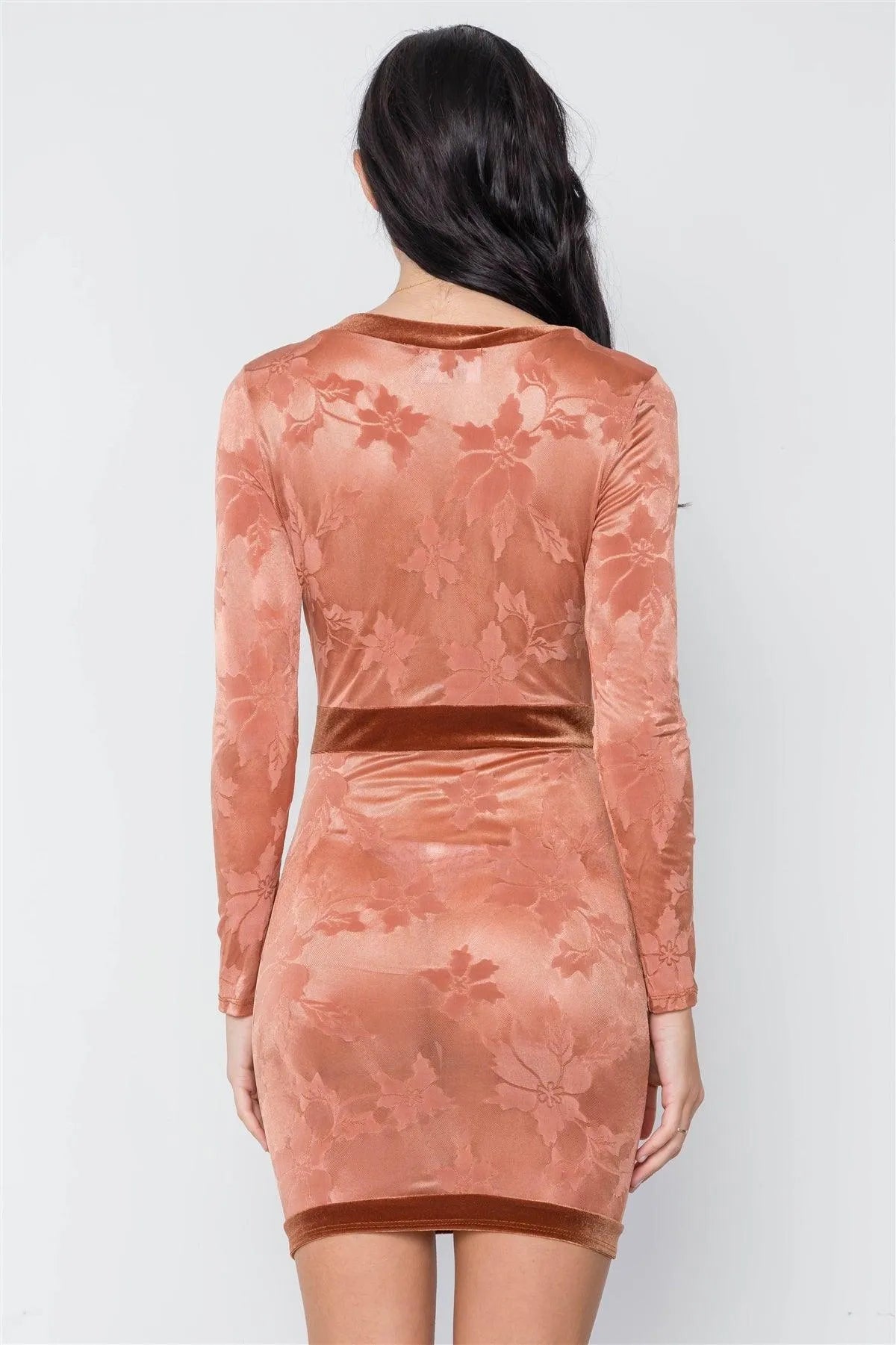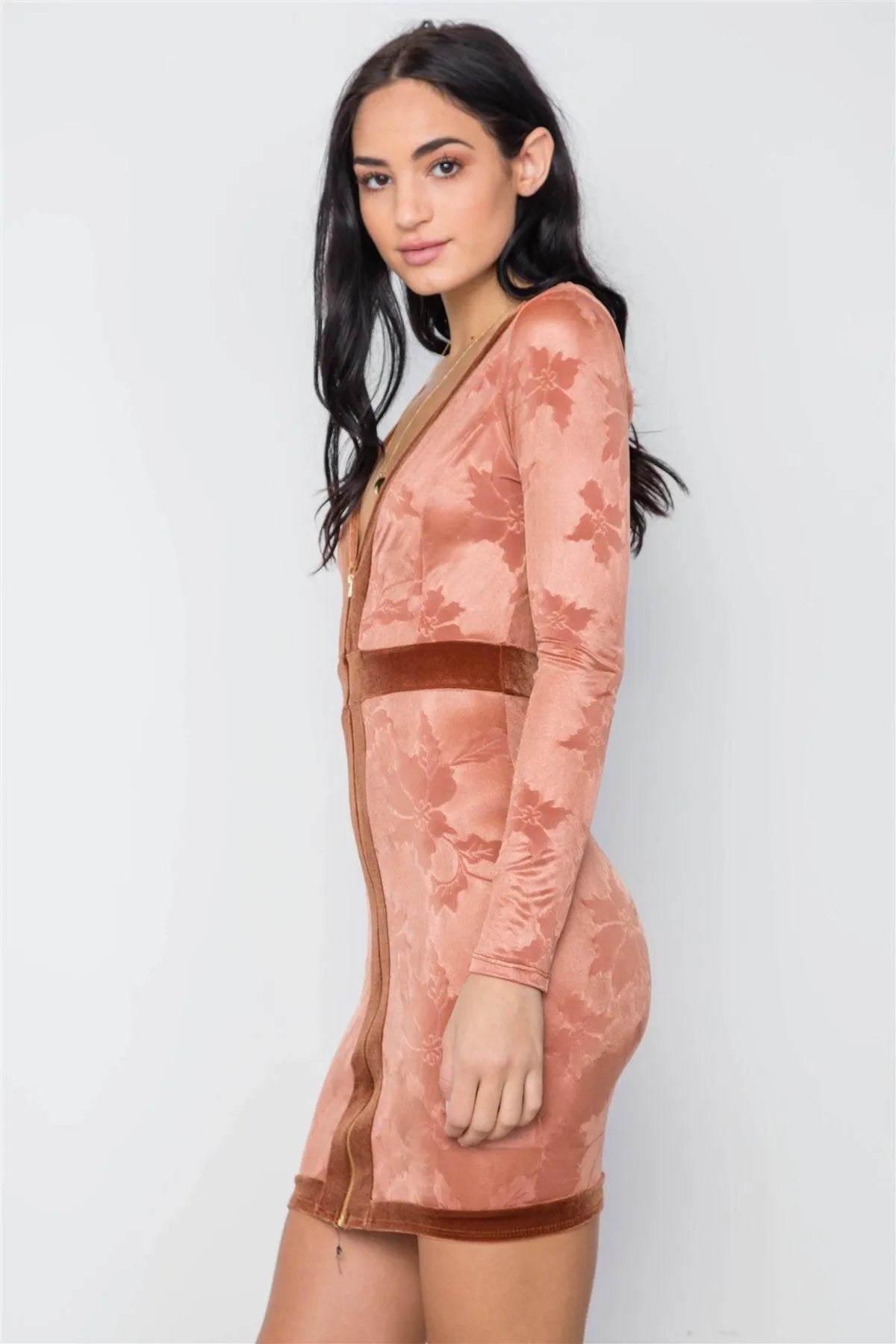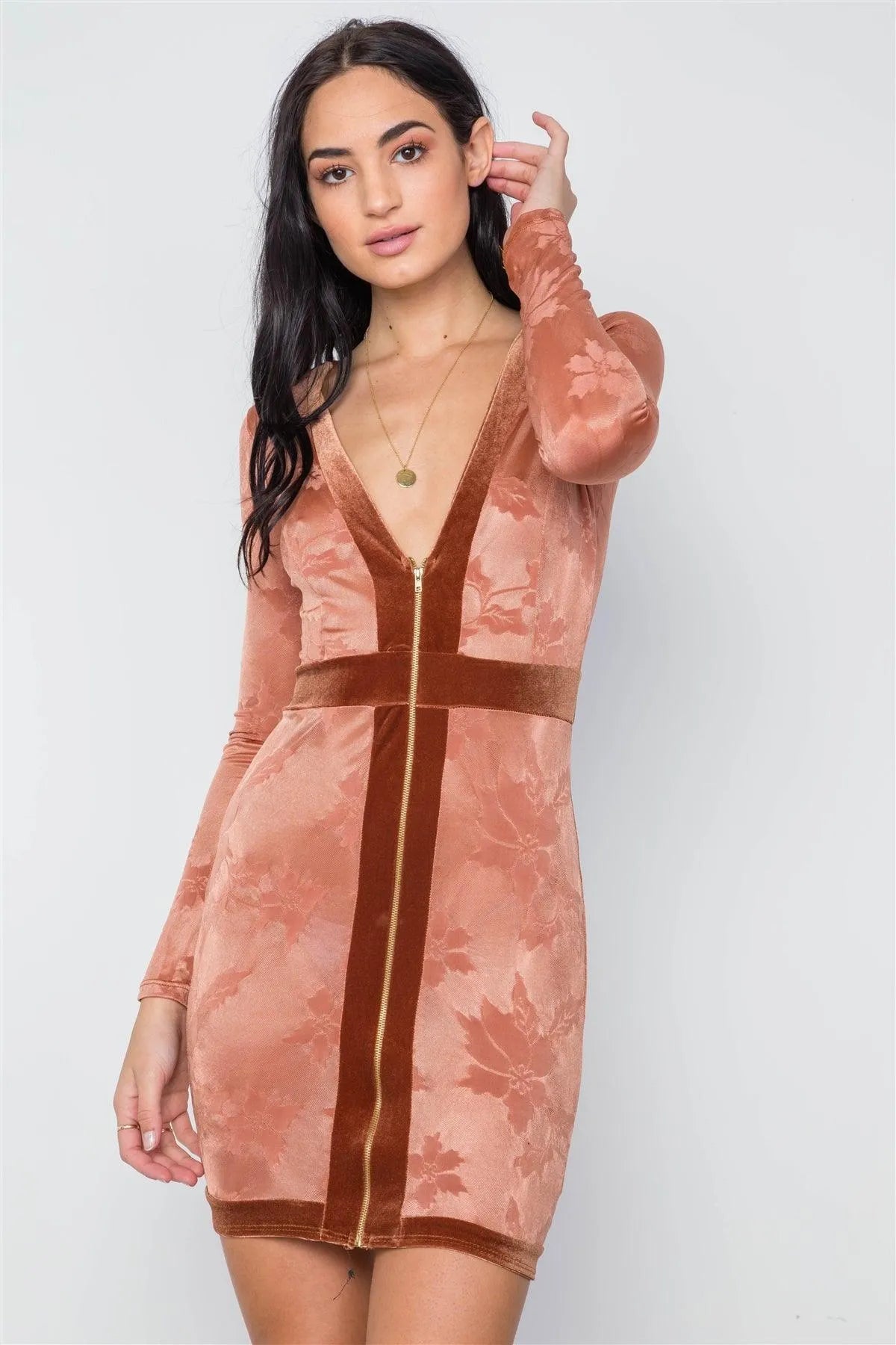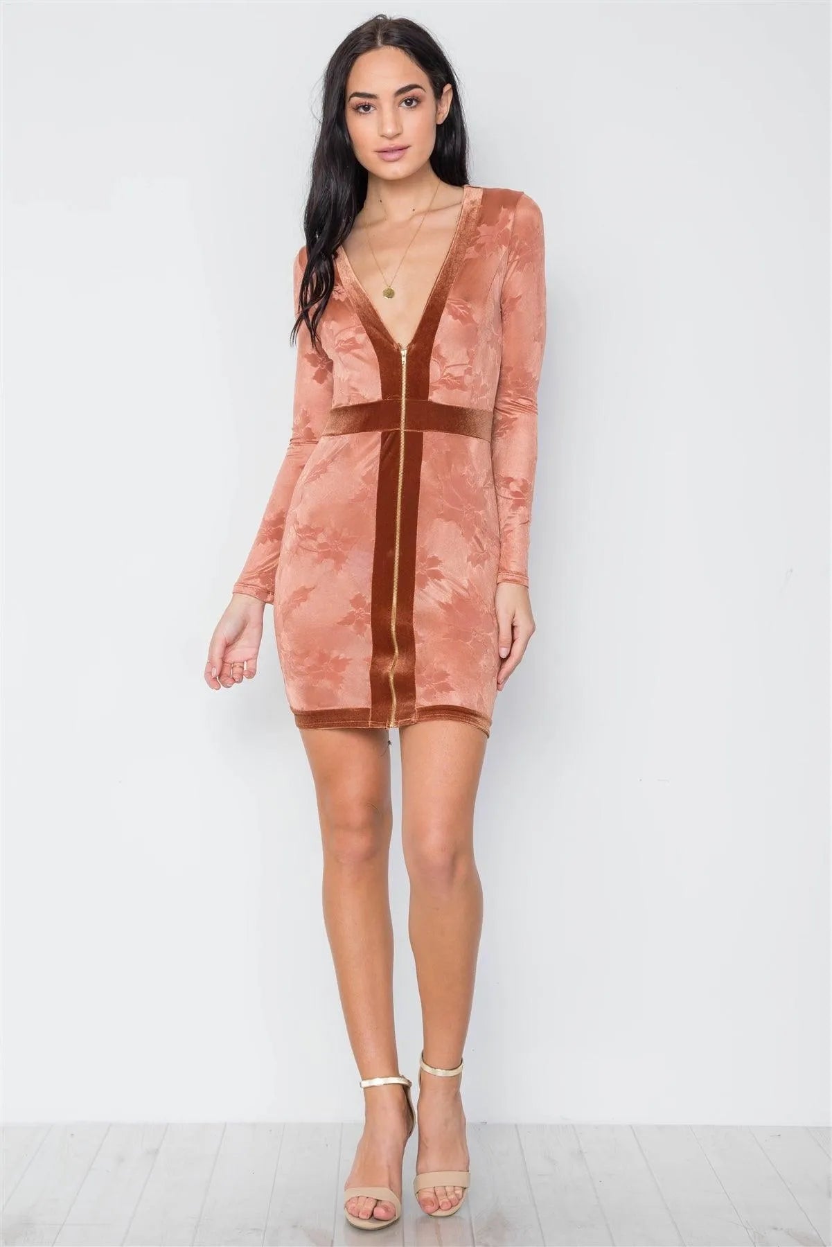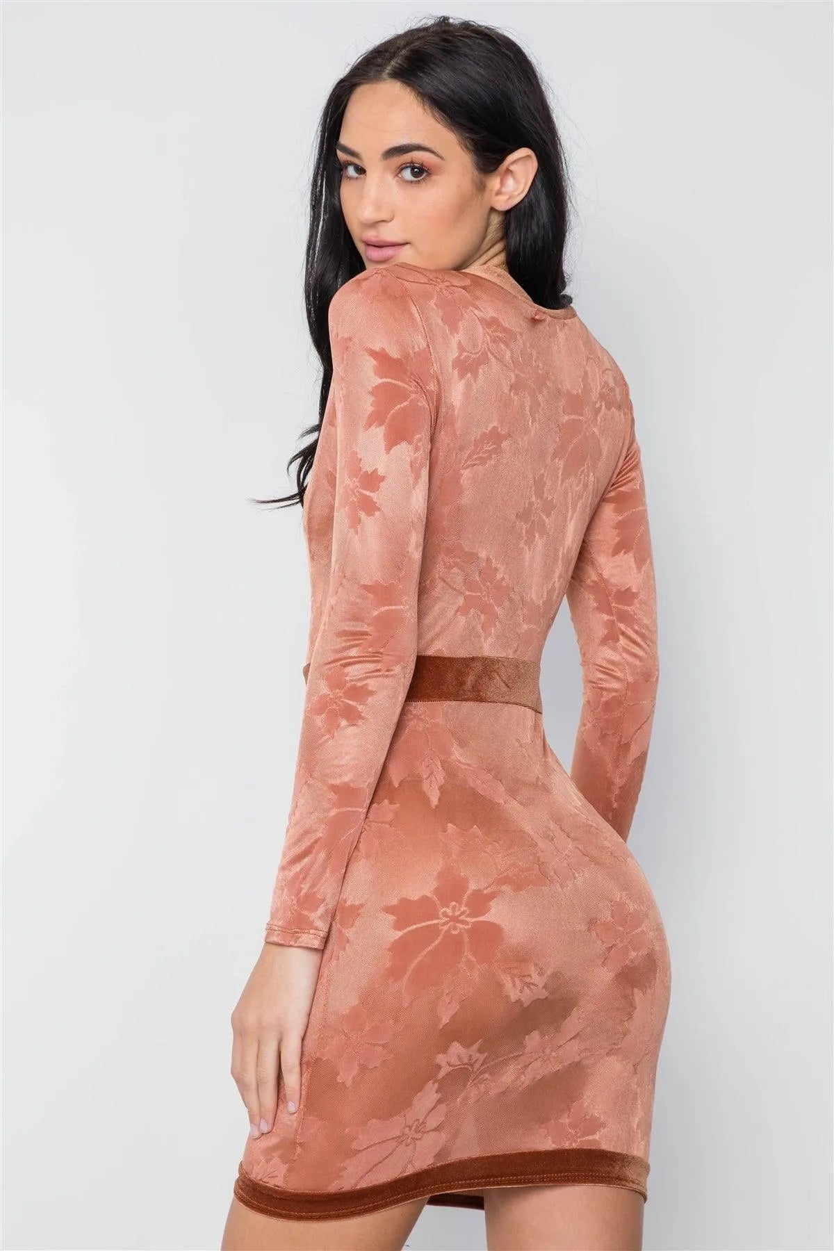 Dress features: Sheer, front zipper closure, long sleeves silhouette, bodycon, plunge "V" neckline, mini length, velvet trim detail.Model is 5'9 wearing a size Small ( Waist: 24", Bust: 32B, Hips: 34")Item measurements: Length: 34", Bust: 34", Sleeve Length: 25"True to size Available in Black