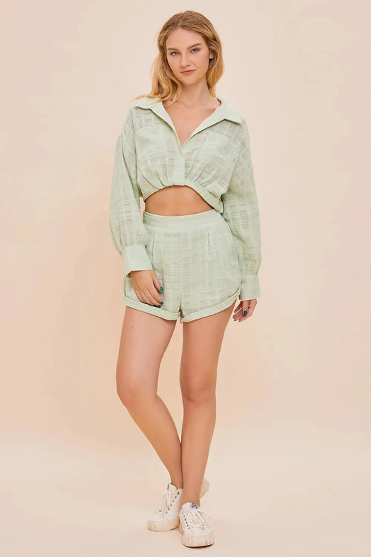 Textured Long Sleeve Button Front Shirt & Mini Skirt SetVendor:Hyfve