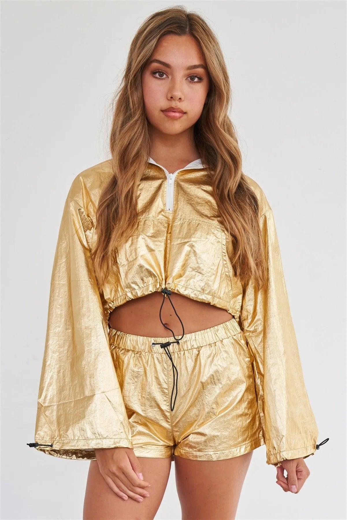 Metallic Gold Water Proof Hooded Draw String Crop Top & Short Sporty Activewear Set