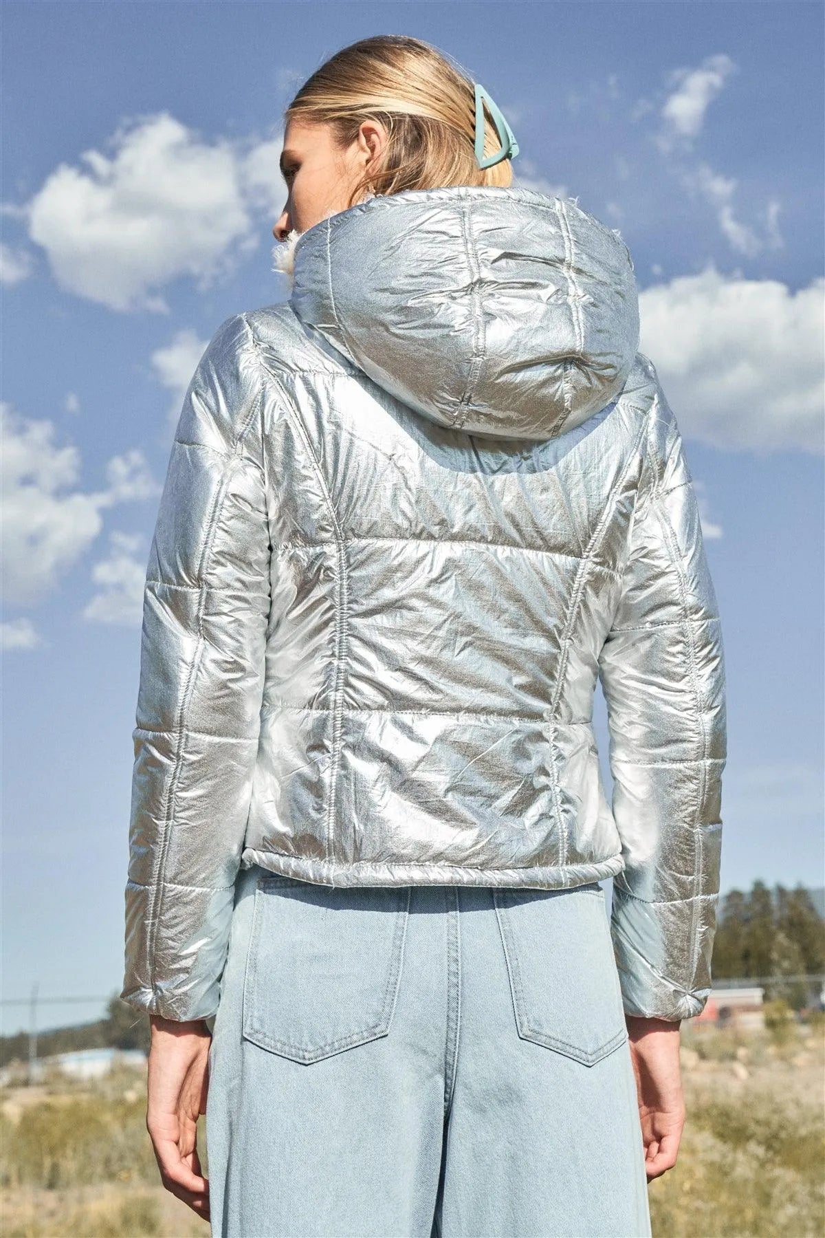 Metallic Silver Long Sleeve Fuzzy Faux Fur Hood Padded Jacket /1-1-1-1