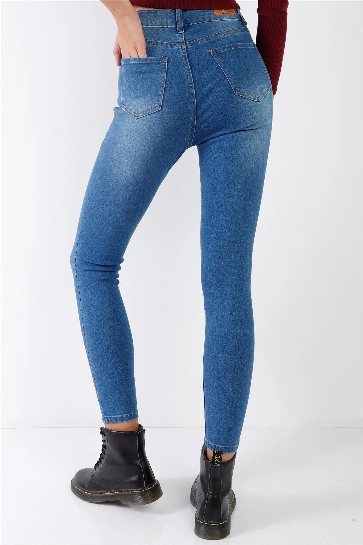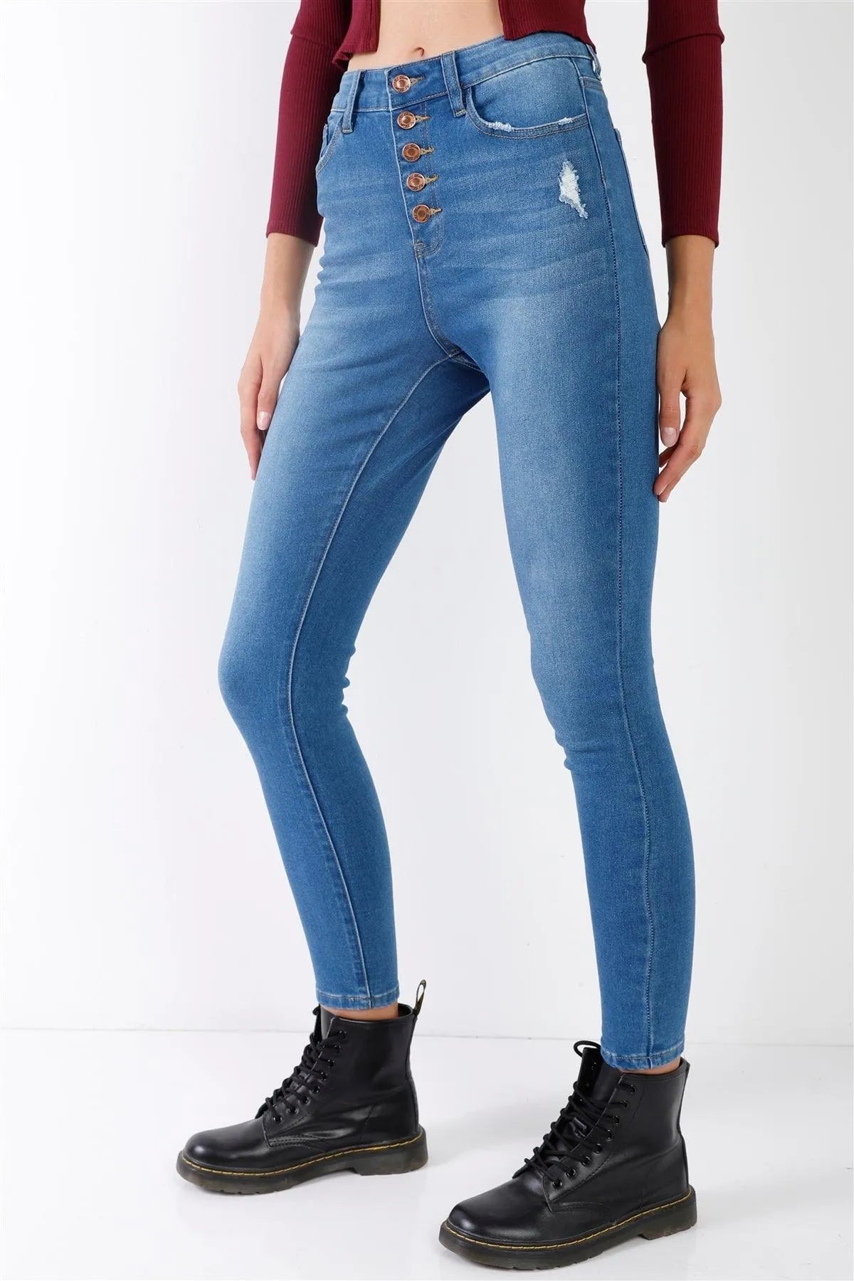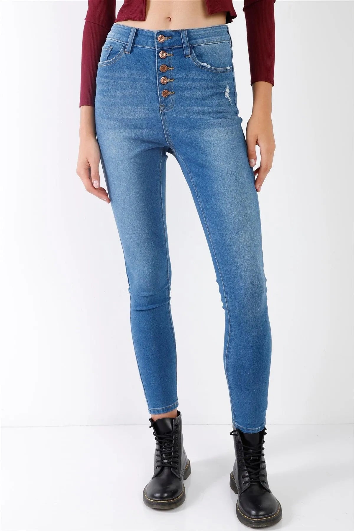 Mid Blue High-Waisted Button Fly Skinny Denim Jeans /1-1-3-2-2-1-1