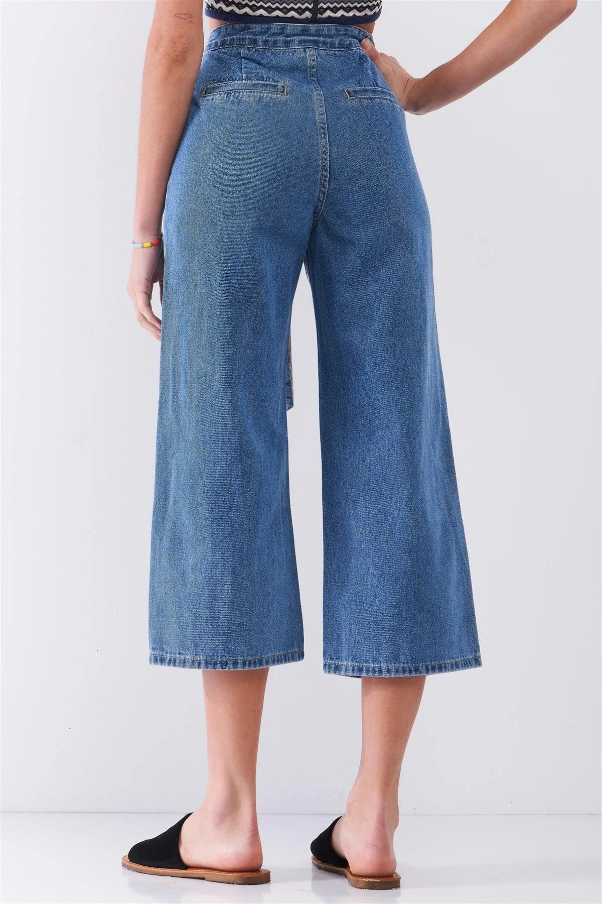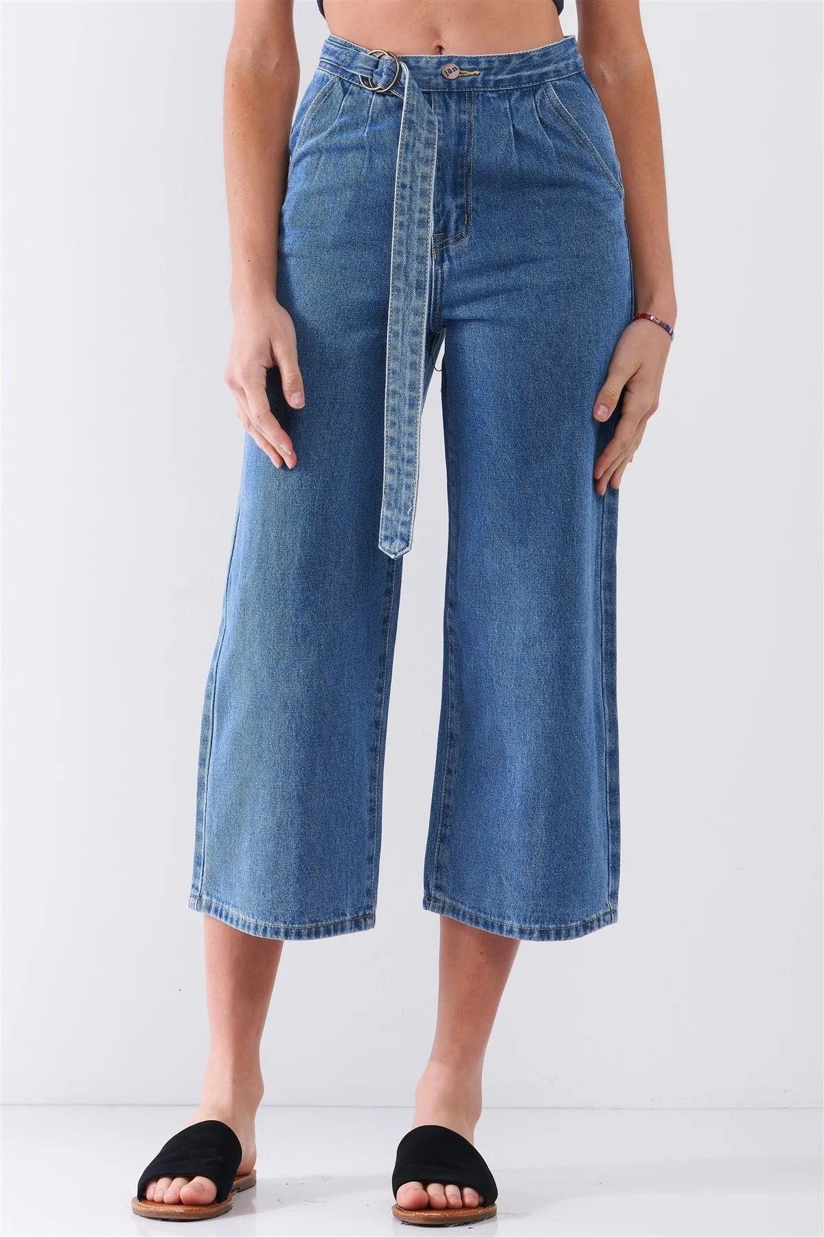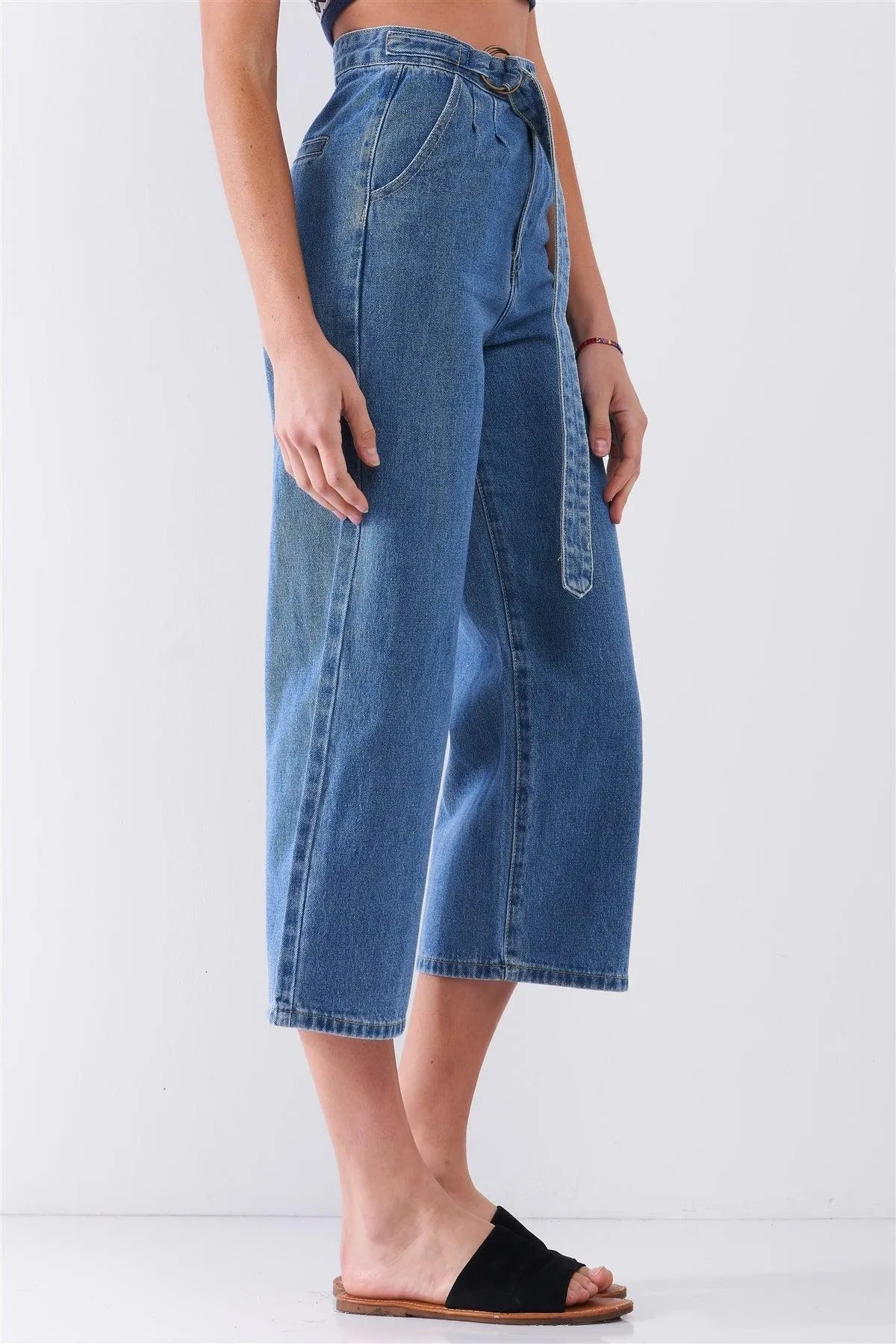 Mid-Blue High-Waisted Cropped Wide Leg Self-Tie D-Ring Belt Denim Pants /1-1-2-2-1-1