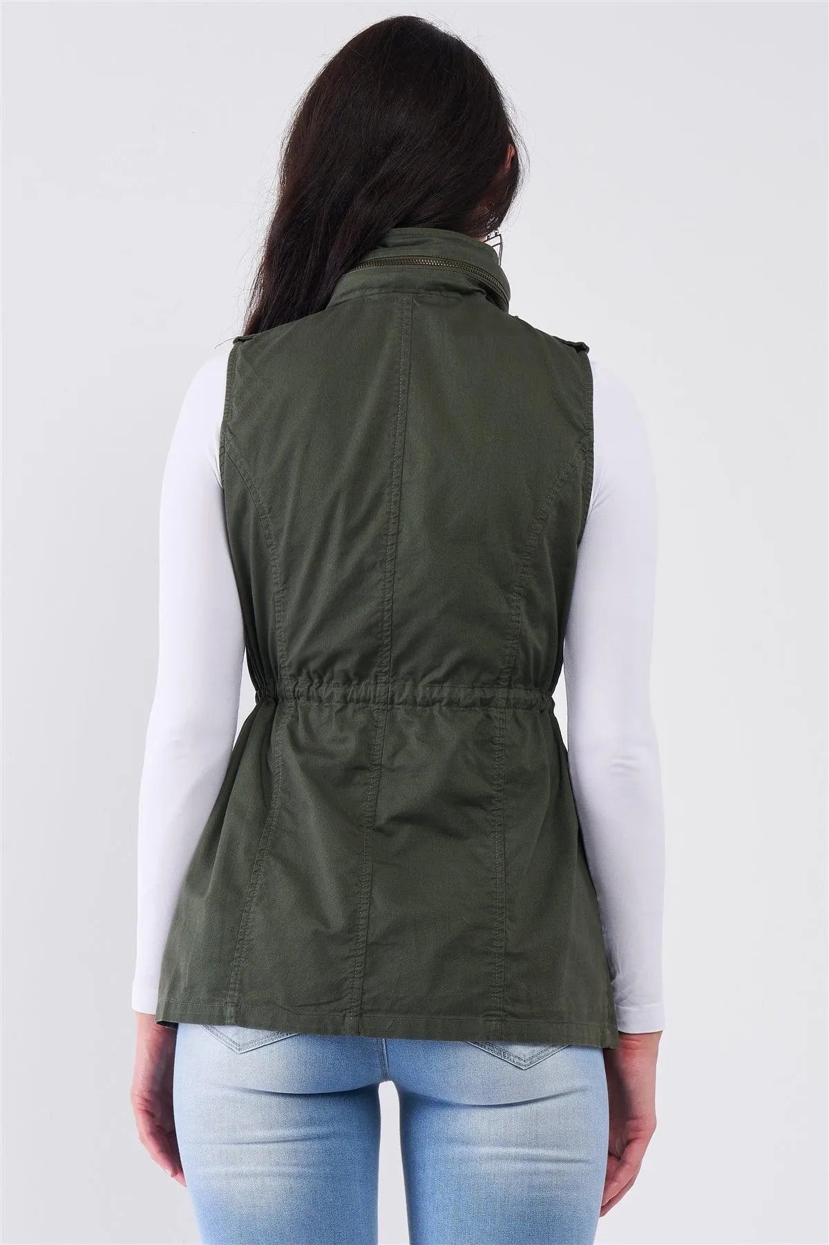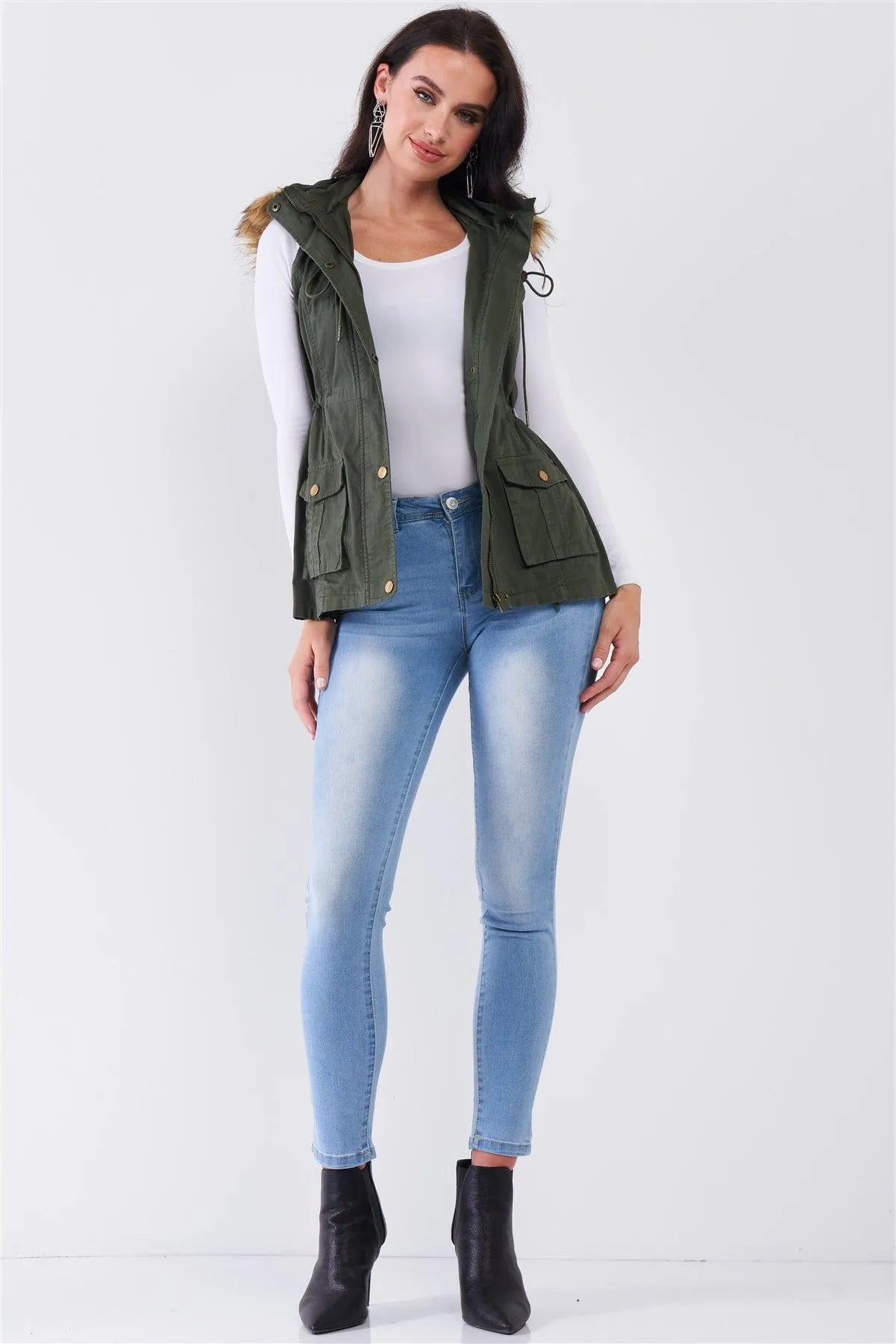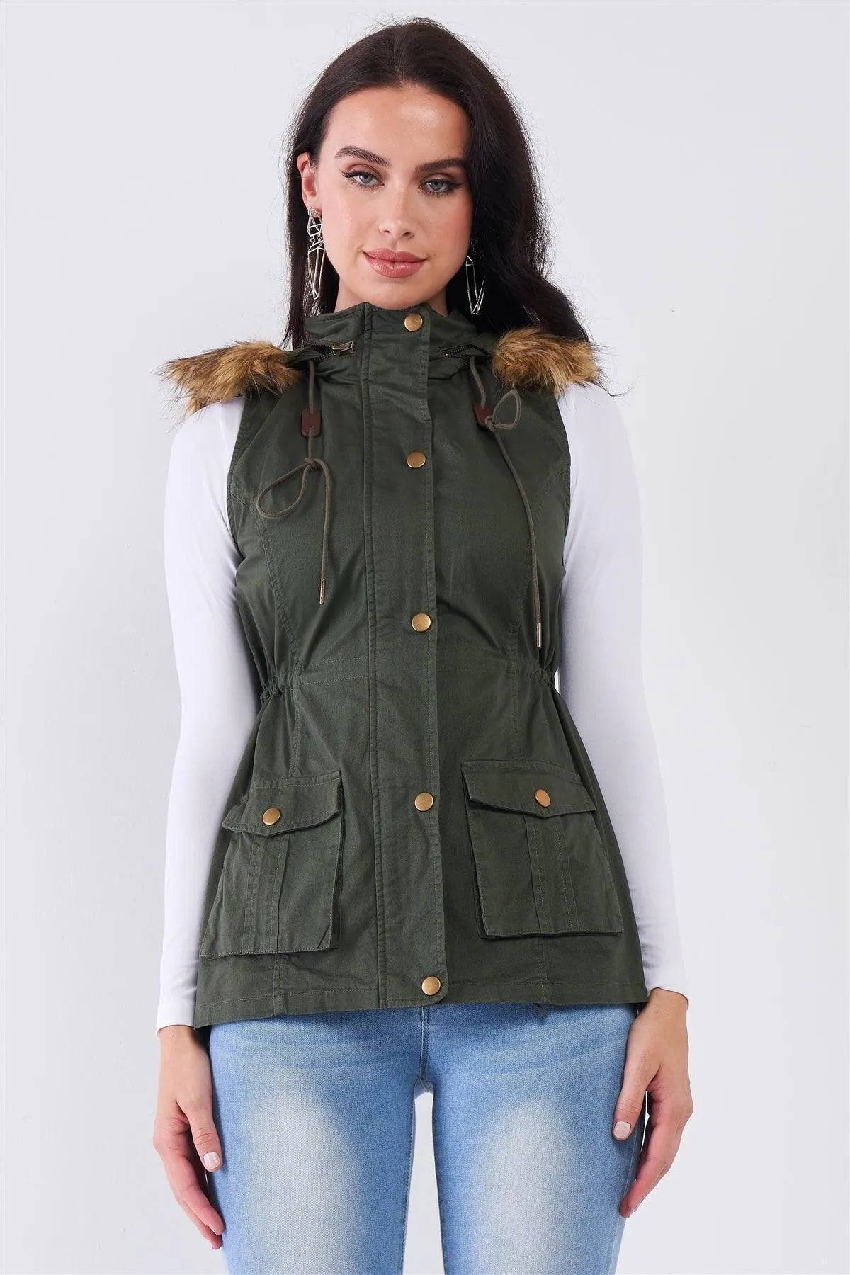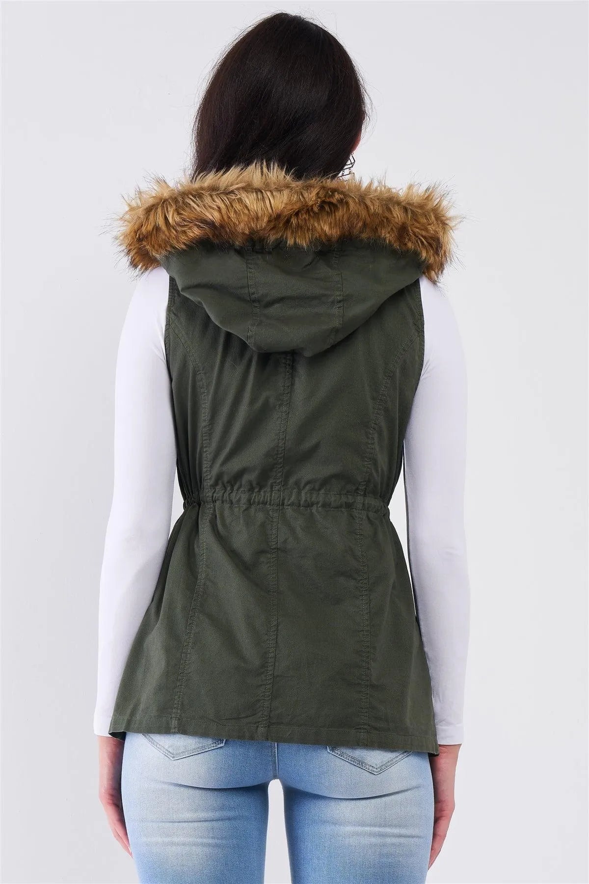 Military Olive Sleeveless Foldable Hood With Detachable Faux Fur Trim Parka Vest /1-3