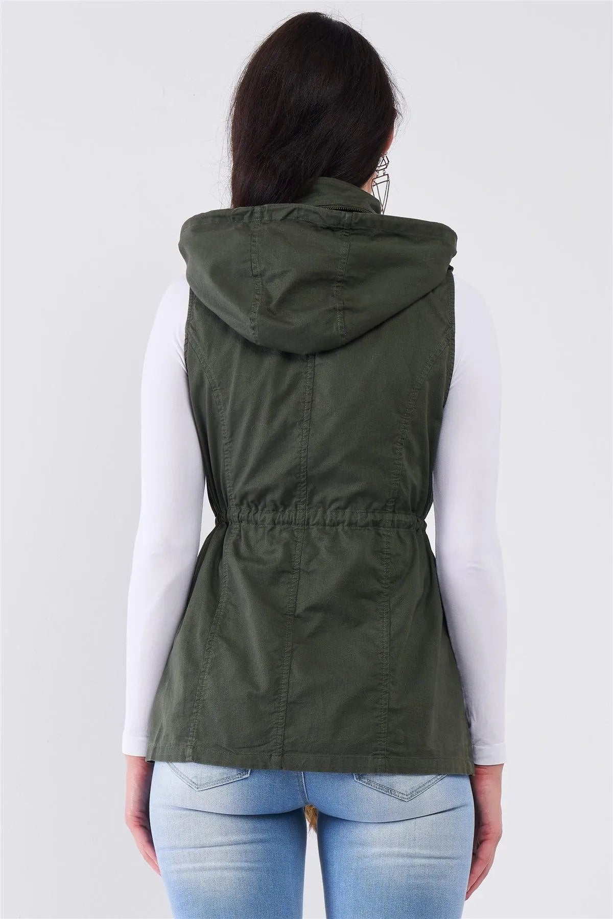 🖤 Item features: Military olive, solid, sleeveless, foldable hood with detachable faux fur trim, hood can be hidden and zipped, adjustable hood strings with brown faux leather detail, front zip-up and button closure, inner self-tie waist drawstring, two square envelope pockets with button closure, parka inspired, unlined, must-have this fall, comfy, warm