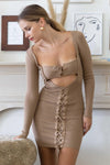 🖤 Item Features: Milk coffee, knit material, cut-out detail, bandage self-tie top, lace down details, long sleeves, slim fit, mini length, stretchy, not see through, unlined, chic, hot, sexy, trendy, stylish, eye-catching.