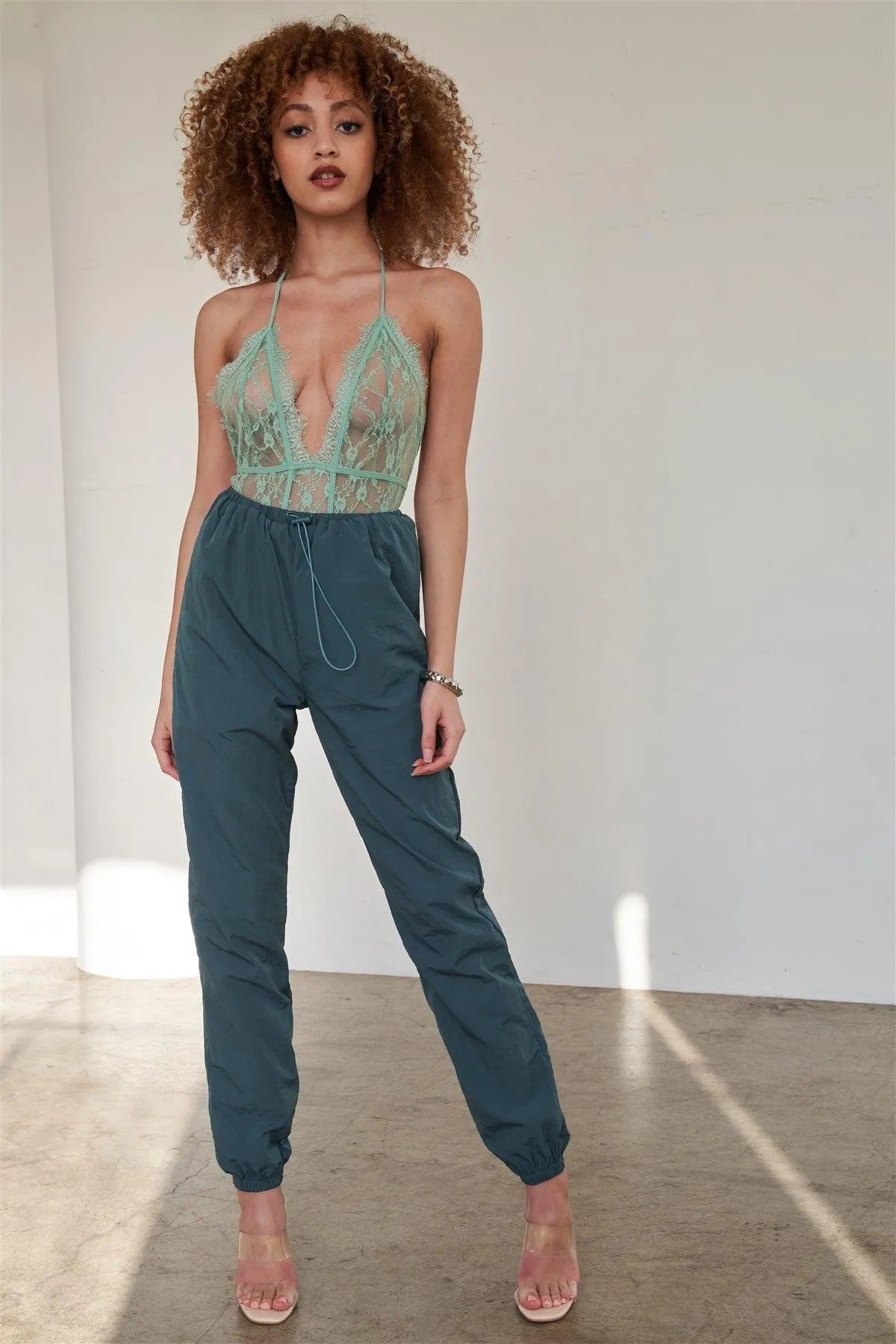 Mint Floral Lace Stretchy Halter Tie Plunge V-Neck Bodysuit