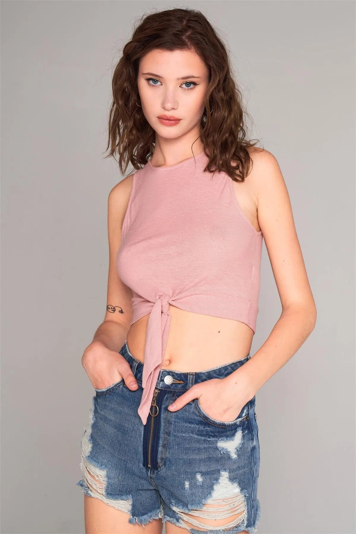 Misty Rose Sleeveless Crew Neck Self-Tie Front Detail Crop Top /1-2-2-1