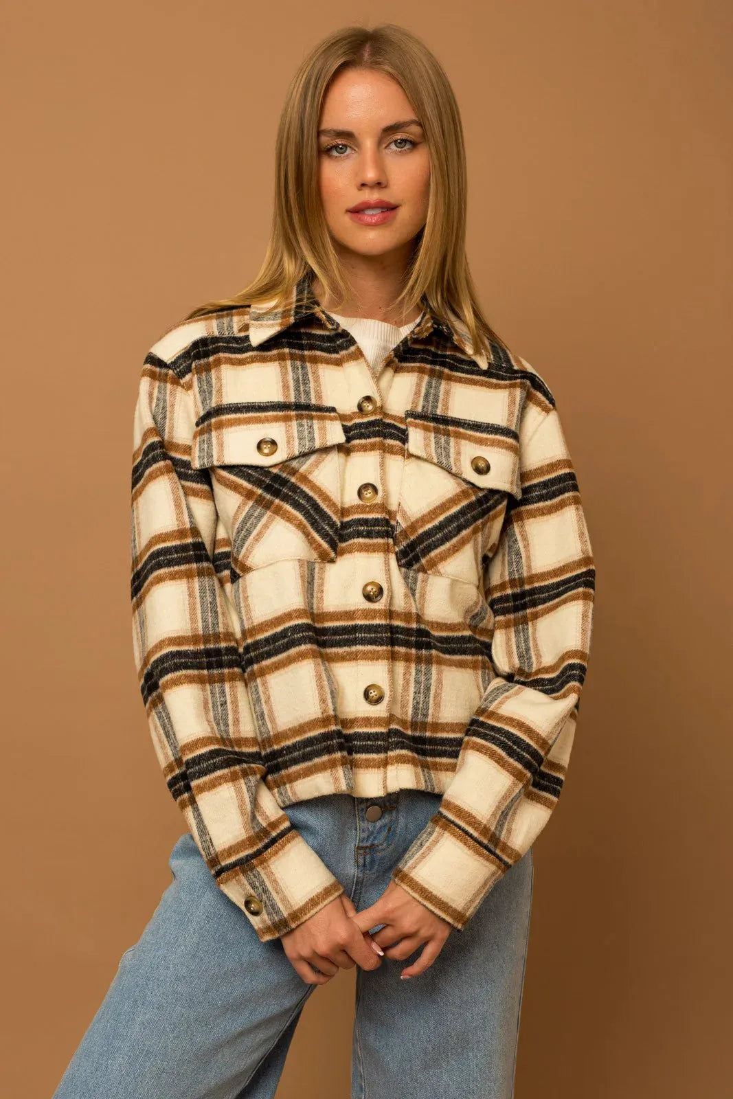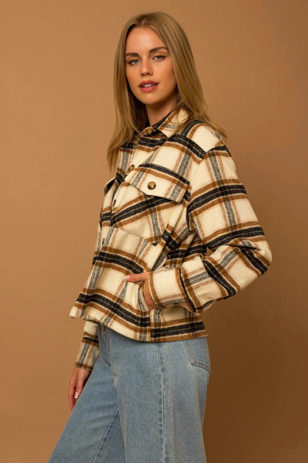 Women jacket shacket, plaid pattern, long sleeve, flannel fabric, collar, button down, front two pocket, warm, cozy, stay warm in style this winter!