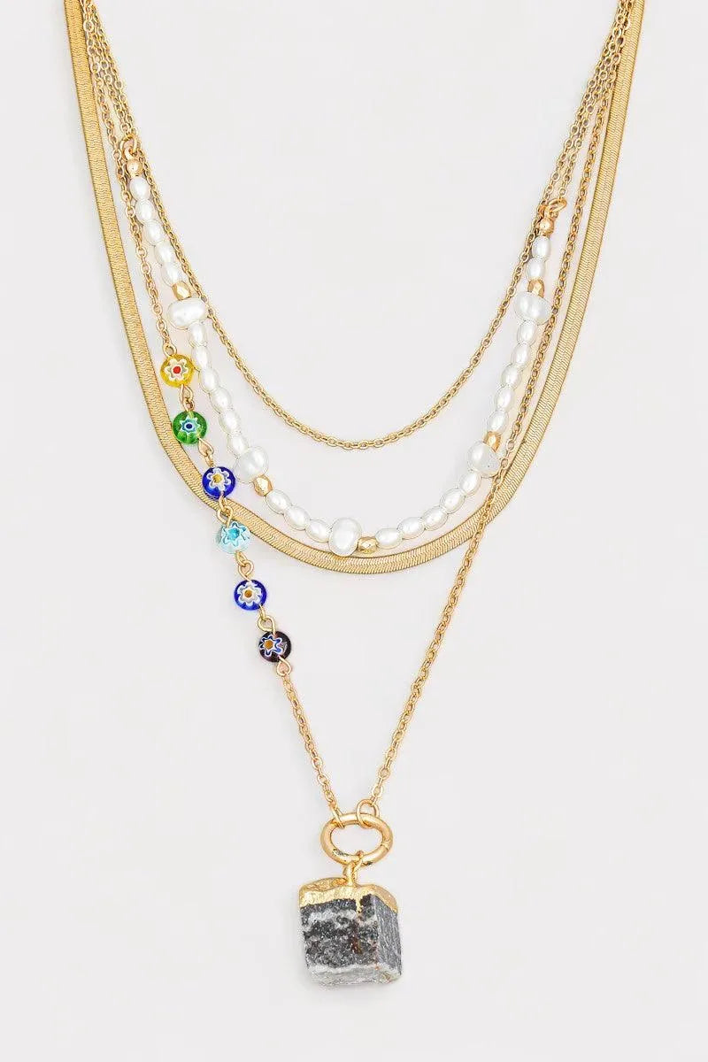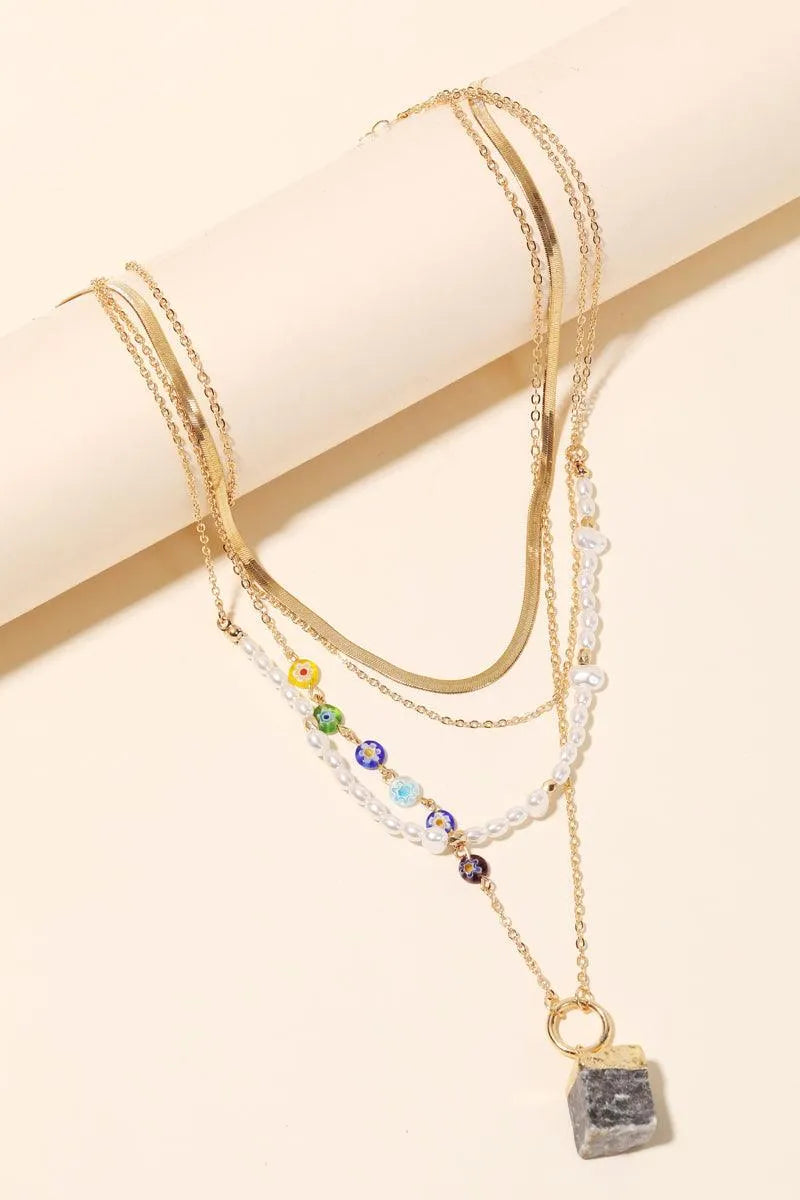 Cube Stone Pendant Layered Chain Pearl Necklace