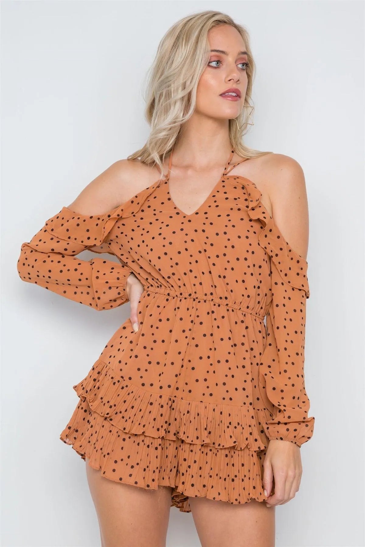 Mocha Chiffon Cold Shoulder Cami Polka Dot Romper /1-3-2-1