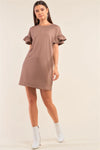 Mocha Loose Fit Crew Neck Ruffle Sleeve Detail T-Shirt Mini Dress /2-2-2