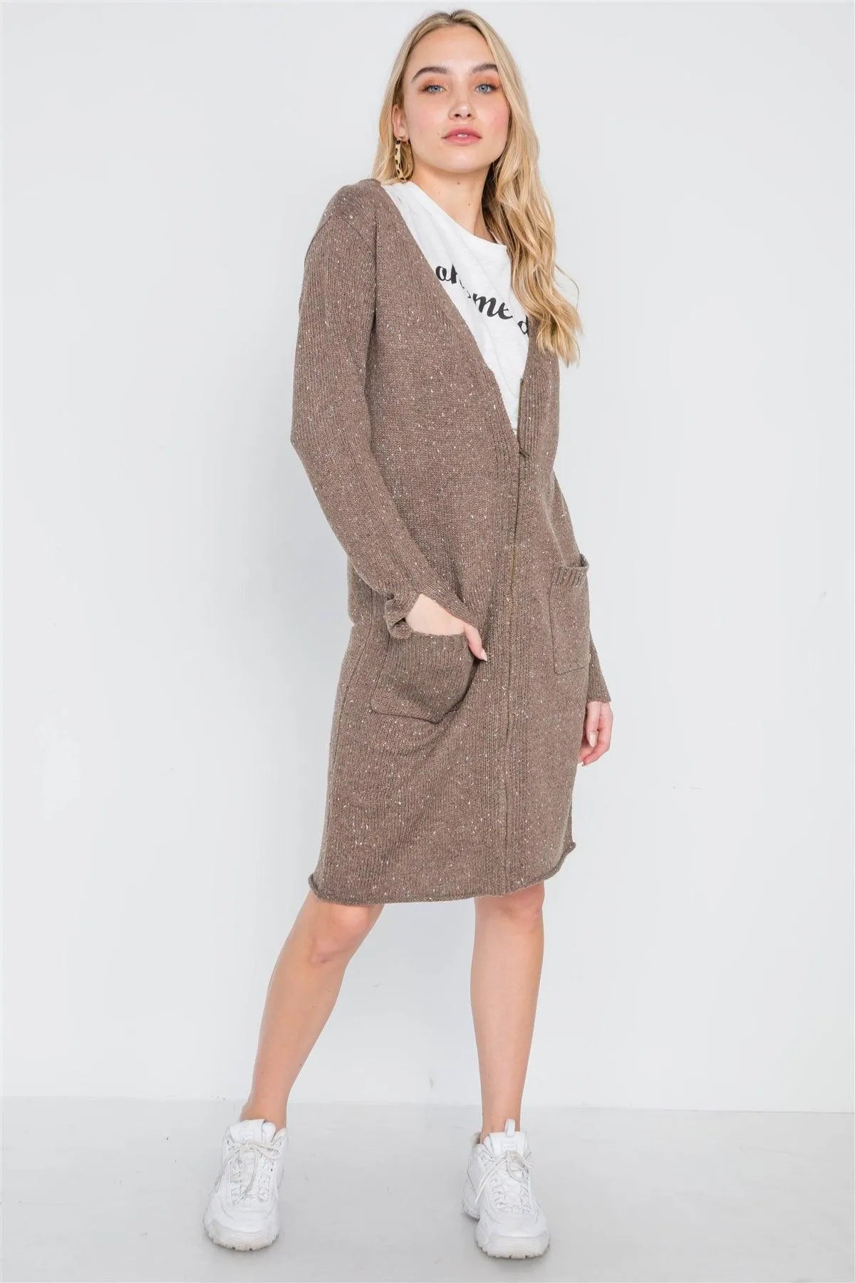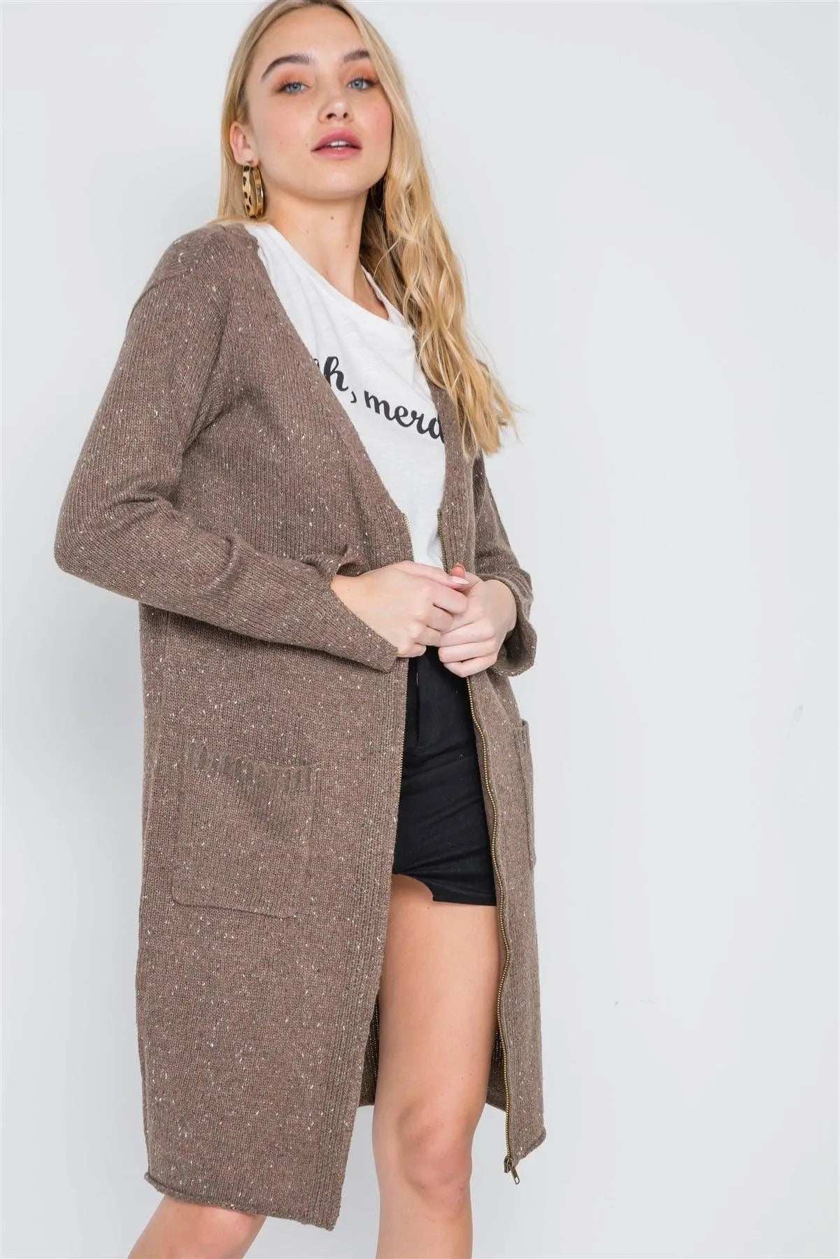 Mocha Heathered Long Sleeve Zip-Up Cardigan /2-2-2