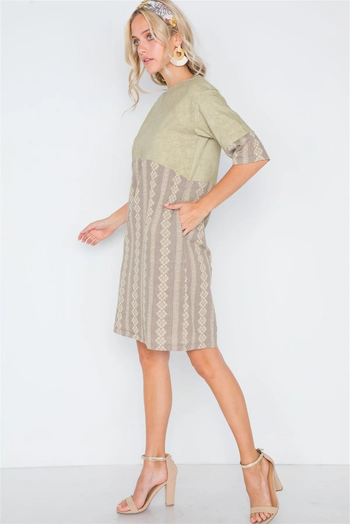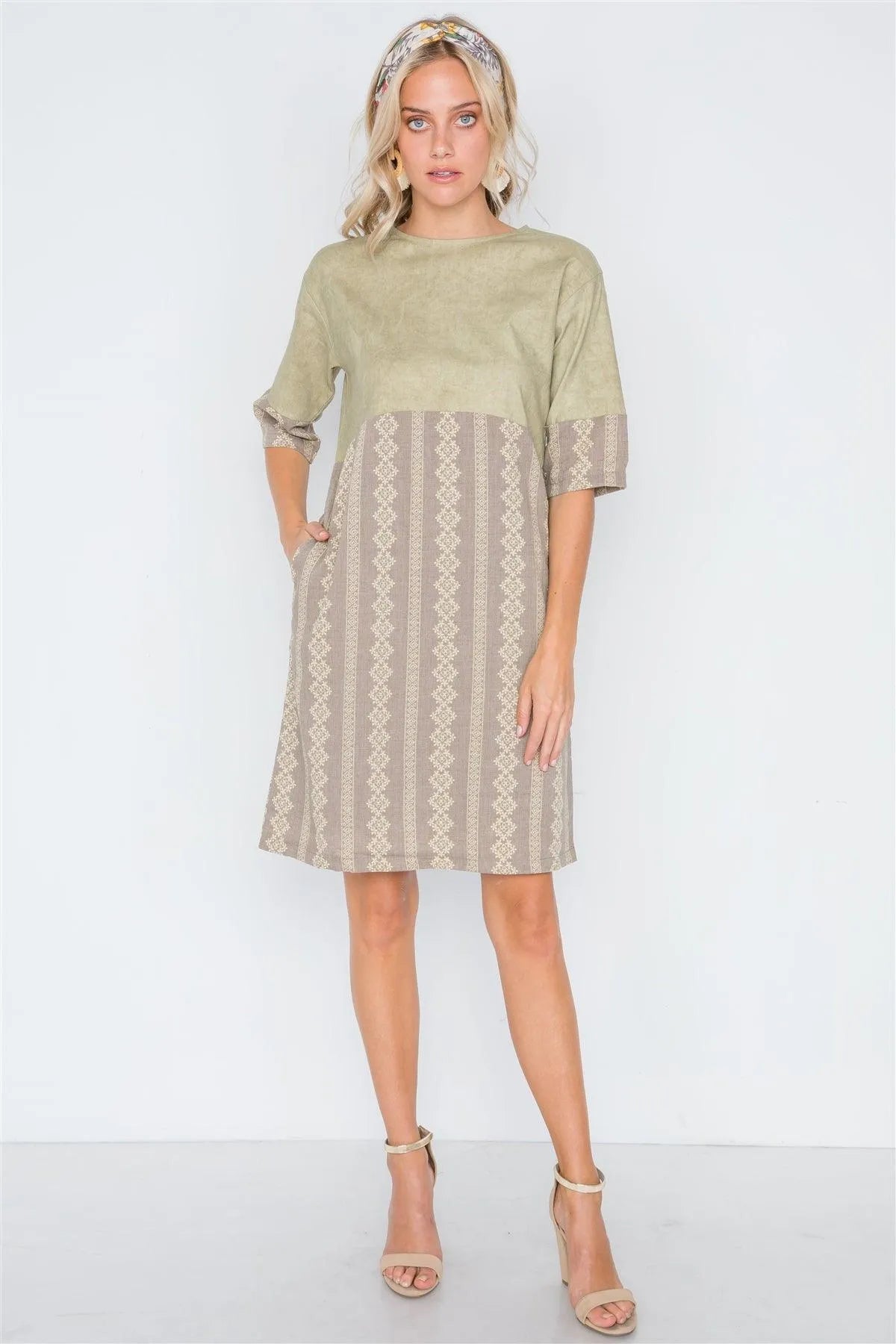 Mocha Olive Contrast Design Shift Boho Dress /2-2-2