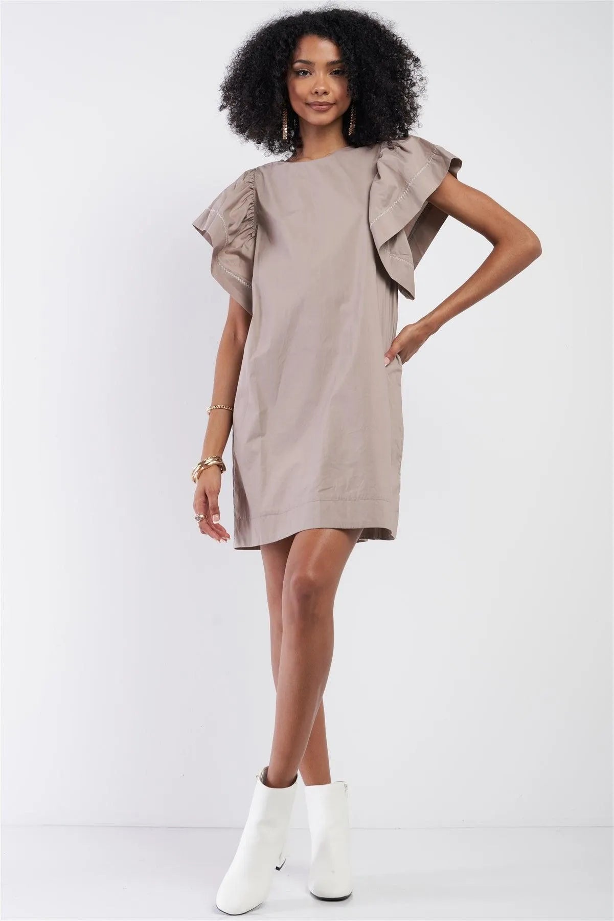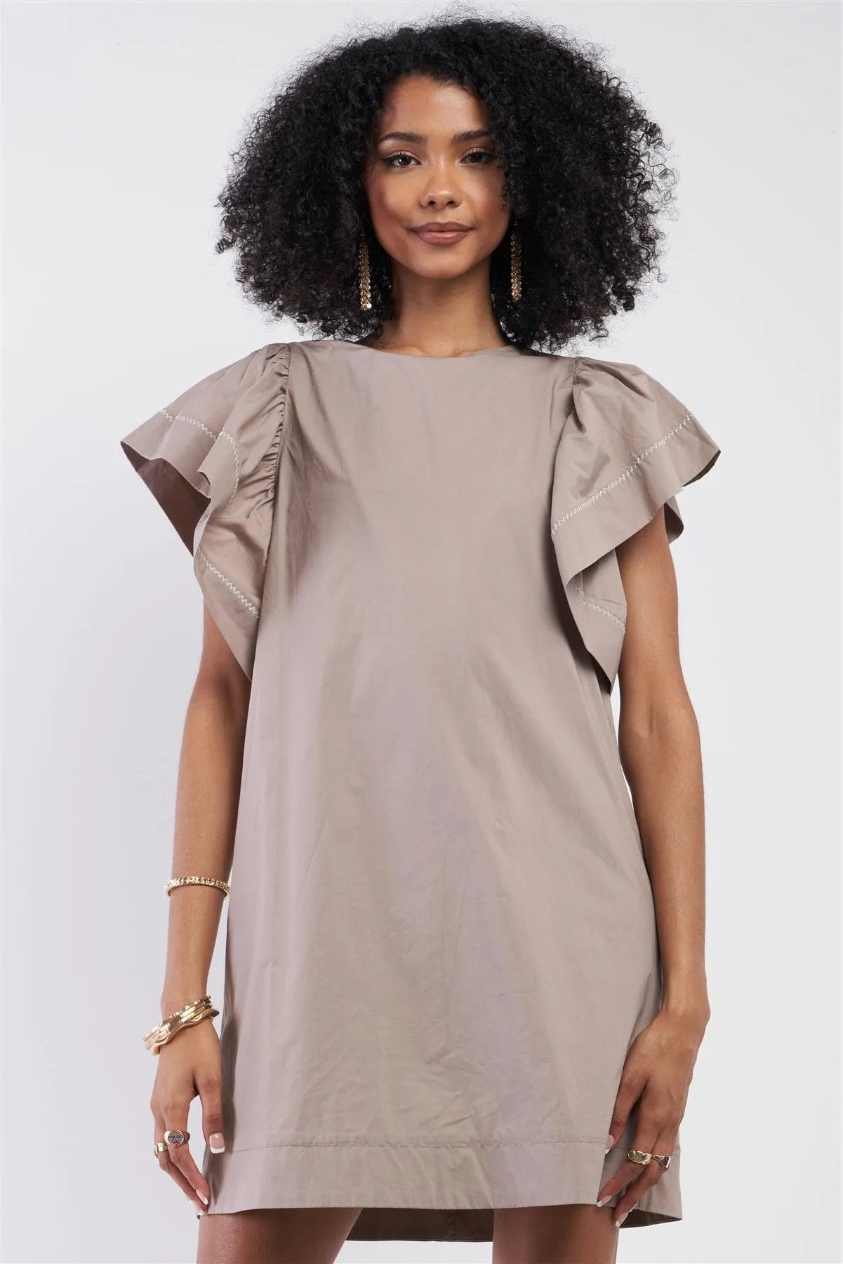Mocha Relax Fit White Stitch Wing Sleeve Round Neck Mini Dress /1-2-2-1