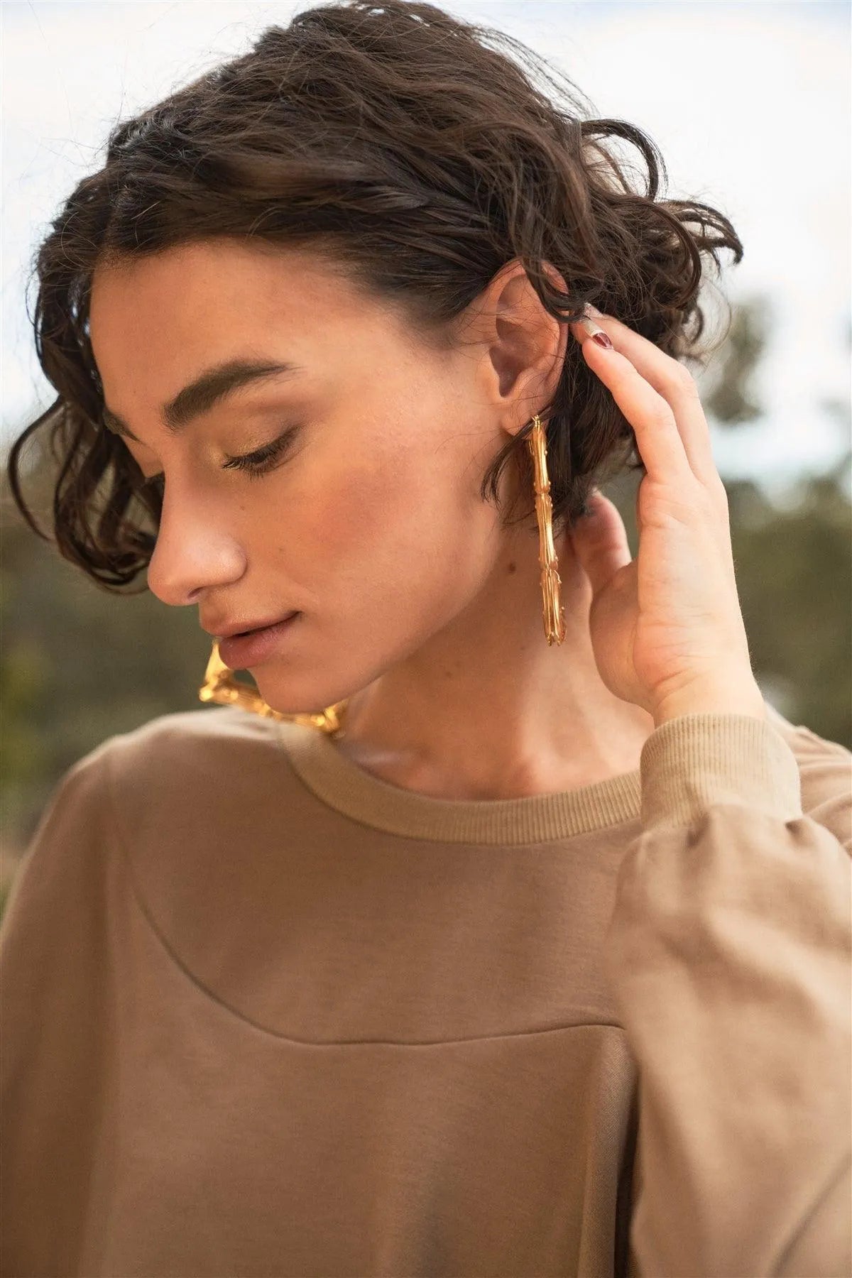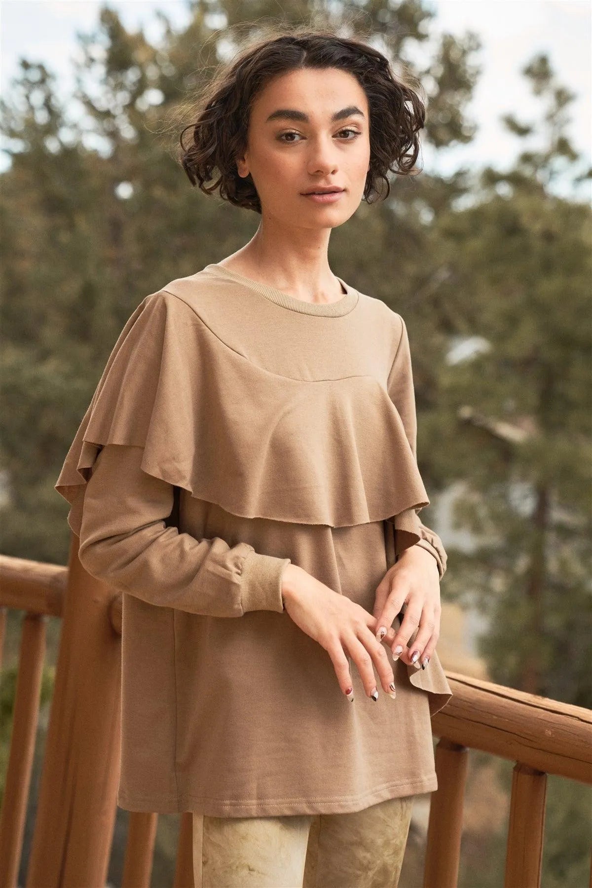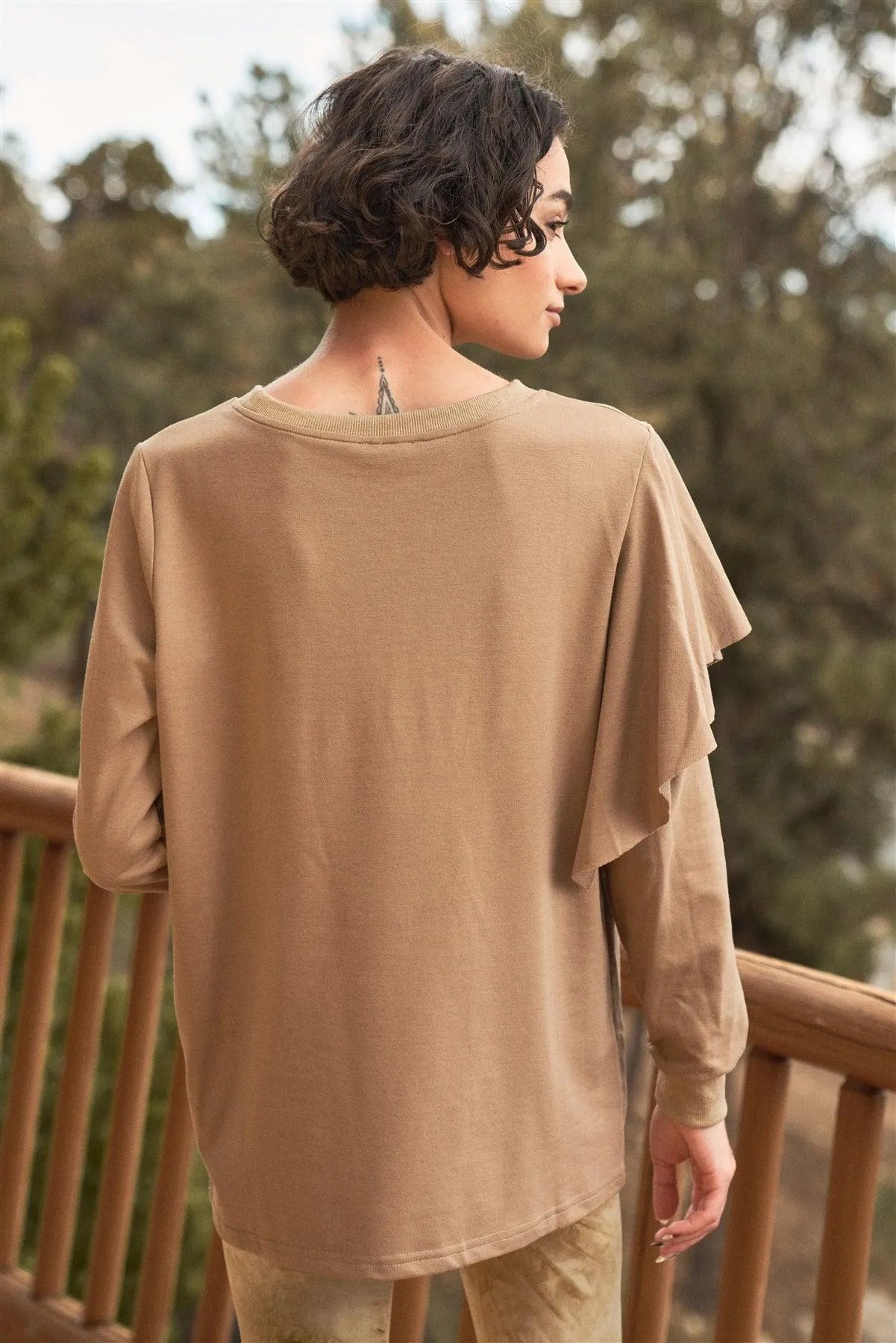 Mocha Ruffled Crew Neck Long Sleeve Top