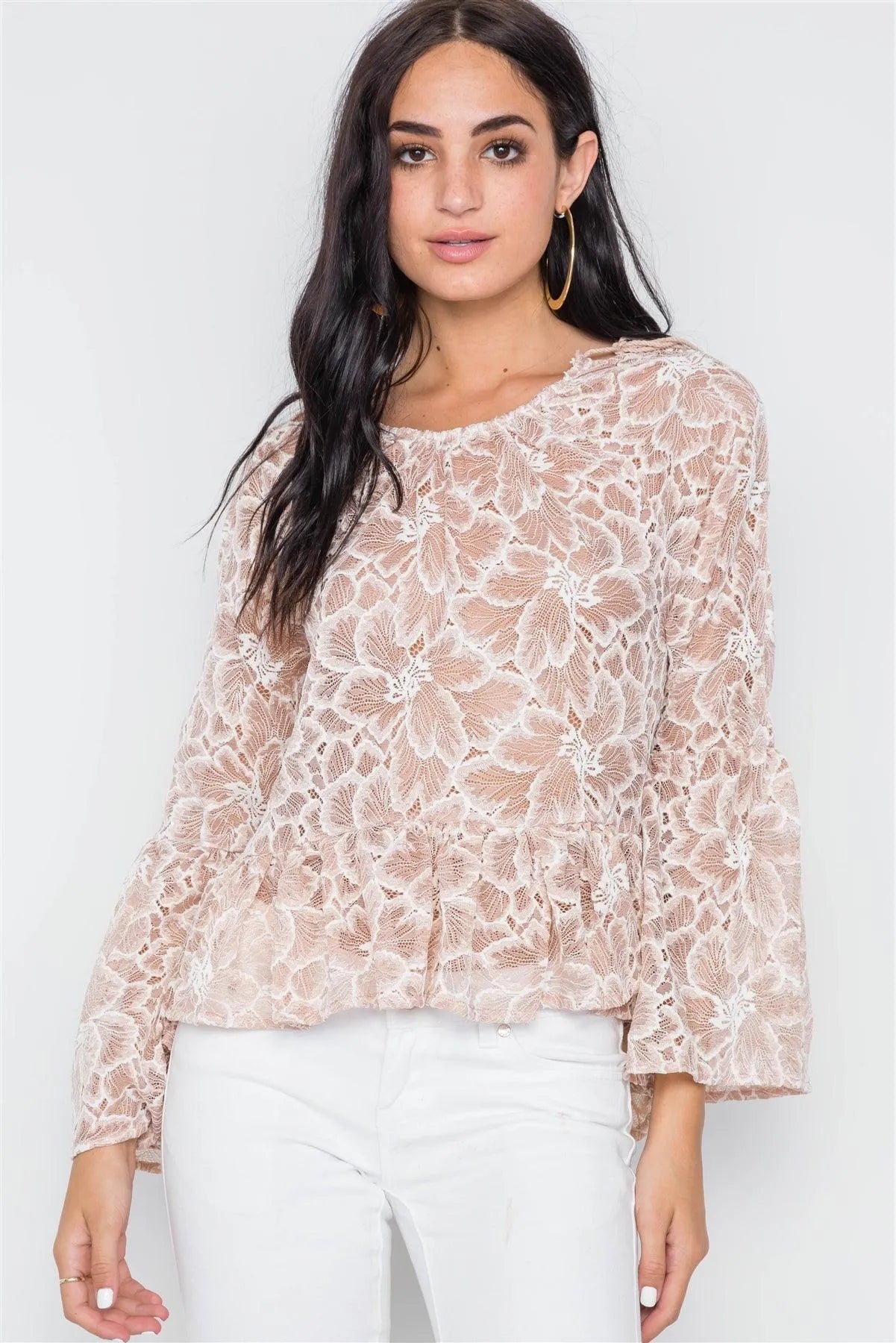 Mocha Sheer Floral Lace Bell Sleeve Top /1-3-2-1