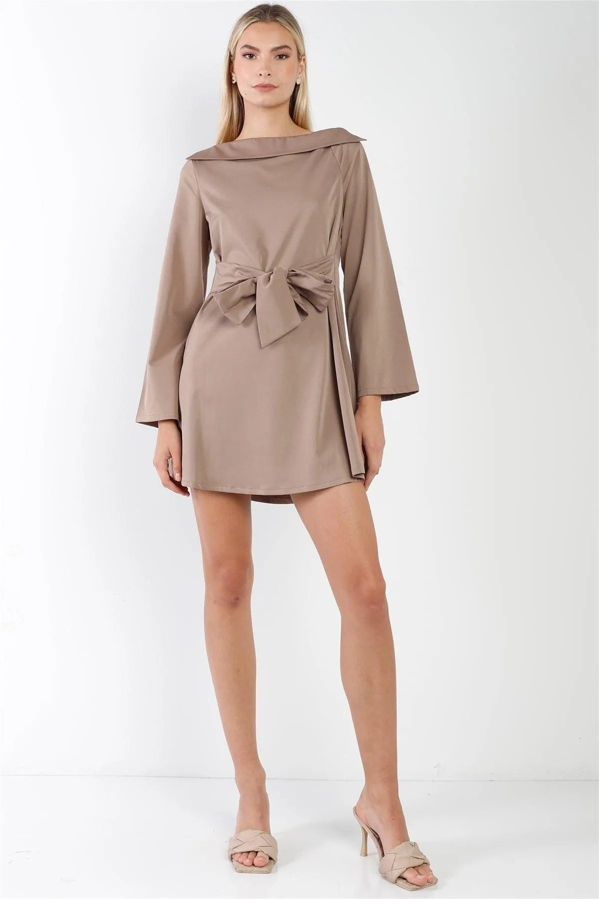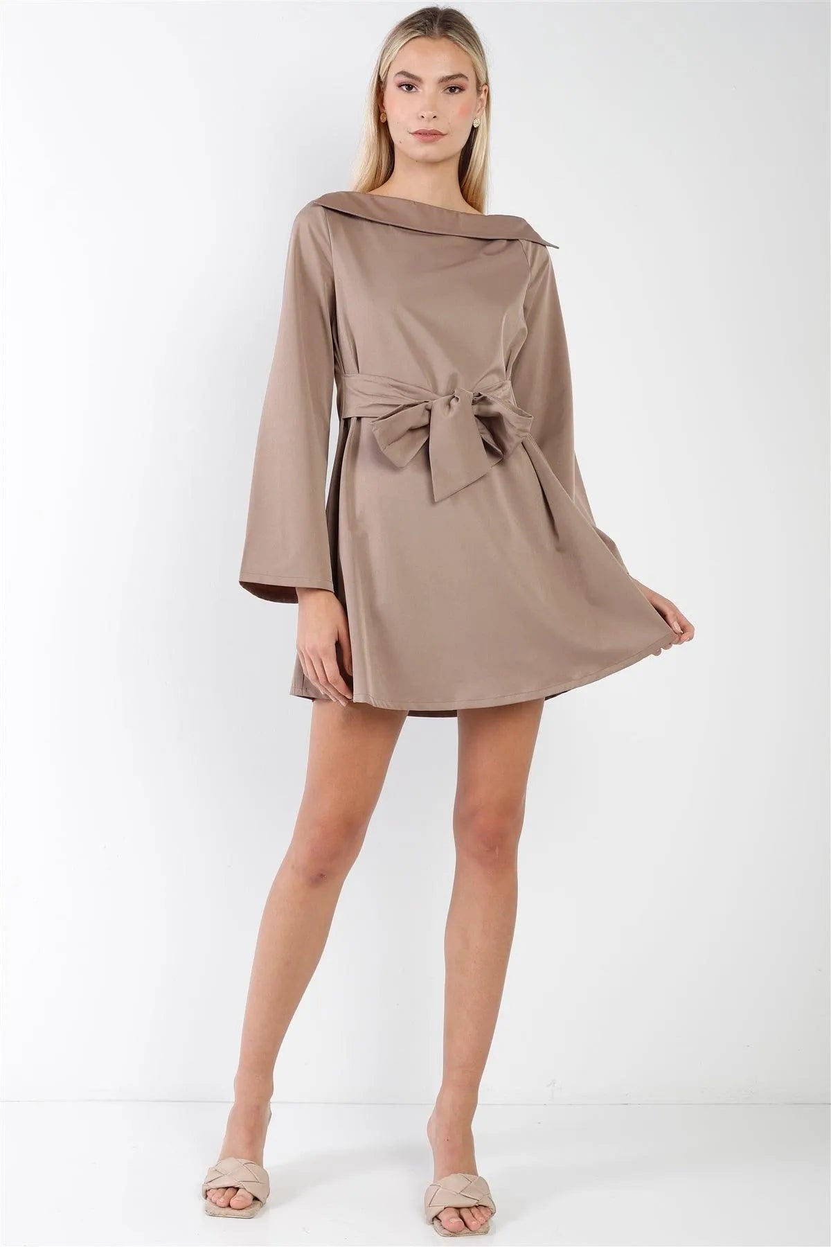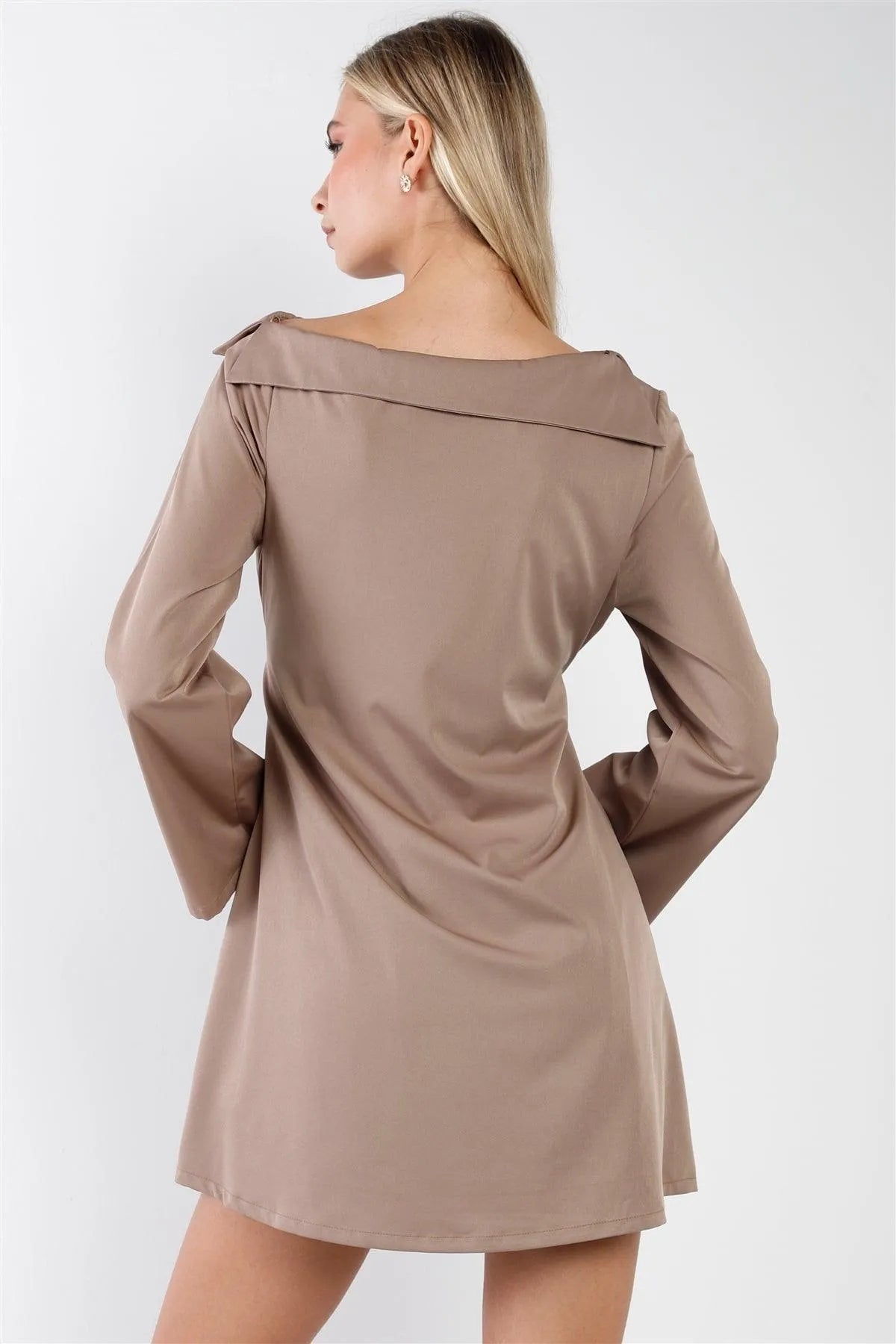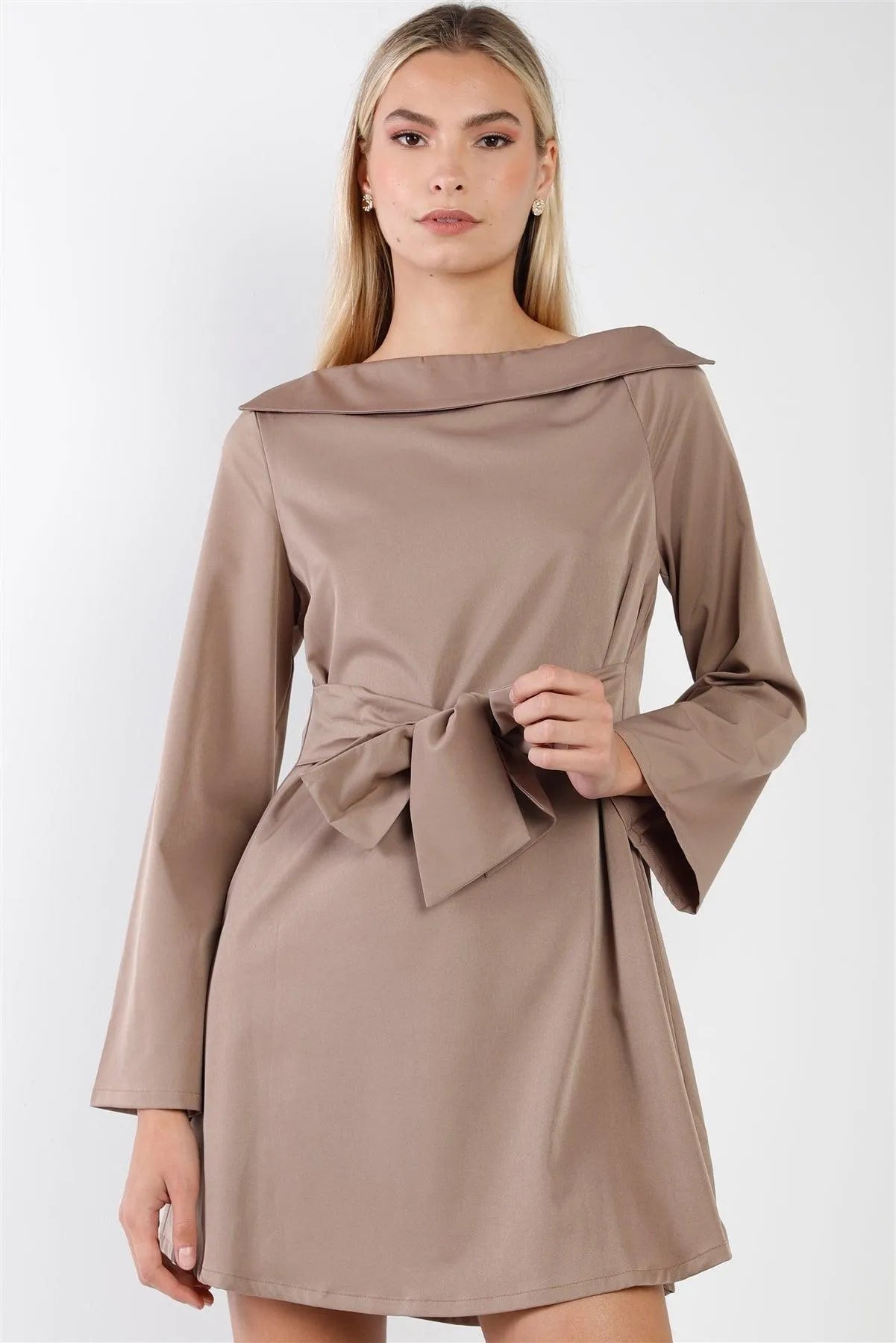 Mocha Straight Neck Solid Front-Tie Long Sleeve Mini Dress /2-2-2