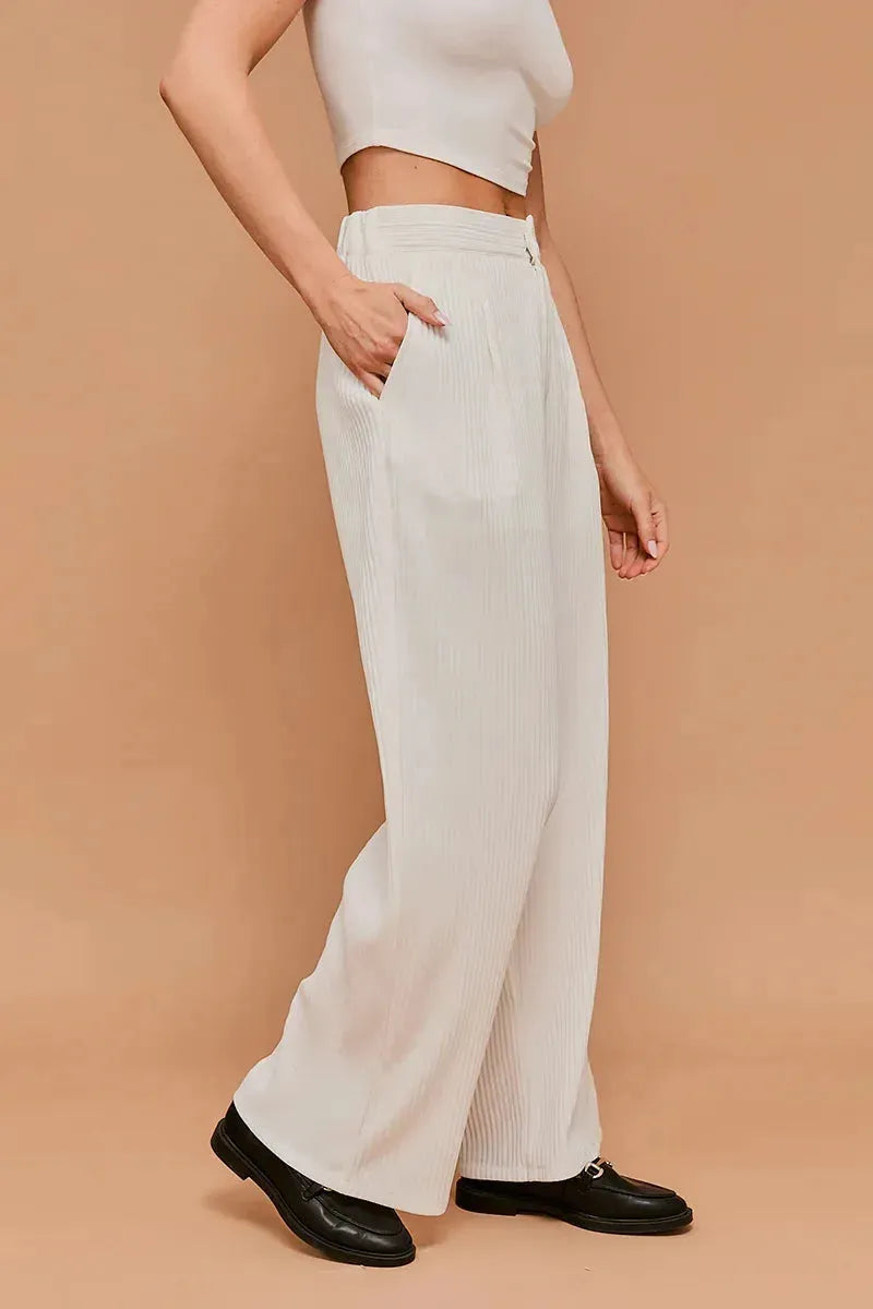 Women pants: stripe texture, ribbed, wide leg, stretchy, elastic waist, lined, two side pocket, zipper and hook closure, elegant, designed for understated sophistication, these lyocell formal trousers are a refined choice for both work and special occasions.
