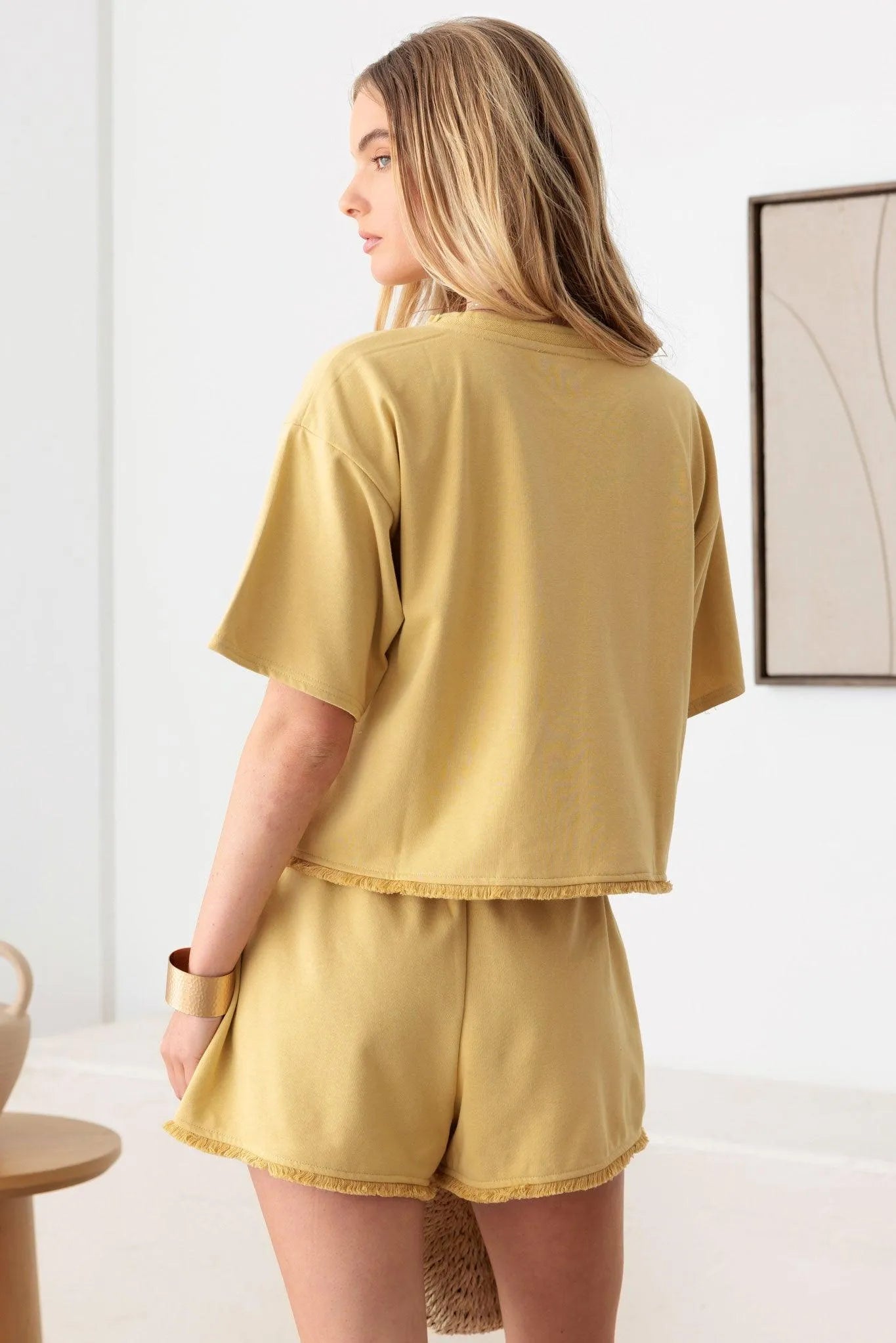 Short Sleeve Fringe Hem Top & Front Pocket Shorts Set