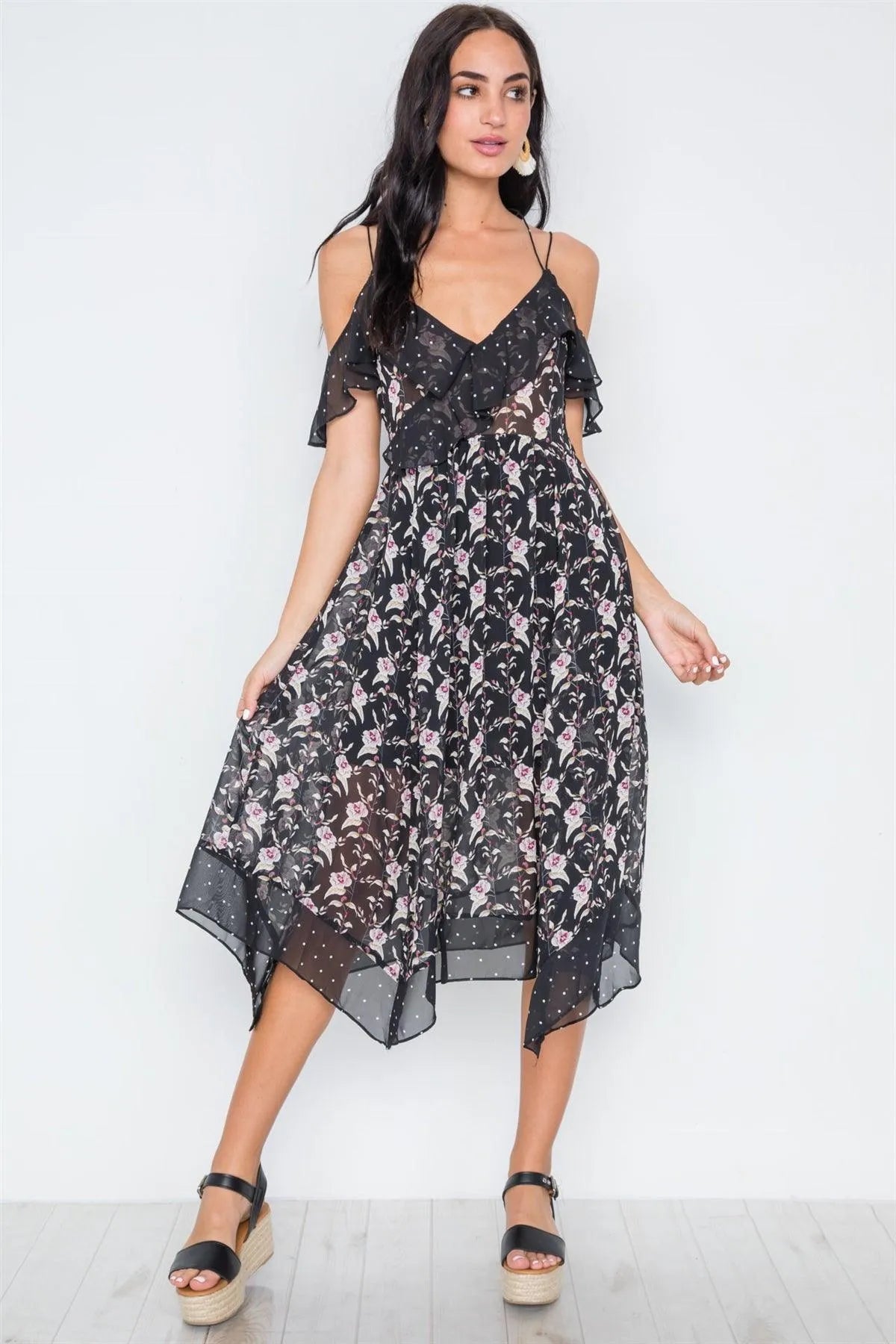 Multi Black Floral Polka Dot Print Flounce Midi Dress /3-2-1