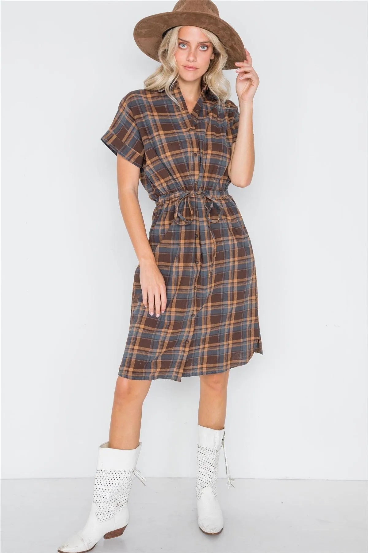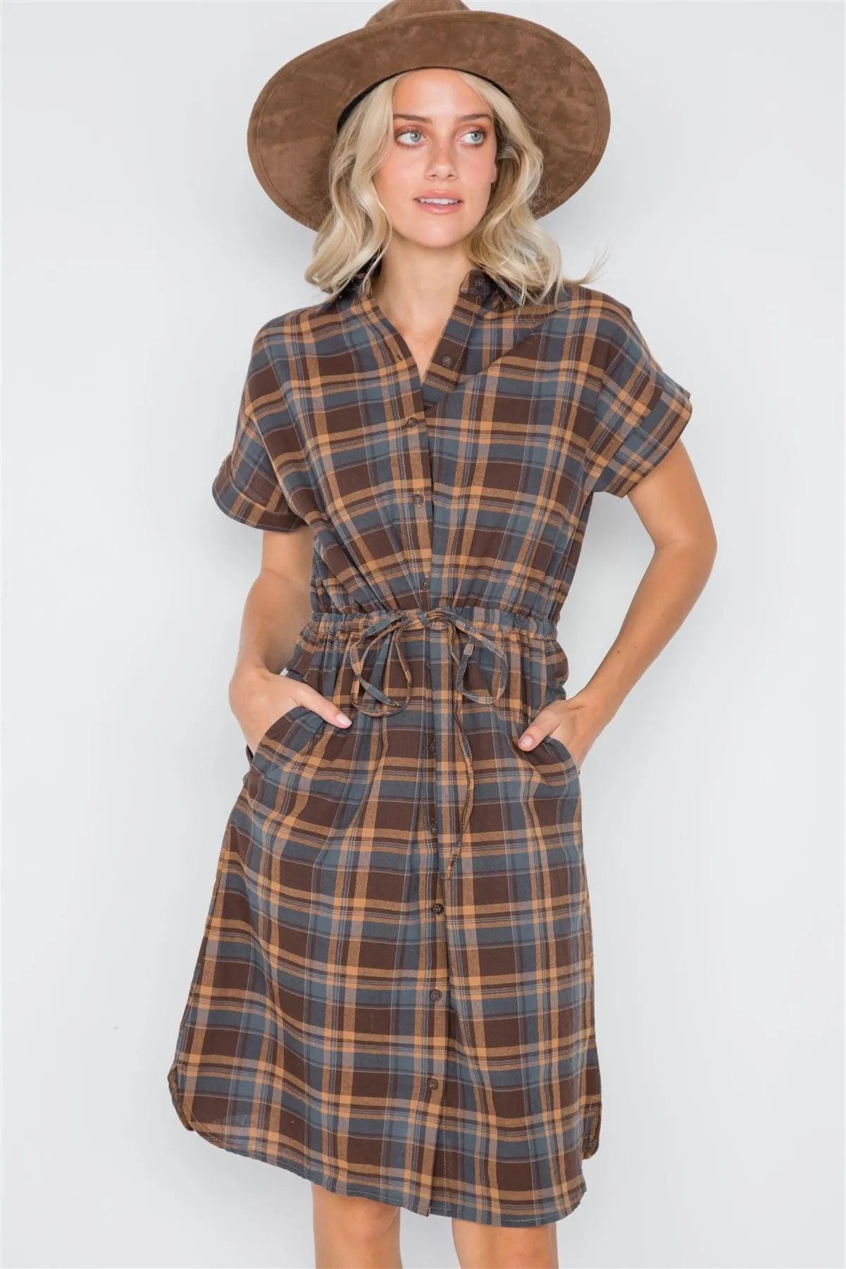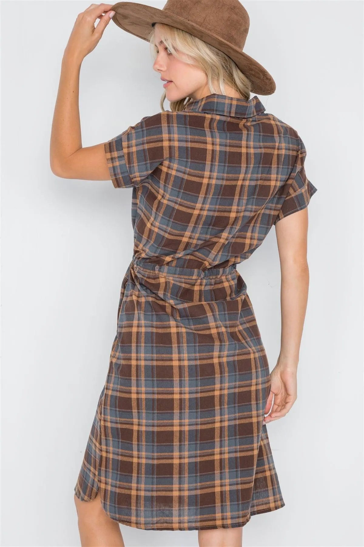 Multi Blue Plaid Short Sleeve Button Down Dress /2-2-2
